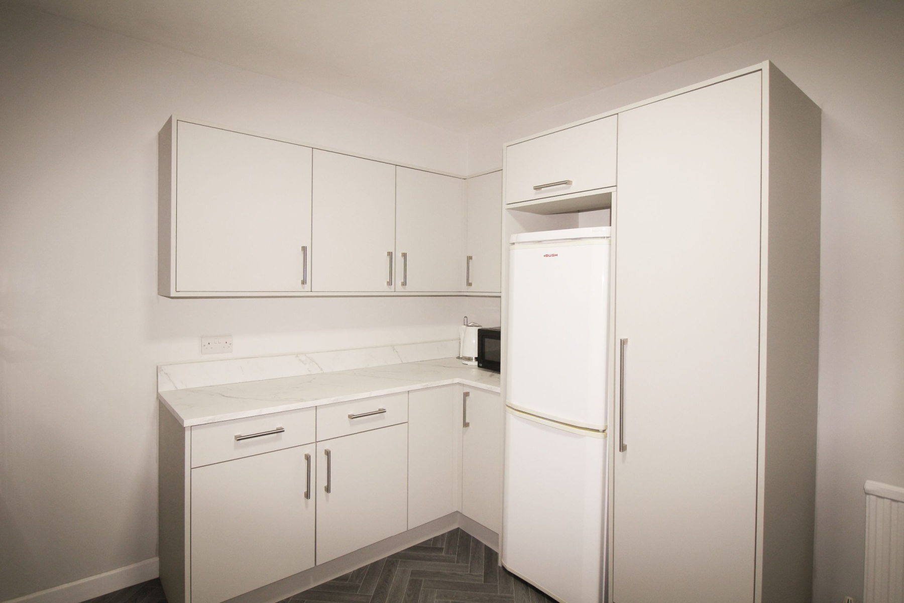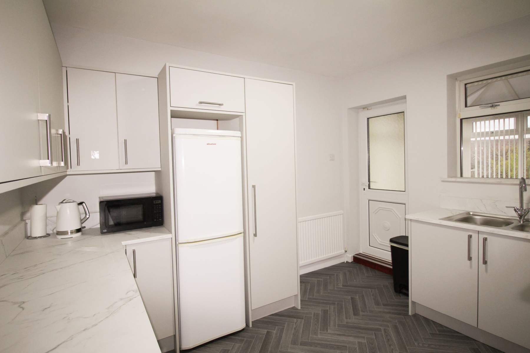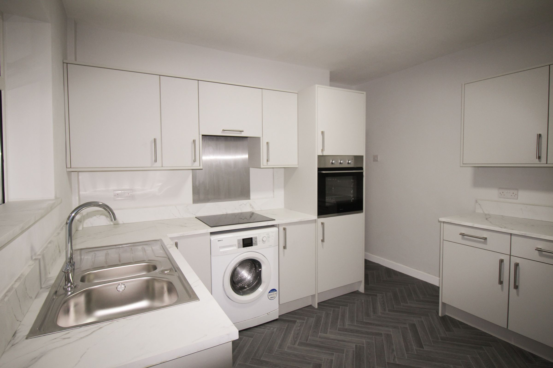 A modern kitchen with a fresh, clean feel, complete with a brand-new electric oven and hob. The space is well equipped, offering a washing machine and fridge freezer for added convenience. Marble-effect worktops pair beautifully with the modern flooring and neutral décor, creating a stylish and functional cooking environment.