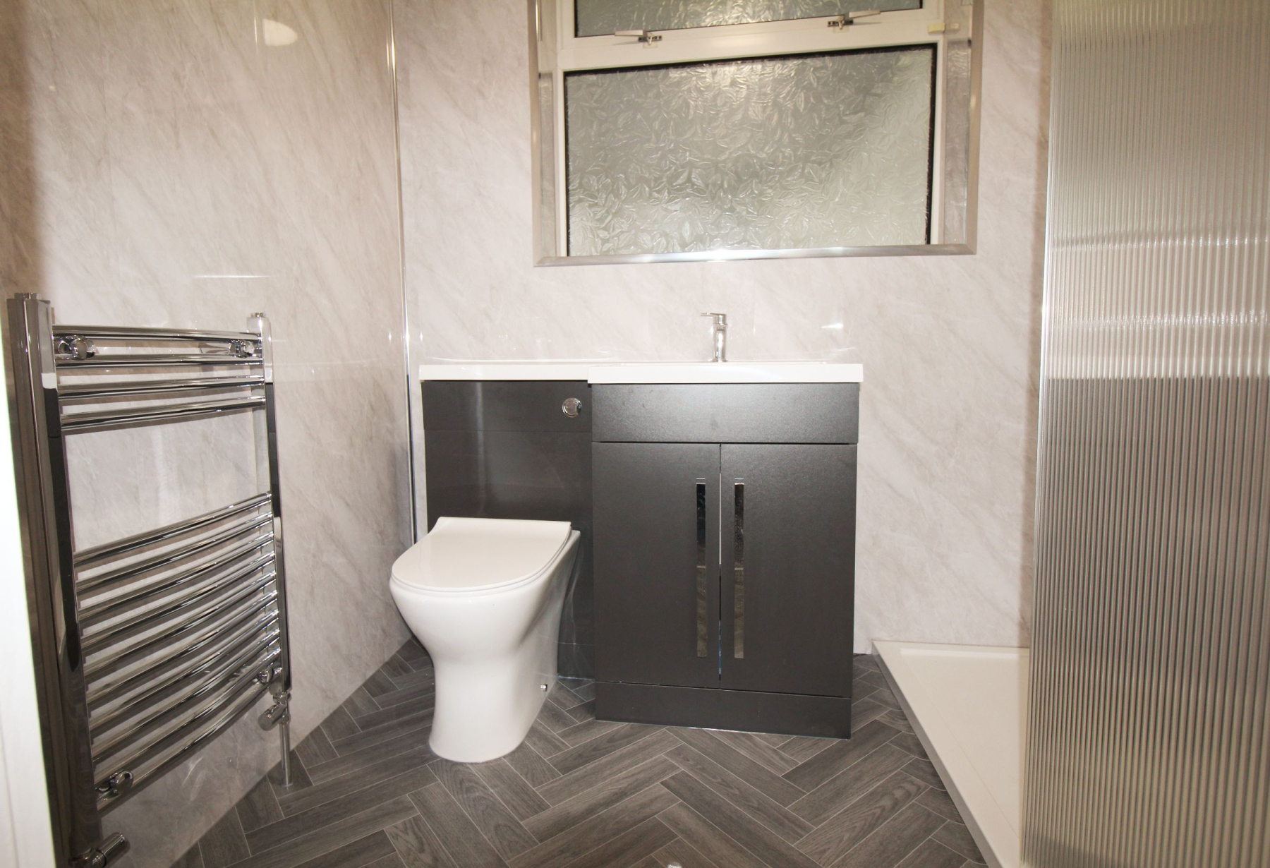 A modern bathroom featuring a sink and toilet set within a sleek unit, aqua-panelled walls, and a chrome heated towel rail. The walk-in double shower and contemporary flooring complete this stylish and functional space.