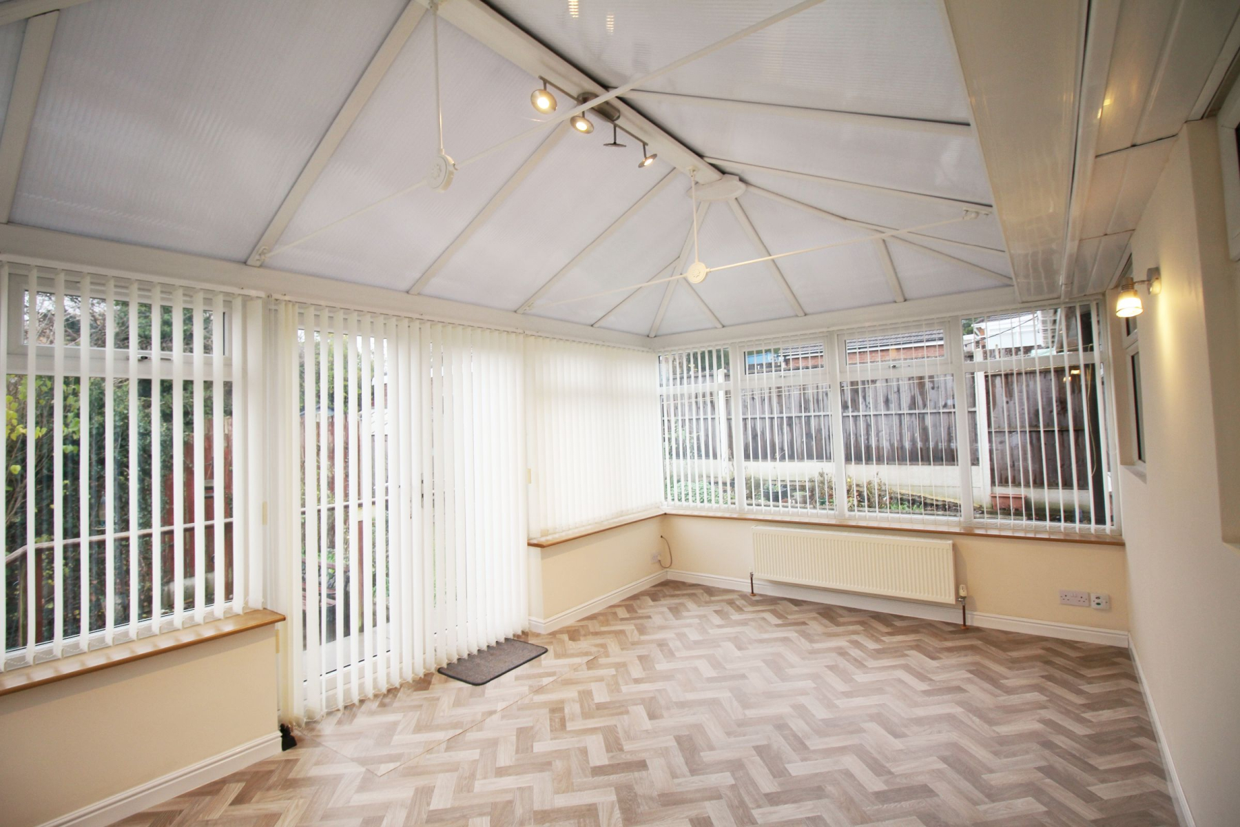 A generously sized conservatory leading directly from the kitchen, offering wonderful views of the private rear garden. This bright and versatile space is ideal for dining or entertaining, featuring beautiful fitted blinds and modern flooring that enhances the contemporary feel.