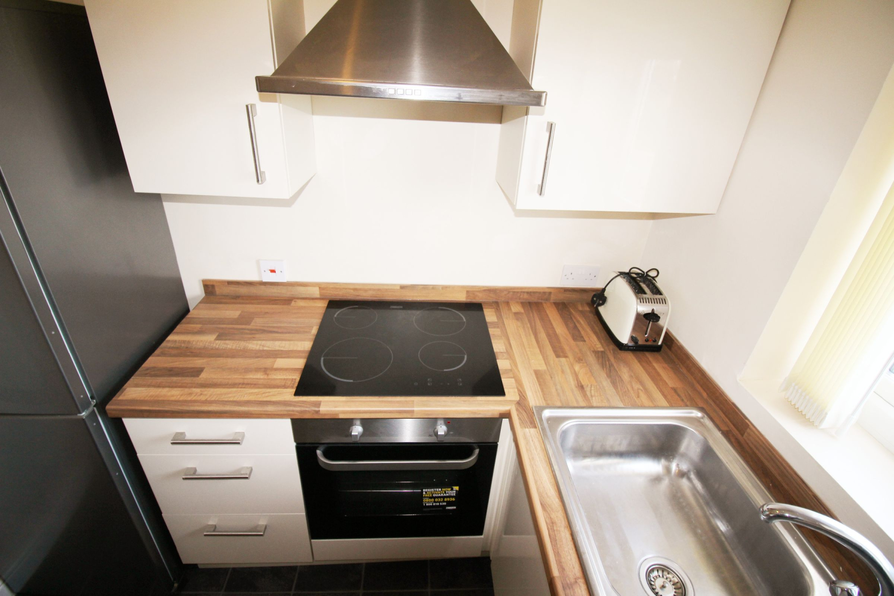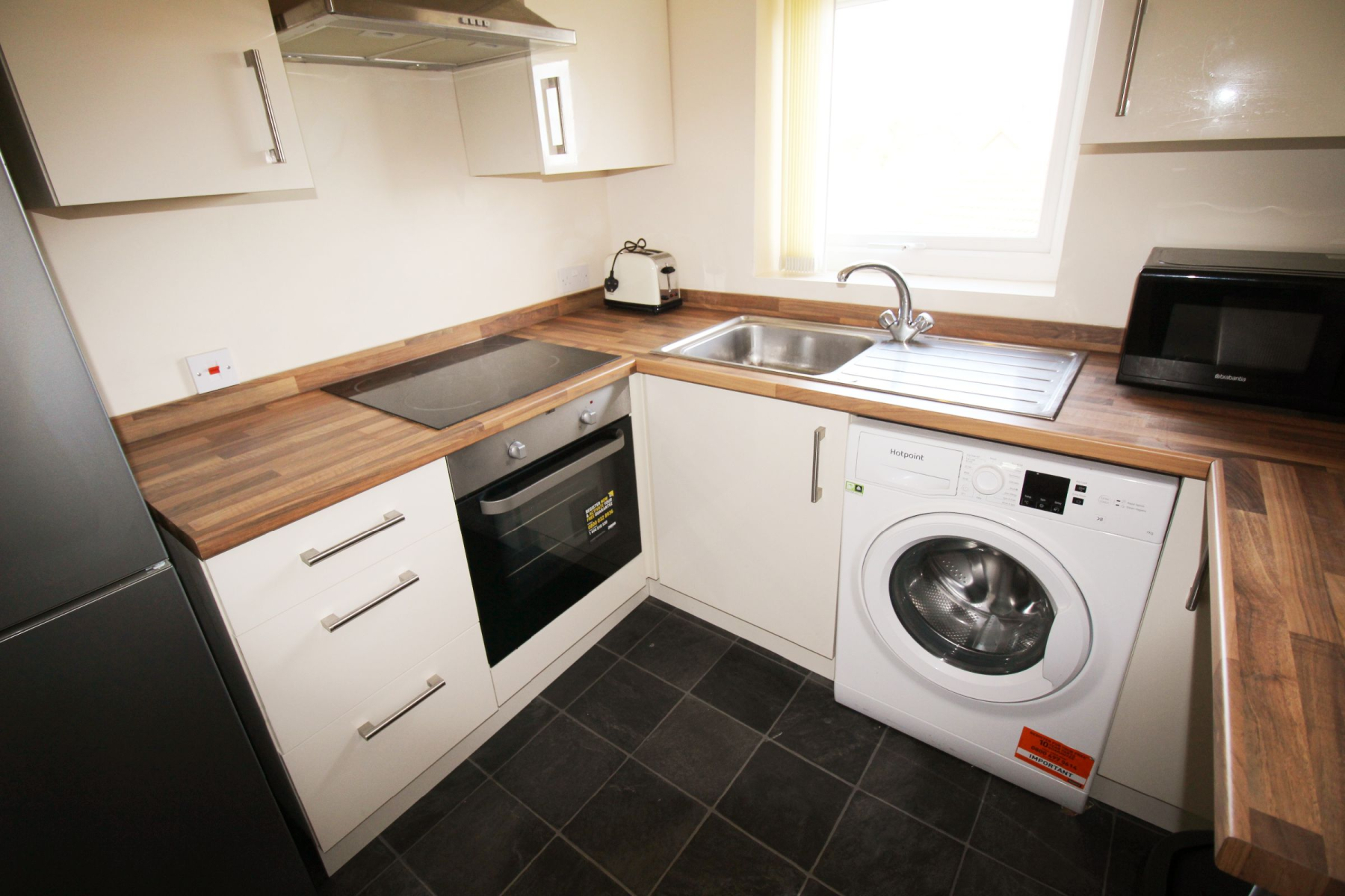 Stylishly appointed with cream gloss wall and base units, this well-equipped kitchen offers both practicality and contemporary appeal. Grey flooring adds a sleek finish while ensuring durability for everyday use. The kitchen comes complete with a washing machine, free-standing fridge freezer, oven, hob, and extractor, providing everything needed for convenient modern living.