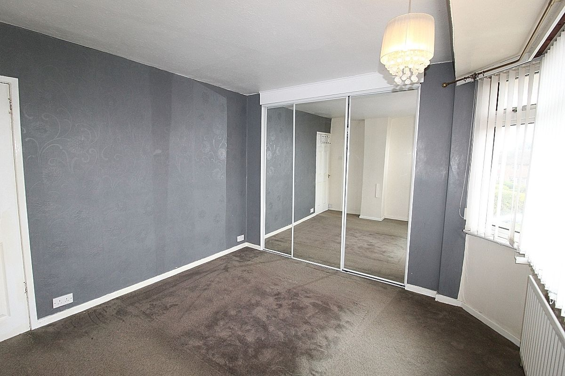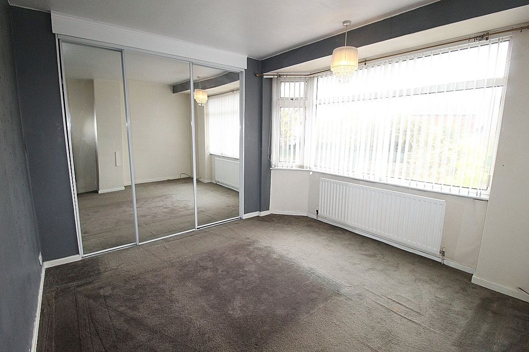 A double bedroom with carpeted flooring, radiator and a front facing upvc bay window creating a light and warm master bedroom and a large range of fitted sliding wardrobes.