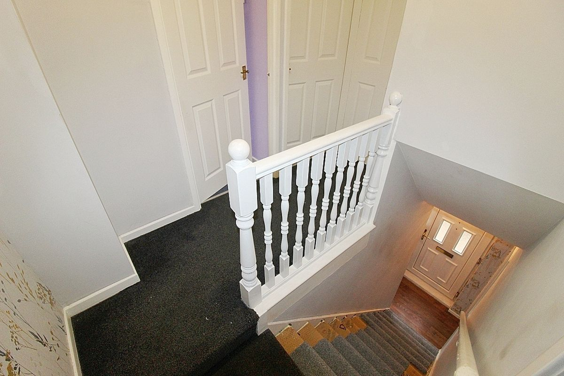 A carpeted landing with loft hatch and doors giving access to three bedrooms and family bathroom.