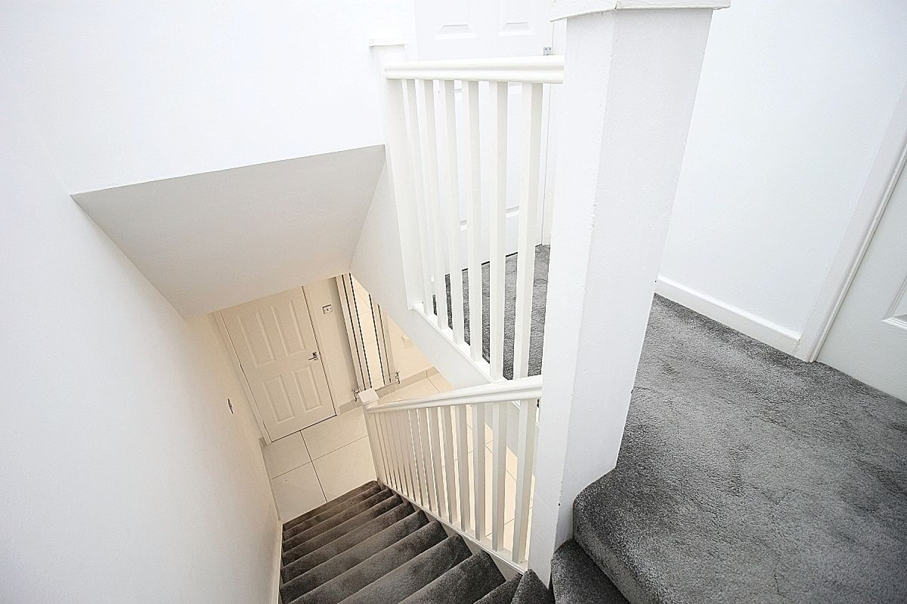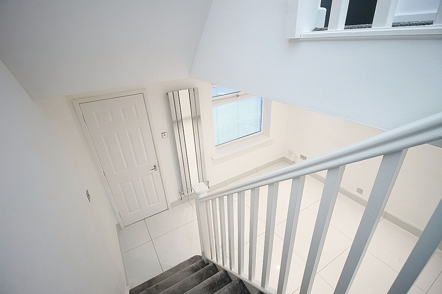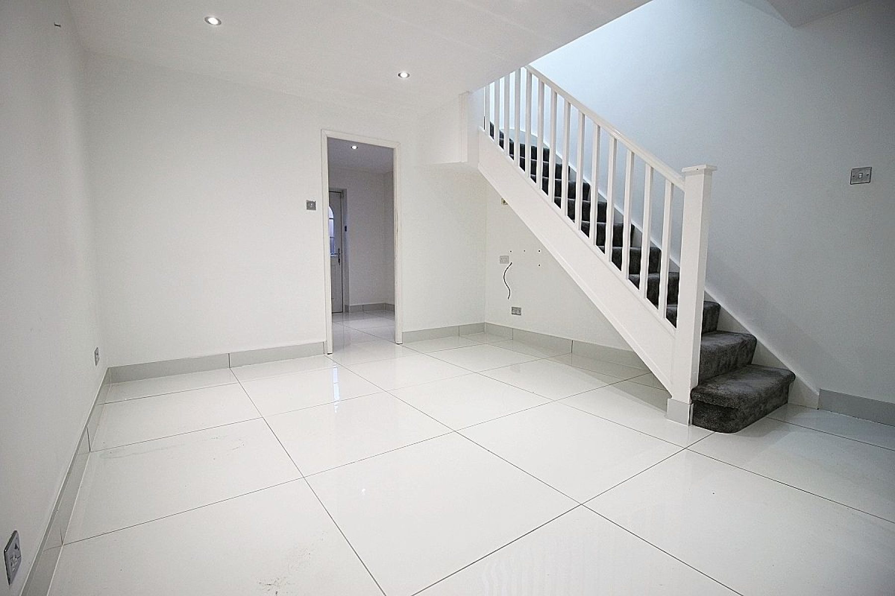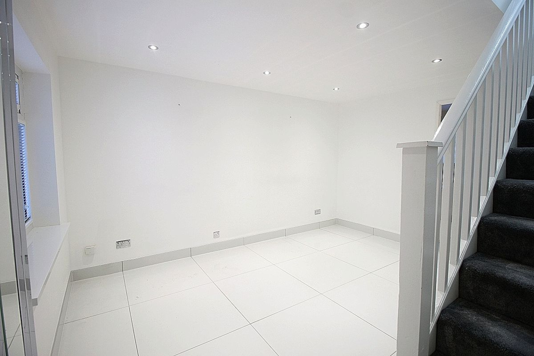 A beautiful living area with a continuation of the tiled flooring leading to carpeted spindled stairs leading to the first floor accommodation, a front facing upvc window allows an abundance of light along with spot lighting, a designer radiator adds warmth and an opening to the kitchen/ diner.