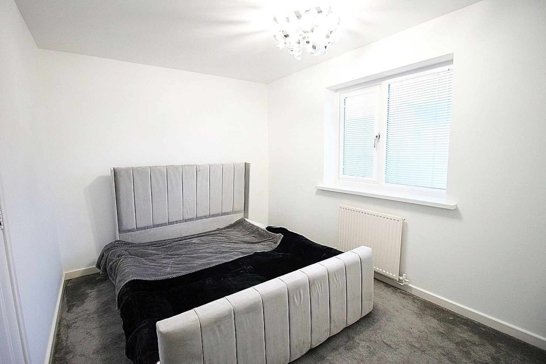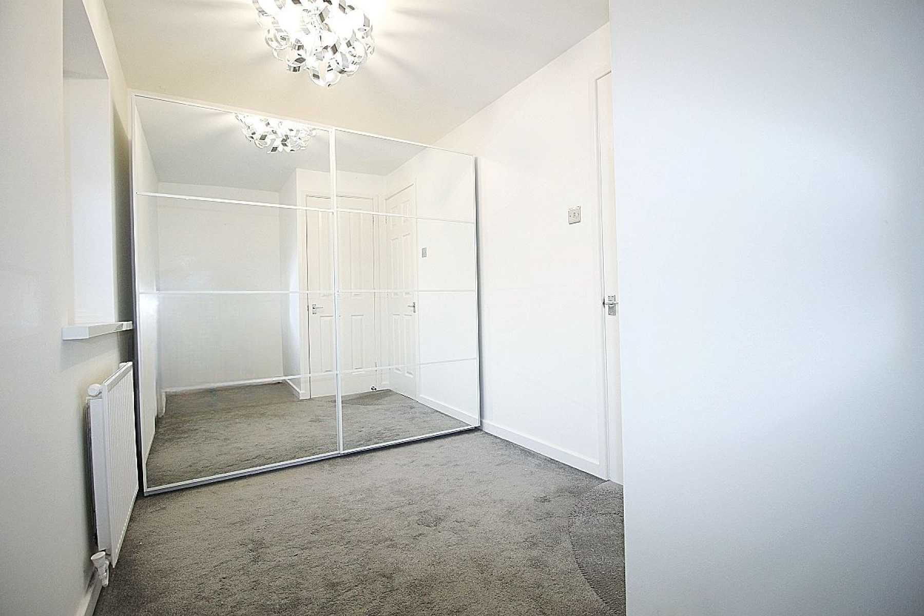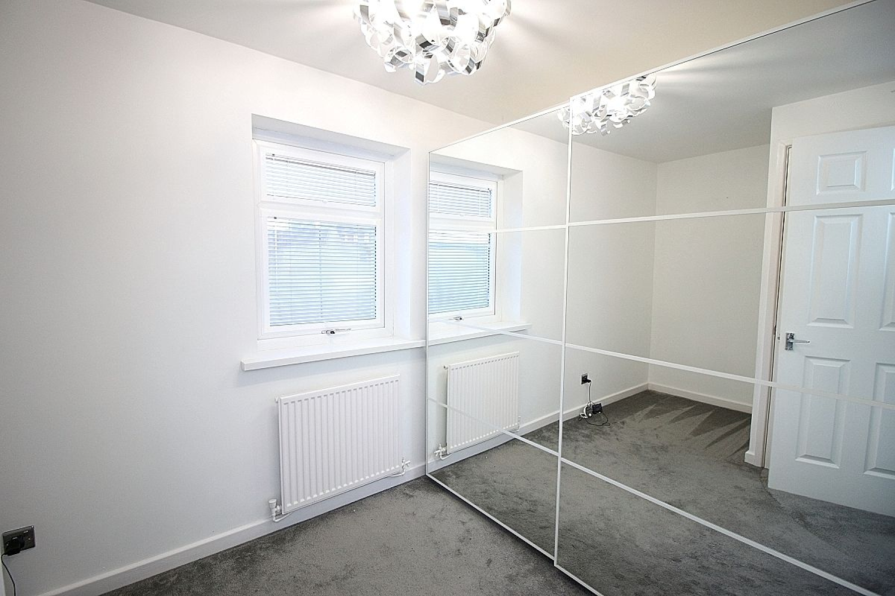 An ample sized second bedroom with a range of modern mirrored sliding wardrobes, a further built in wardrobe, a front facing upvc window, radiator and carpeted flooring.
