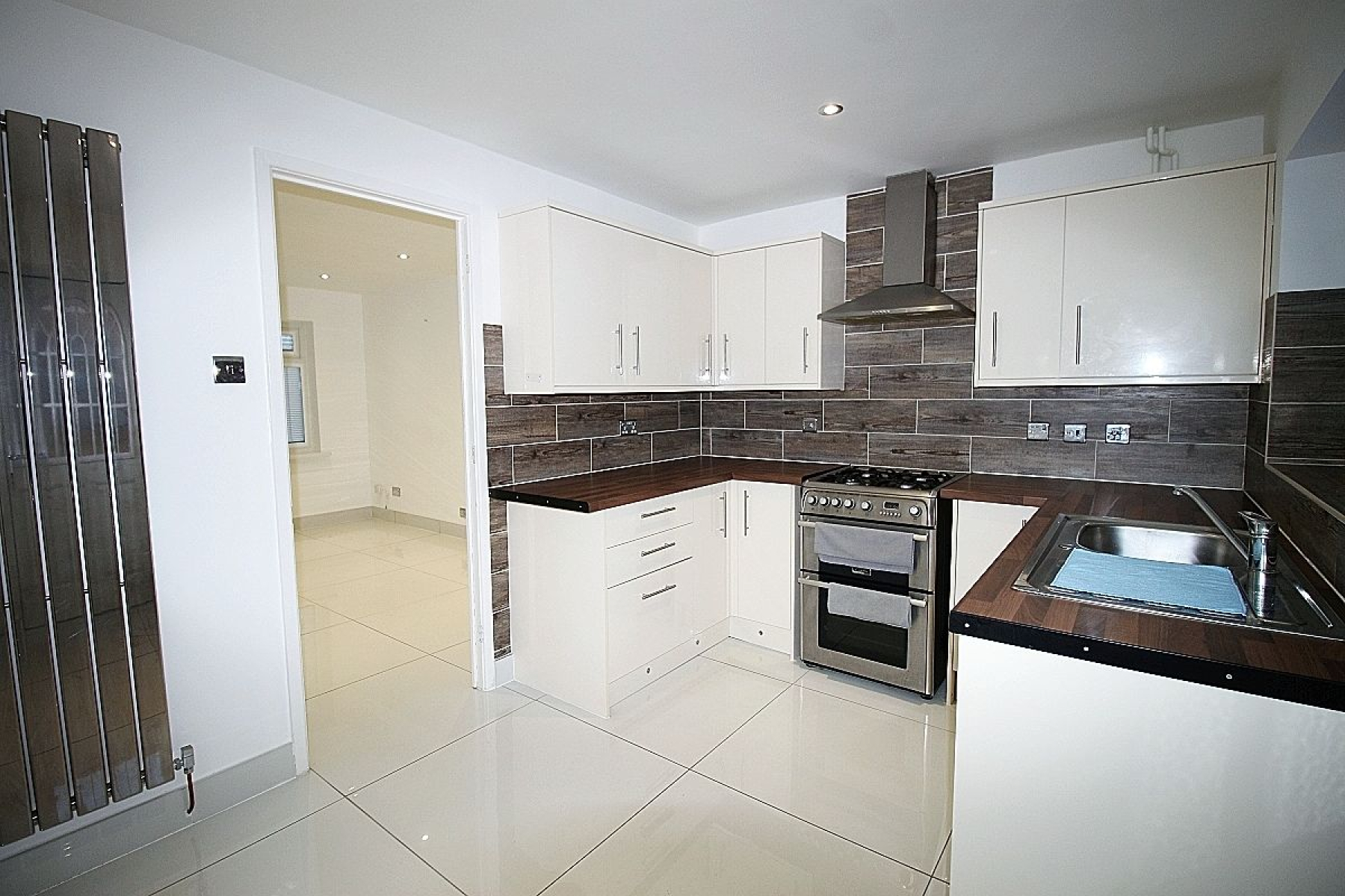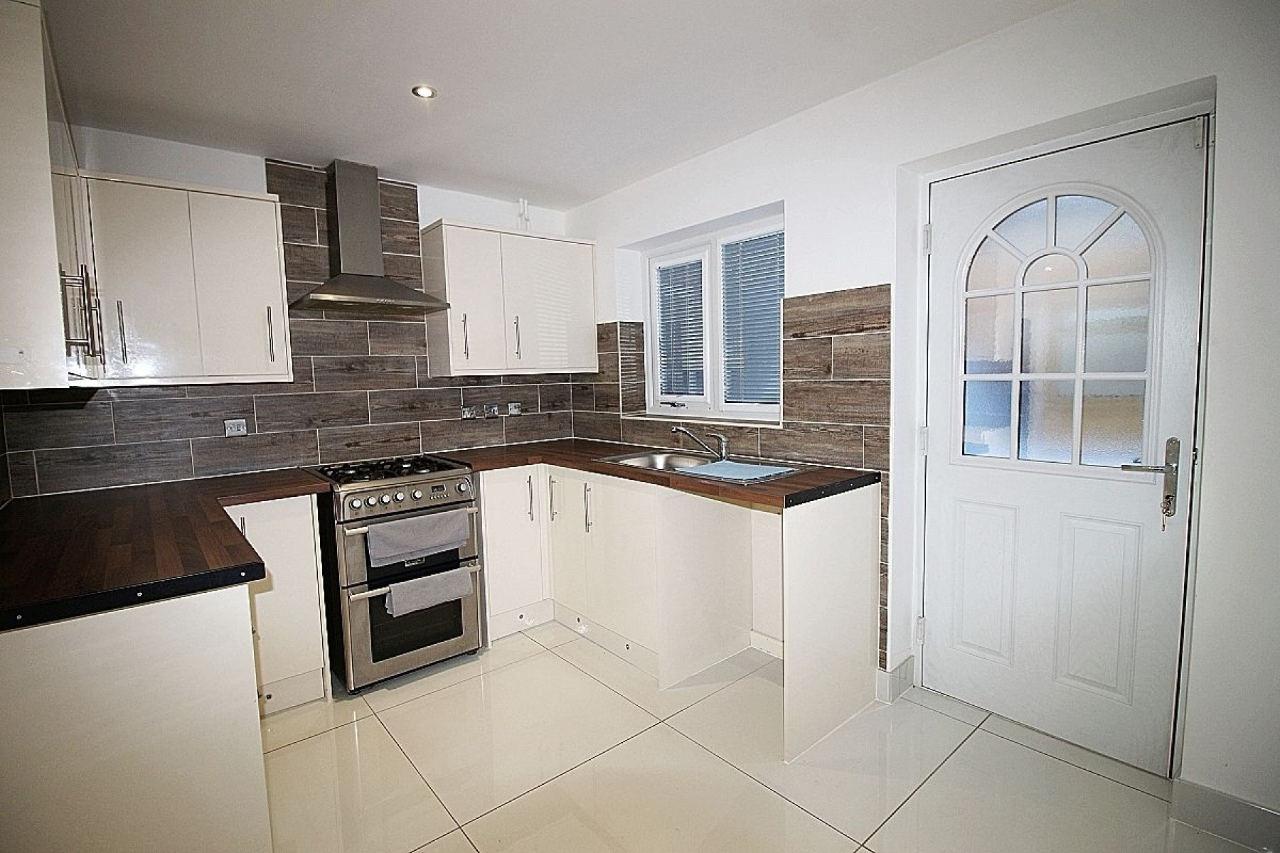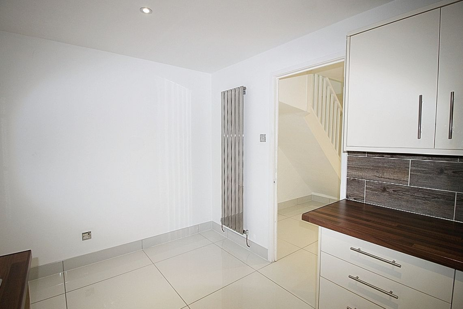 A modern fully fitted kitchen with a range of wall and base units, complimentary work surface areas, a counter top sink and stylish tiled back panels. Appliances to include an inset oven, extractor fan and plumbing for further utilities. A rear facing upvc window along with a glazed composite door opening to the garden illuminates whilst spot lighting creates the mood, a continuation of the tiled flooring seamlessly flows throughout and a designer radiator adds warmth.