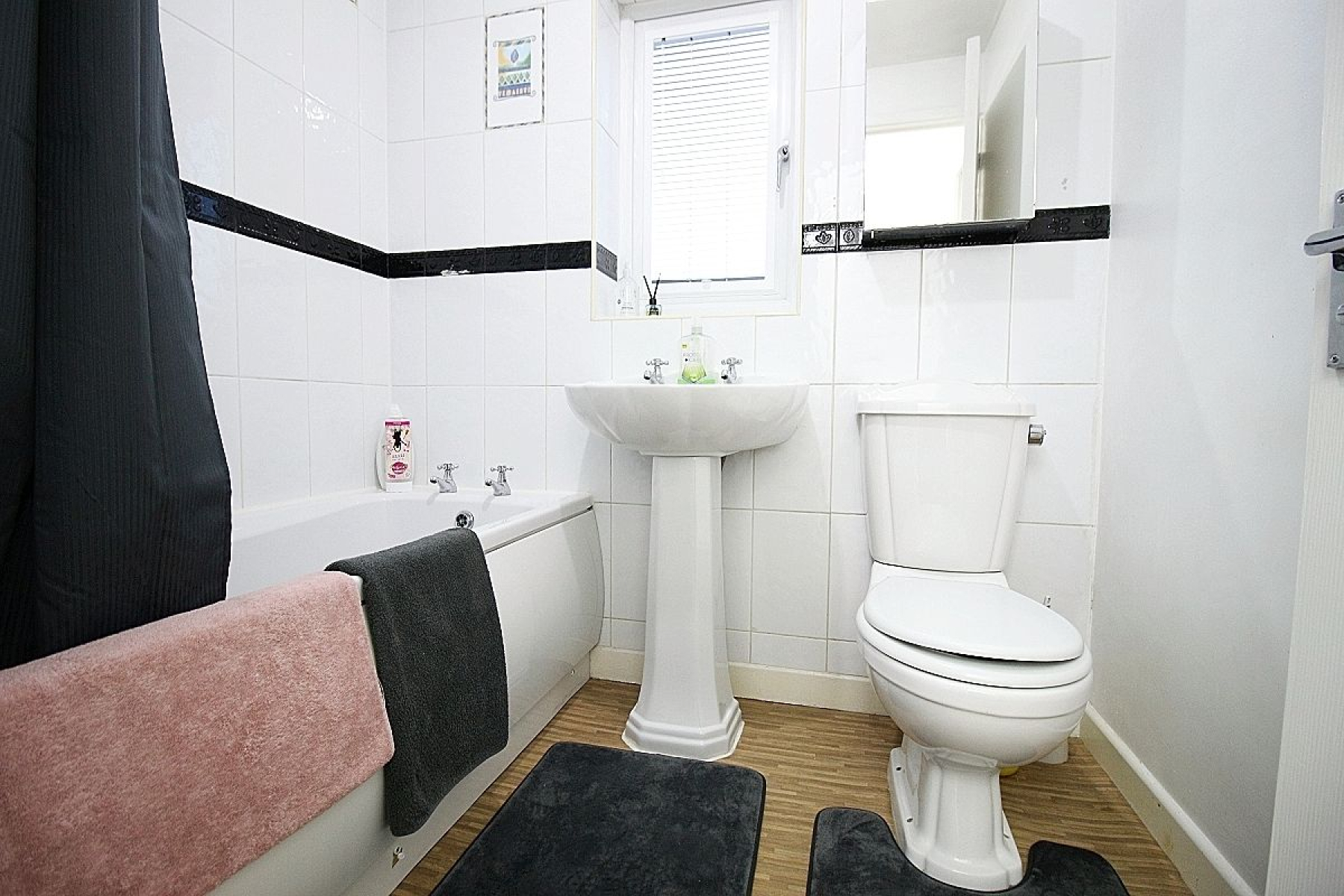 A modern bathroom comprising of a paneled bath with over head shower, wash hand basin and a low level wc. Side facing upvc window, radiator, partially tiled walls with feature tiling and complimentary vinyl flooring.