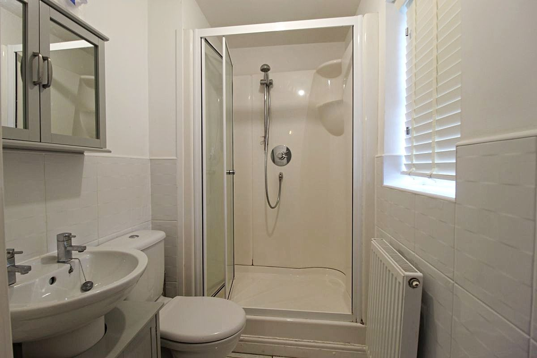 Modern en-suite with a double shower cubicle and bifold glass screen, WC, and wash basin. PVC cladding in the shower area, partial tiled walls, tiled flooring, radiator, and rear-facing window.