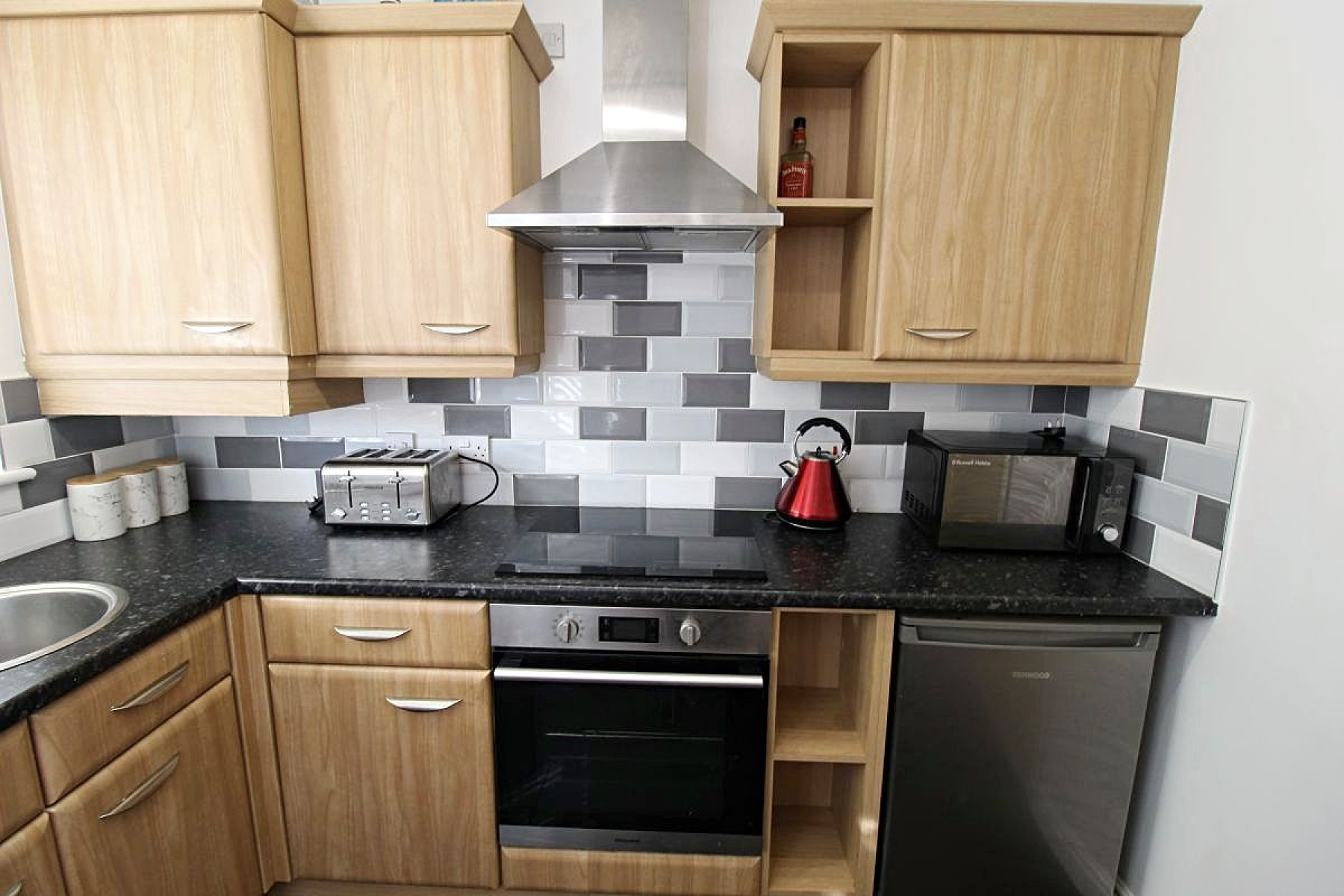 Fitted with a range of wall and base units, complementary worktops, and tiled splash backs. Integrated electric oven, induction hob with extractor, and washing machine. Tiled flooring, radiator and side-facing window. Space for additional appliances.