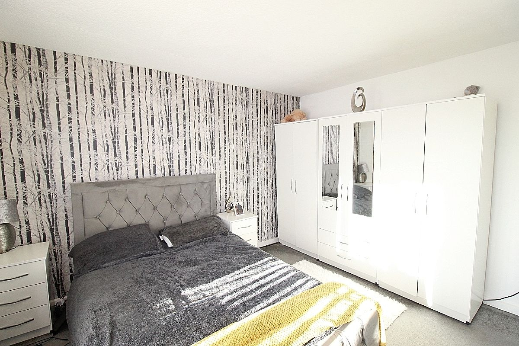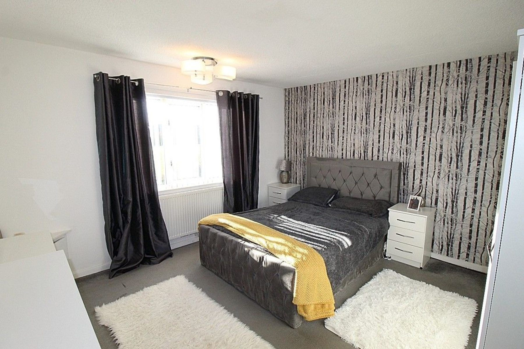 Bedroom 1 w: 4m x l: 3.7m (w: 13' 1" x l: 12' 2") A double bedroom with feature wall, carpeted flooring, radiator and a upvc window.