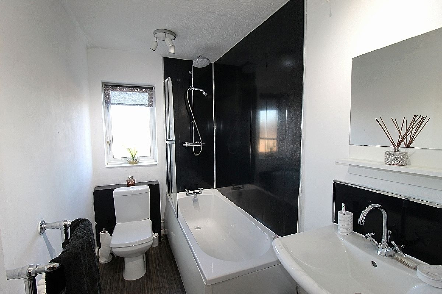 Bathroom w: 1.6m x l: 2.9m (w: 5' 3" x l: 9' 6") A modern bathroom comprising of a paneled bath with overhead shower, decorative back panels and screen, wash hand basin and low level wc, designer heated towel rail, vinyl flooring and a upvc window.