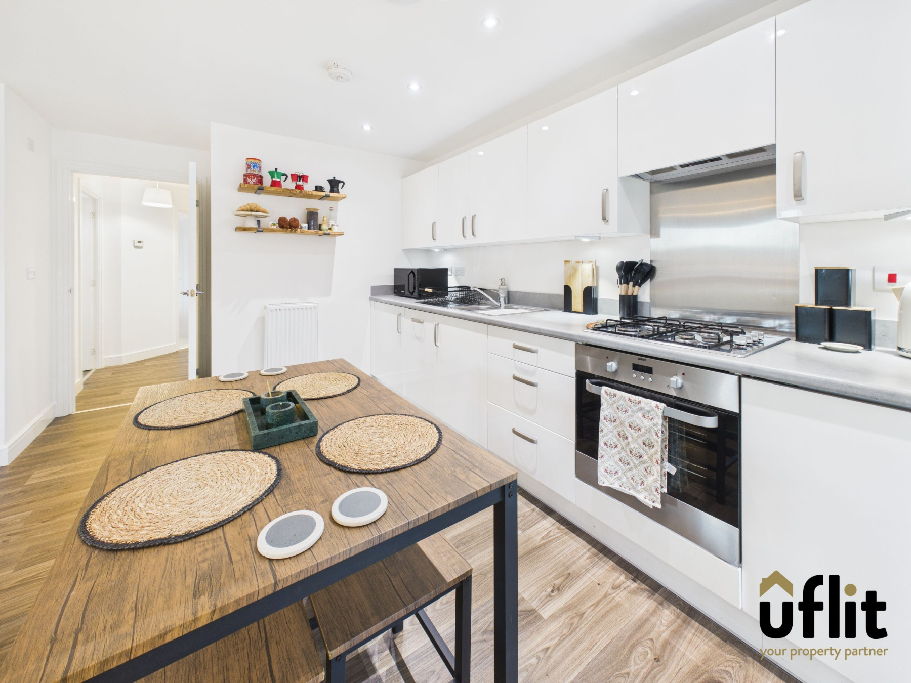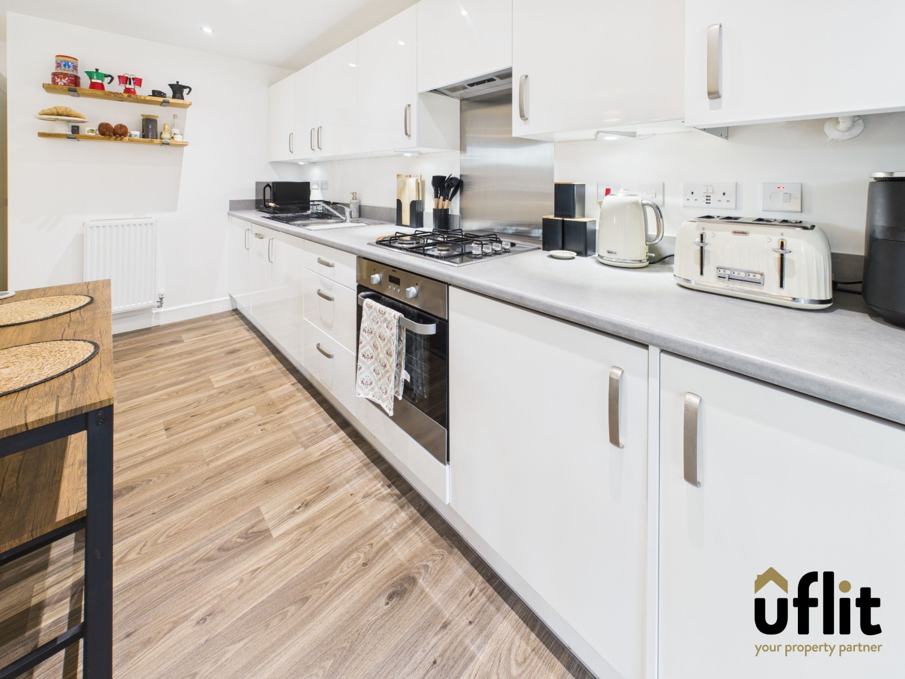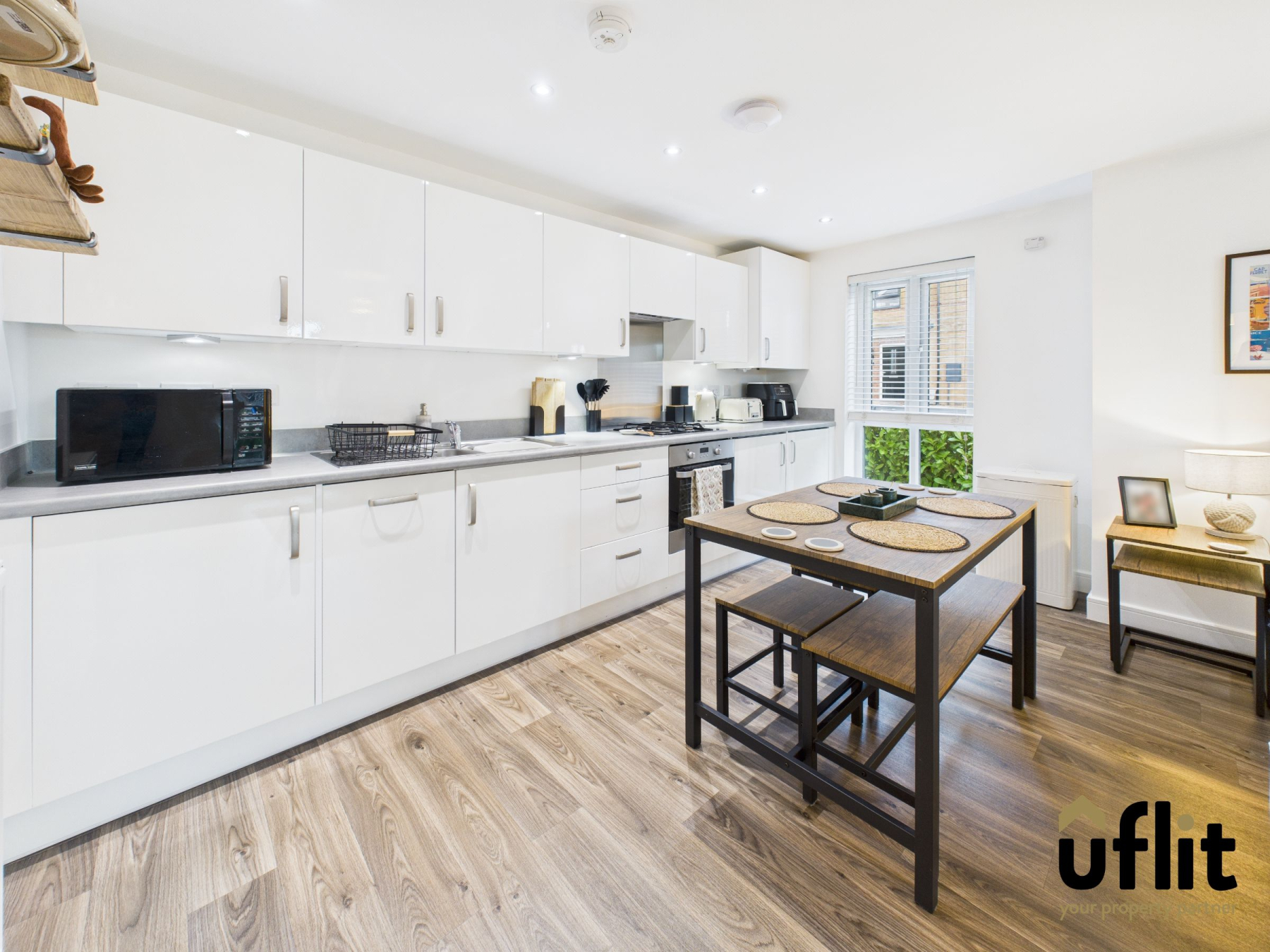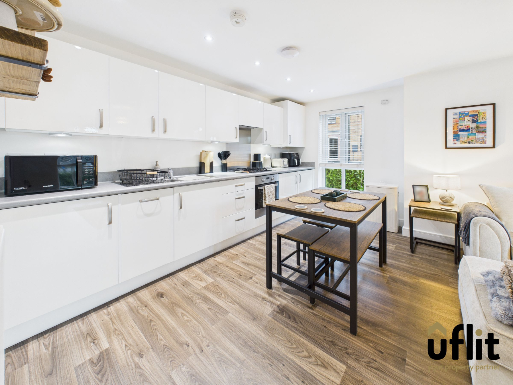 The open-plan kitchen, dining and lounge area is a spacious and contemporary living space, finished with wood-effect vinyl flooring throughout. The kitchen is well equipped with a range of integrated appliances including a washer/dryer, dishwasher, fridge, freezer, electric oven and gas hob with extractor hood and integrated lighting. Additional features include under-cupboard lighting and ceiling spotlights, enhancing both functionality and ambience. A radiator provides warmth, while a long, low-level window to the side of the property allows natural light to flow through the room, creating a bright and inviting environment ideal for modern living and entertaining.