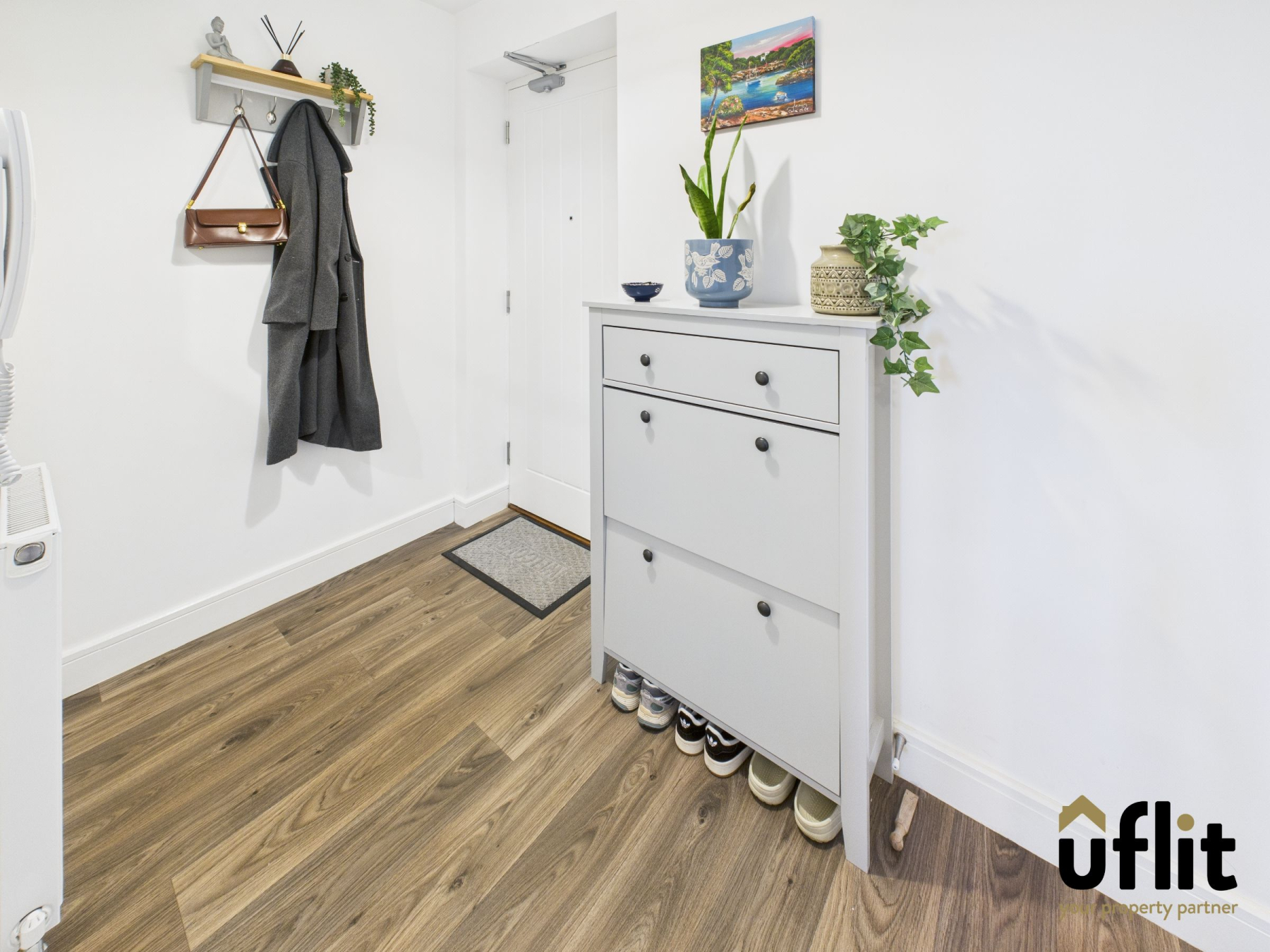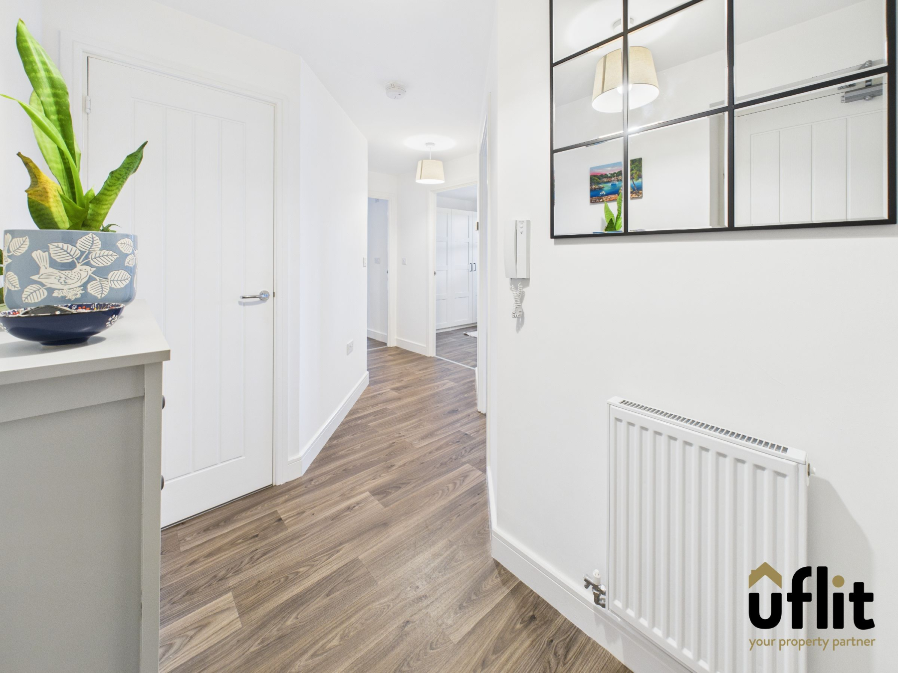 The spacious and inviting hallway features vinyl wood-effect flooring, a radiator and a large storage cupboard, along with a secure intercom entry system for visitor access. Doors provide access to all rooms within the apartment.