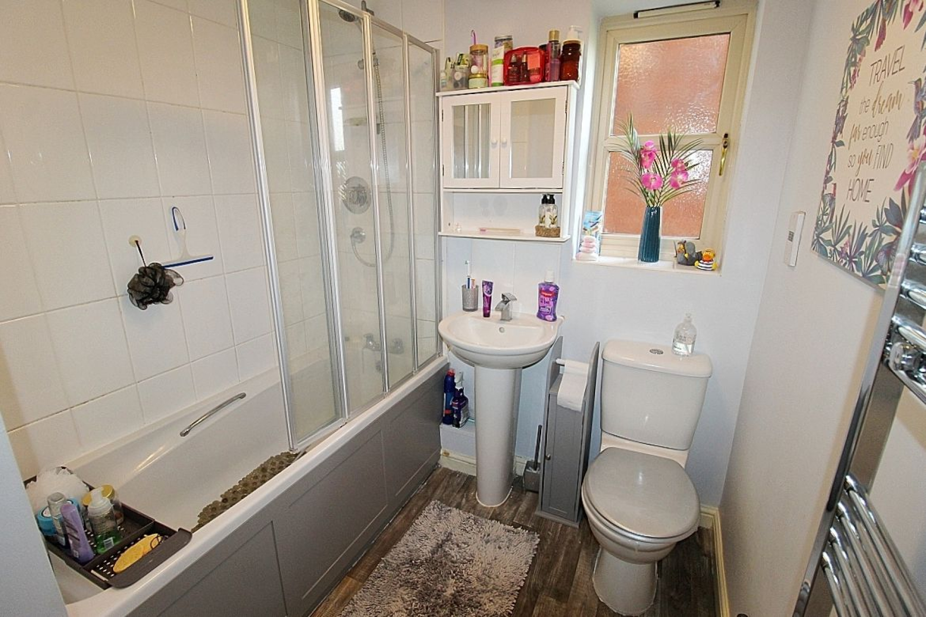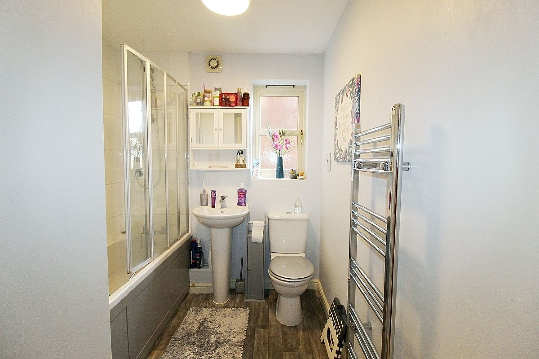 Bathroom w: 2.2m x l: 2m (w: 7' 3" x l: 6' 7") A modern bathroom comprising of a paneled bath with overhead shower and screen, wash hand basin and low level wc. Partially tiled walls with contrasting vinyl flooring, a wall mounted heated towel rail and a upvc window.