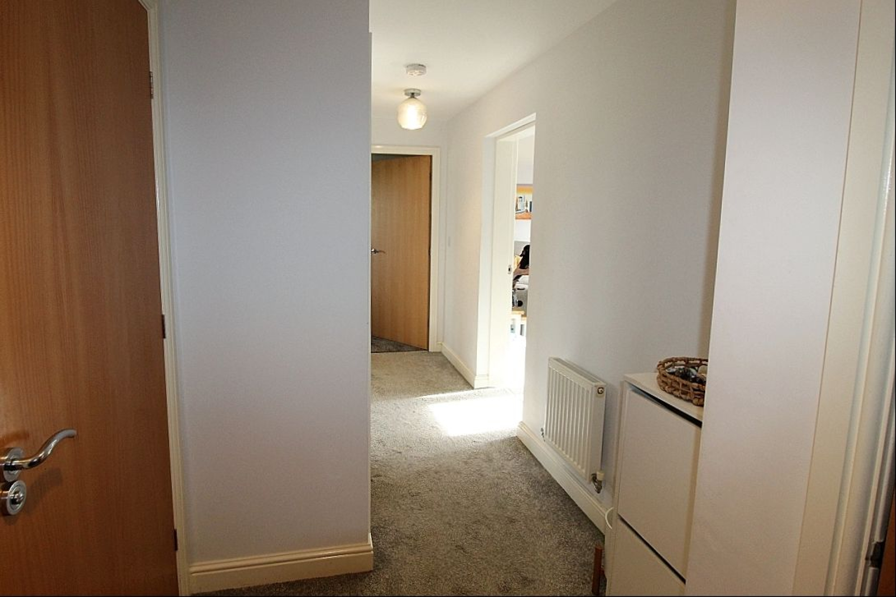 Hallway A solid wood fire door opens into the corridor hallway with carpet and radiator. Doors giving access to two bedrooms, kitchen/ lounge/diner, bathroom and two storage cupboards.