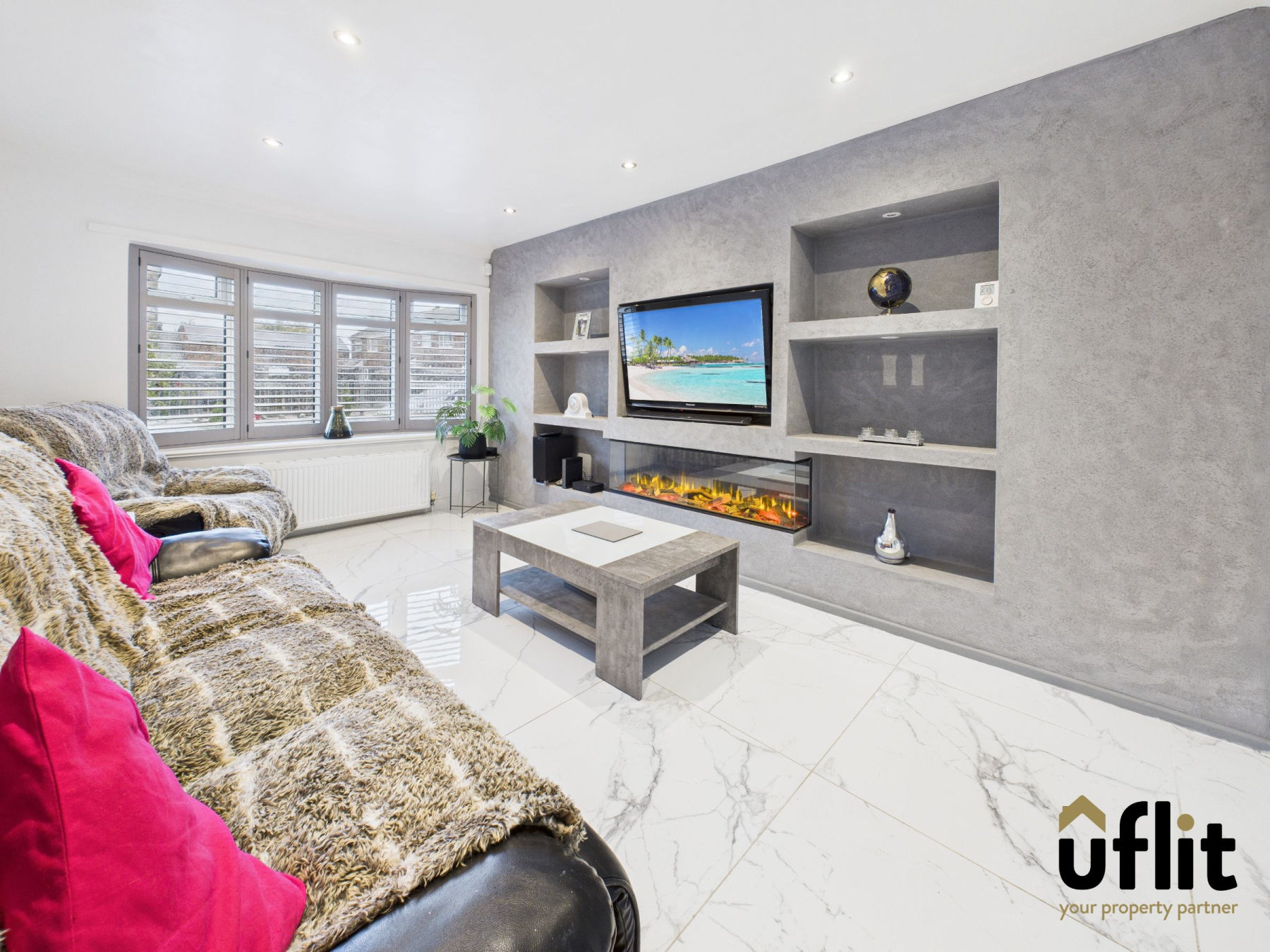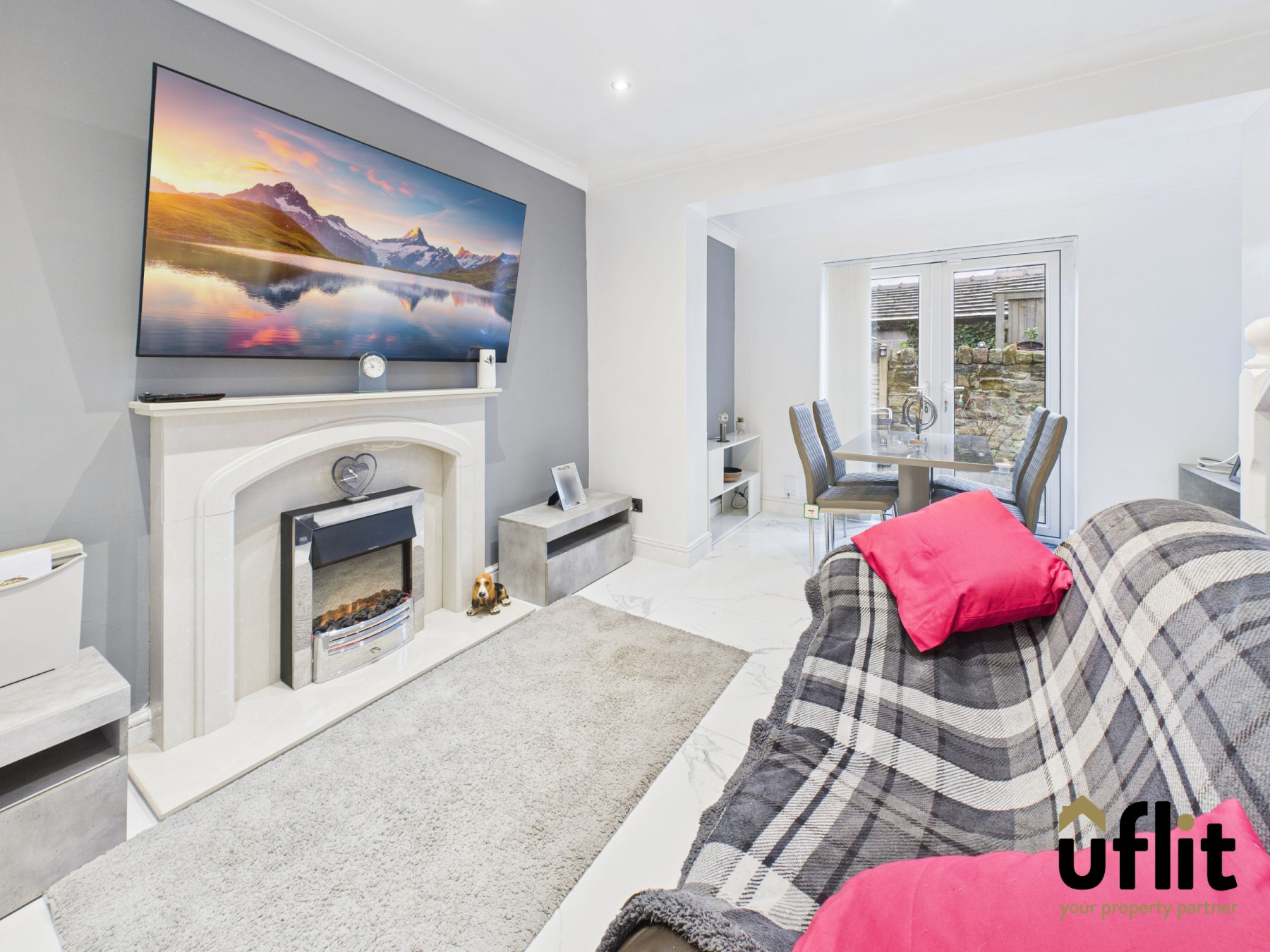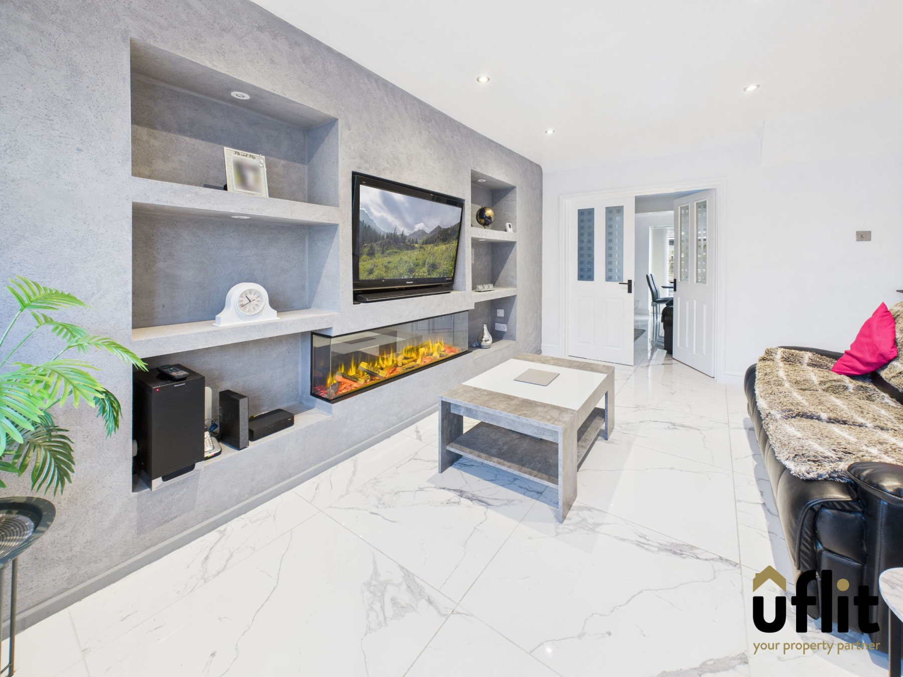 A stunning main reception room with tiled flooring and a front-facing bay window with shutter. A striking media wall with inset electric fire creates a stylish focal point and the wall-mounted TV is included in the sale. Spotlights illuminate the space and double doors lead through to the dining/snug.