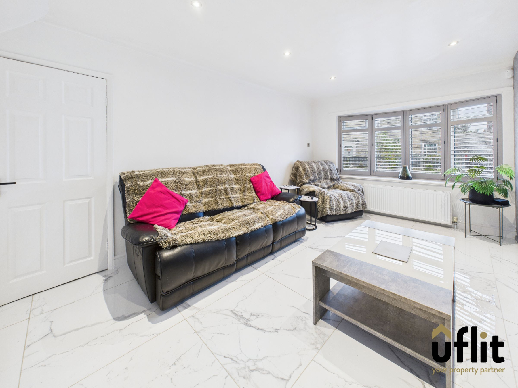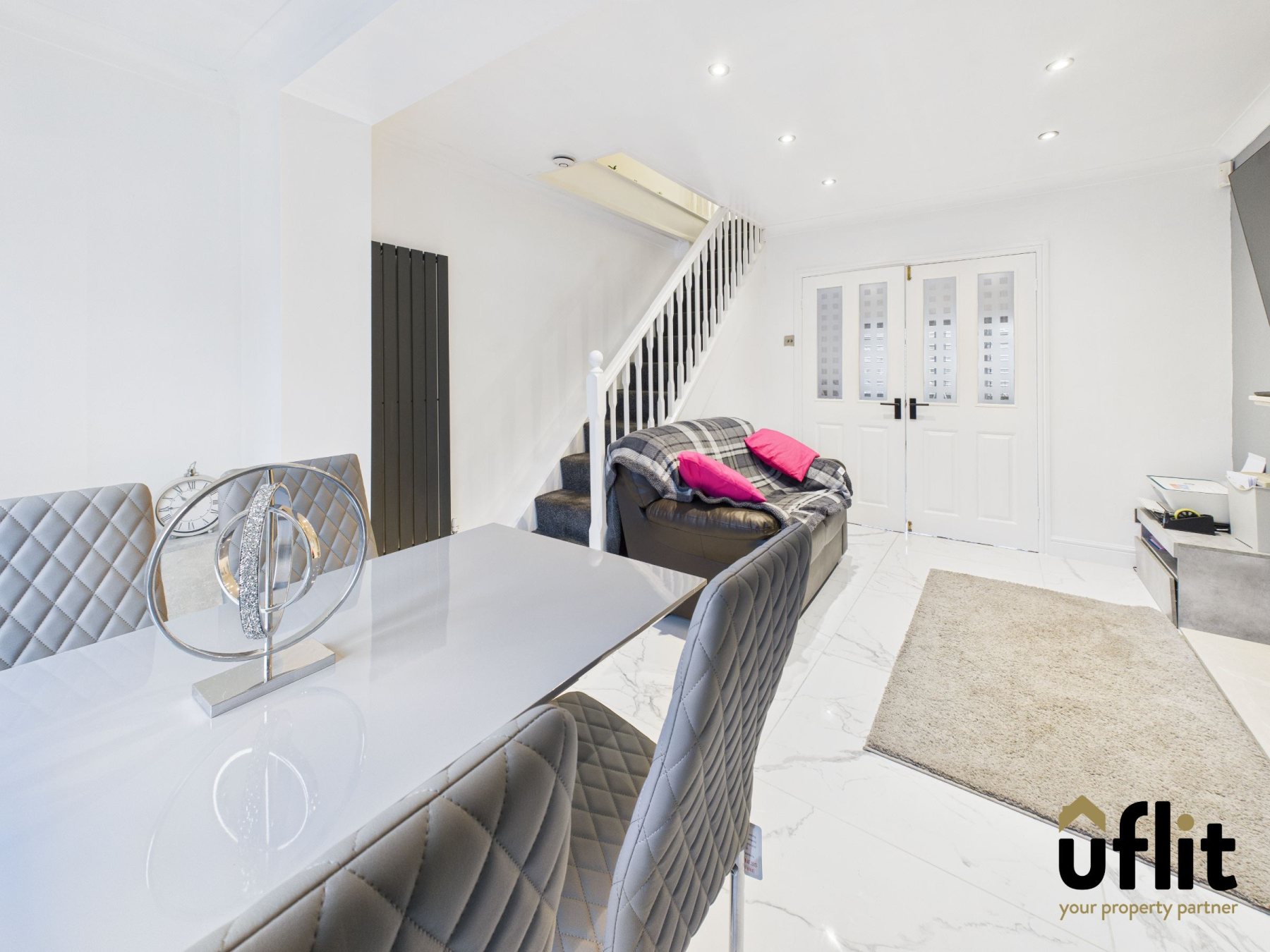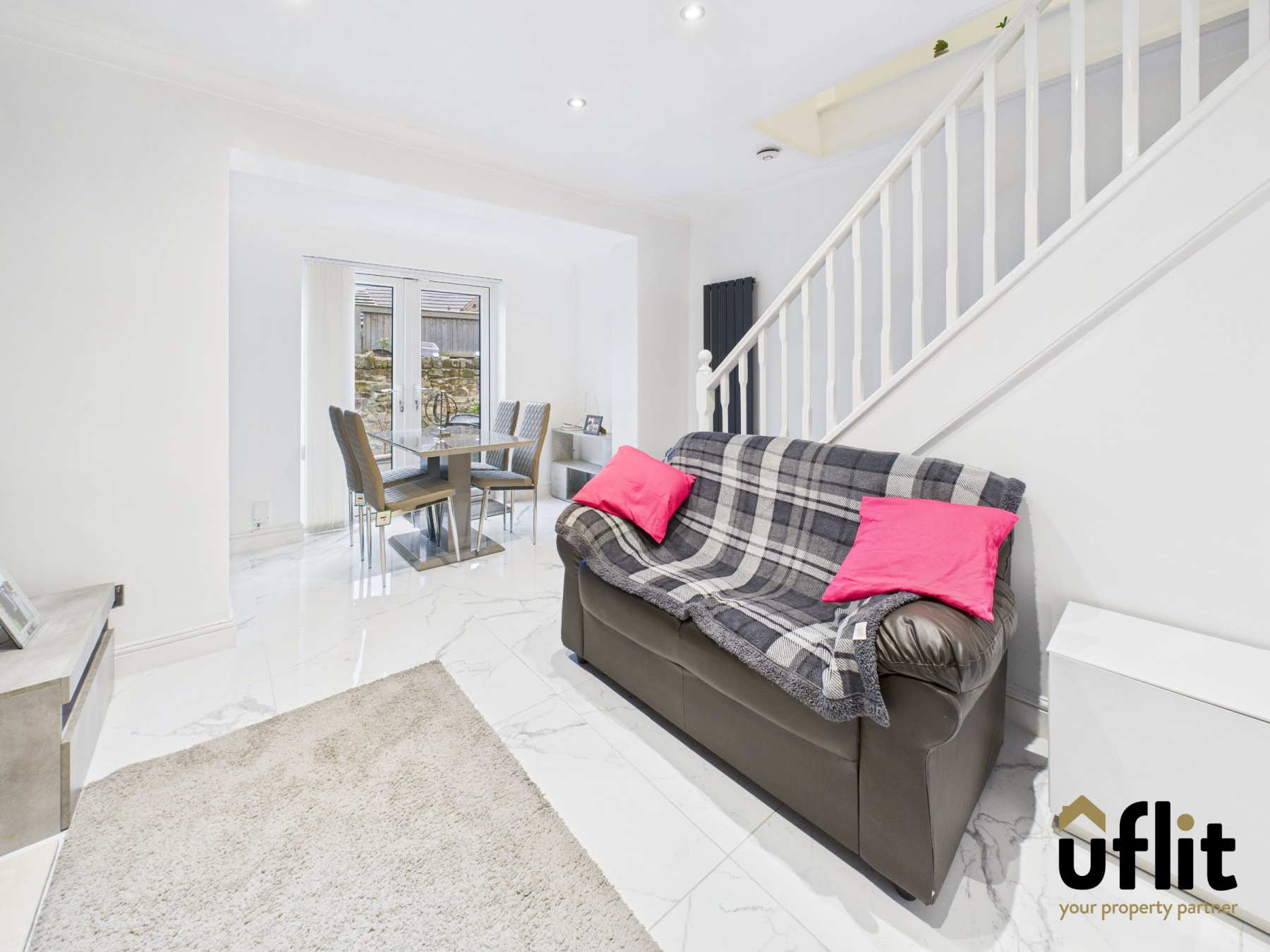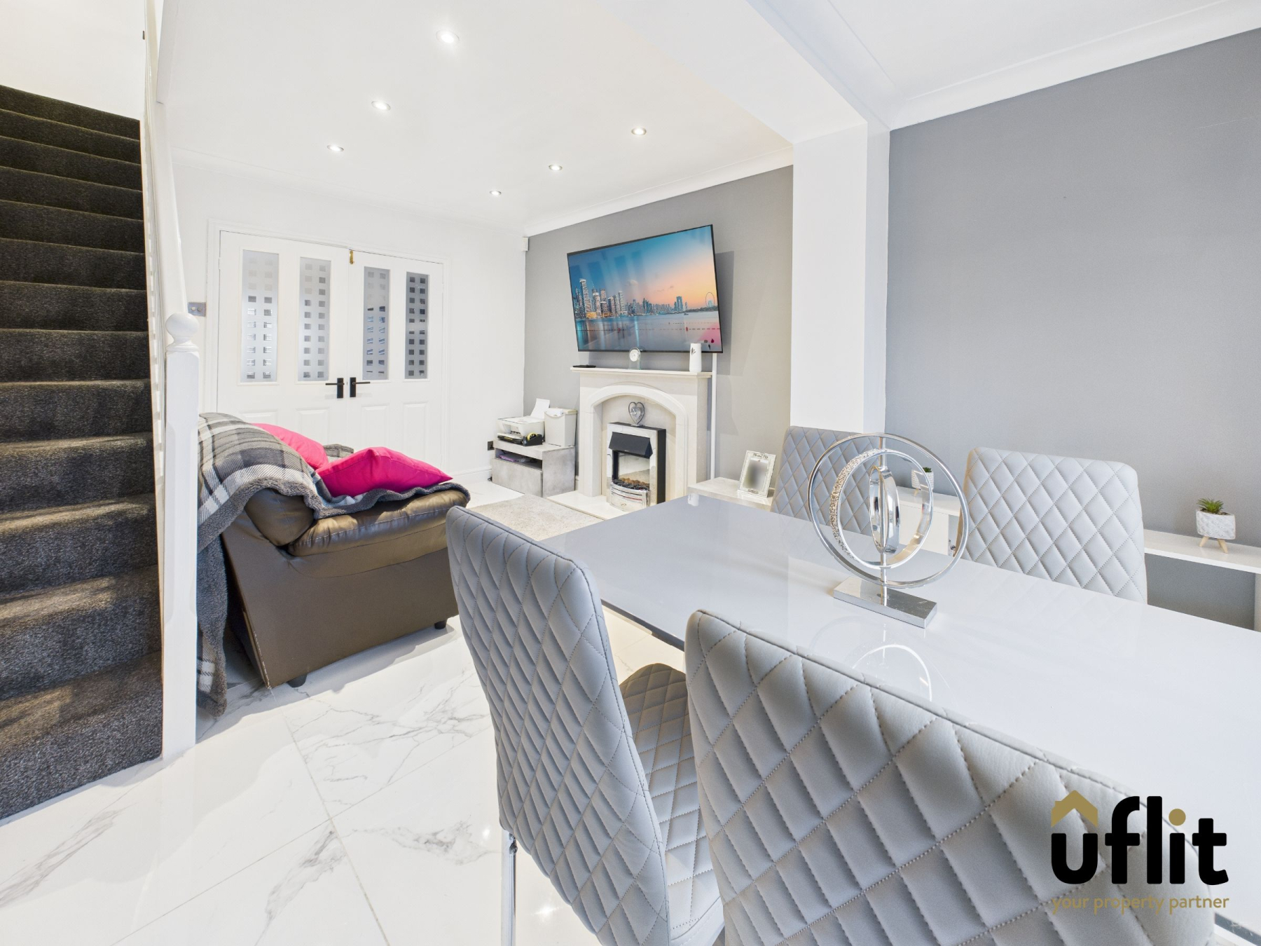 A stunning main reception room with tiled flooring and a front-facing bay window with shutter. A striking media wall with inset electric fire creates a stylish focal point and the wall-mounted TV is included in the sale. Spotlights illuminate the space and double doors lead through to the dining/snug.