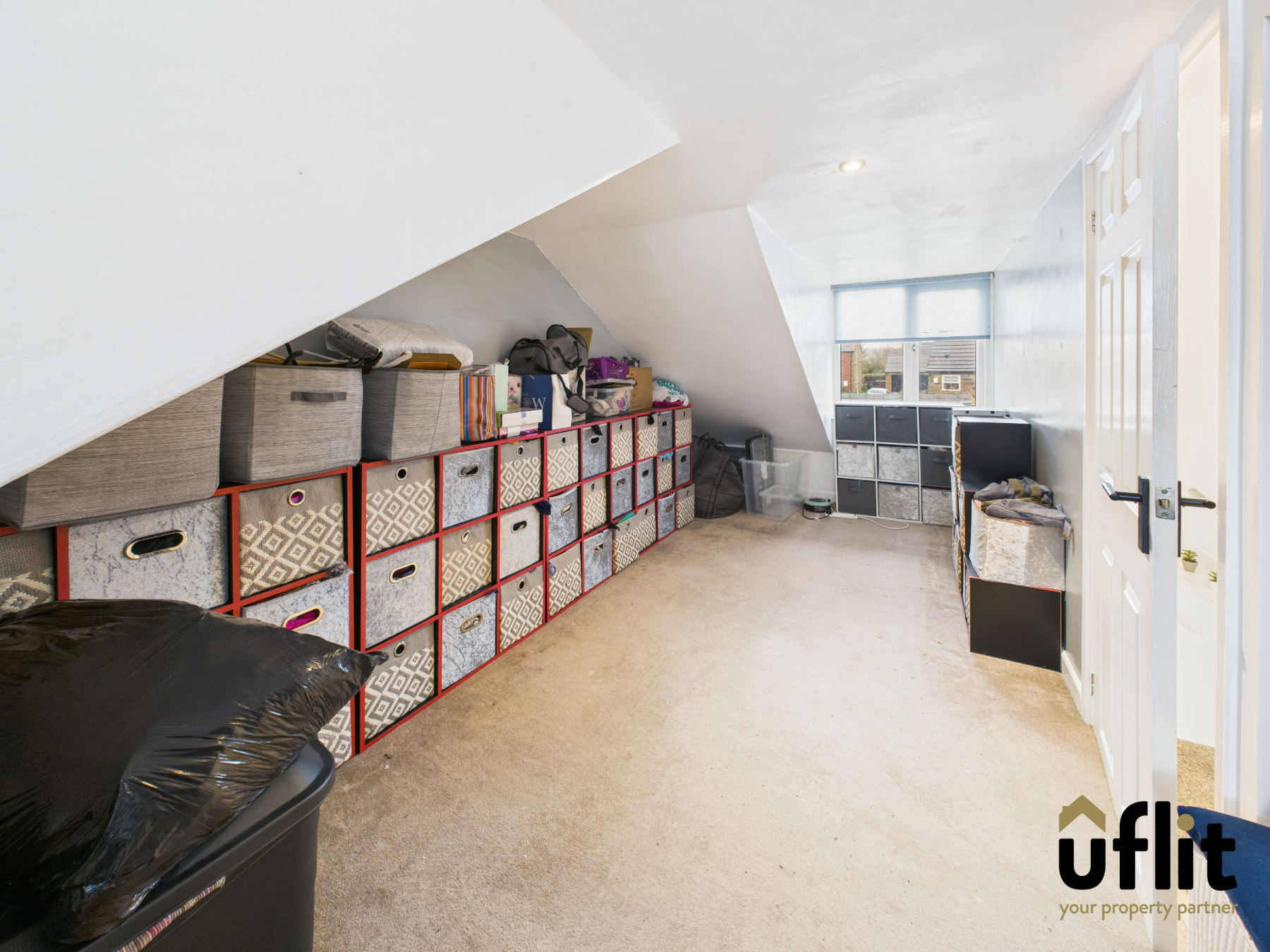 A bright double bedroom with carpet, radiator, spotlights and both front and rear facing windows, offering plenty of natural light.