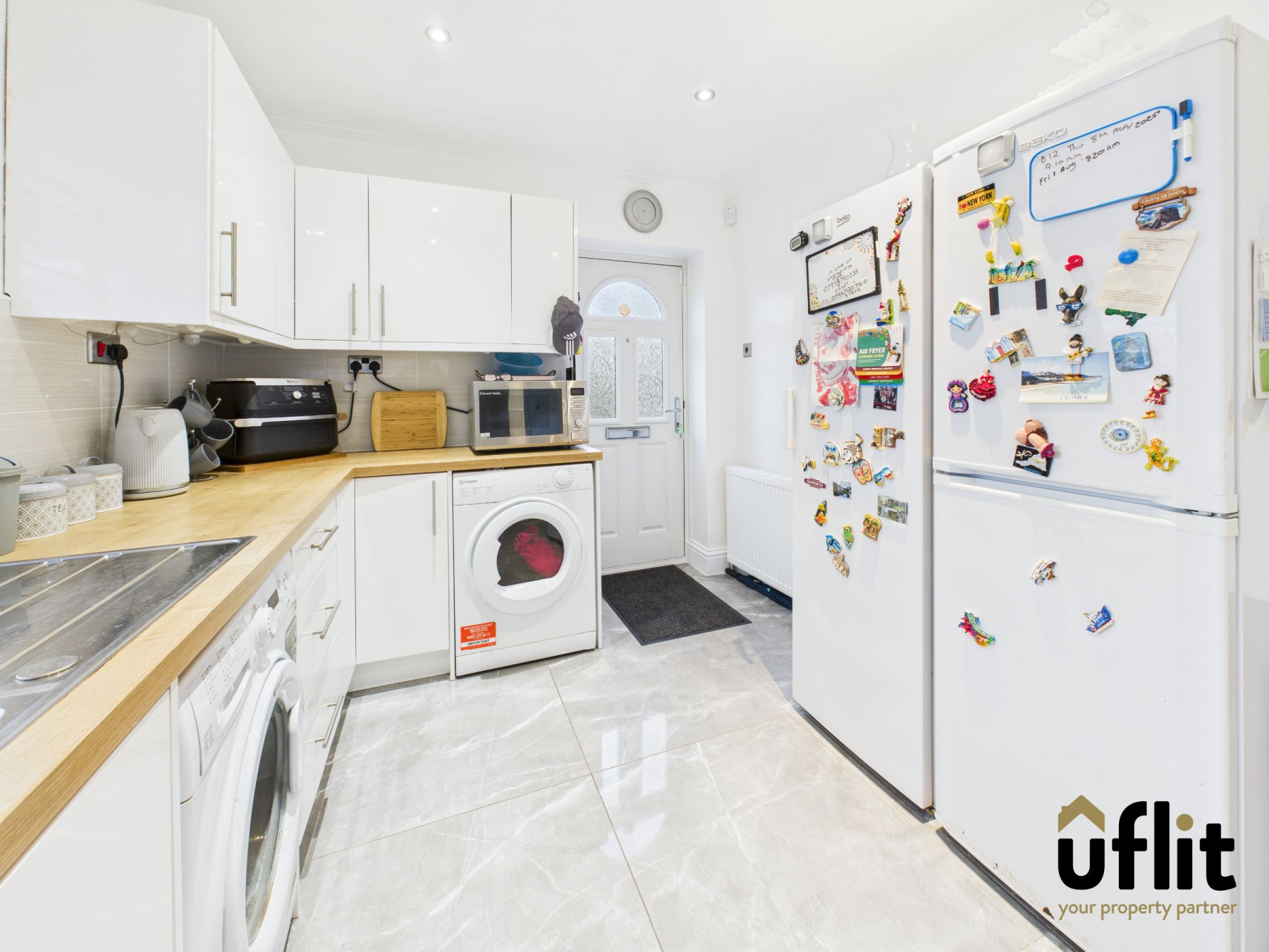 Entered via a composite door, this modern kitchen offers a range of fitted wall and base units with contrasting worktops and tiled splash backs. Integrated electric hob with oven beneath, space for appliances and a tiled floor. Spotlights add to the contemporary feel, alongside a side-facing window and a shutter. An opening leads through to the hallway.