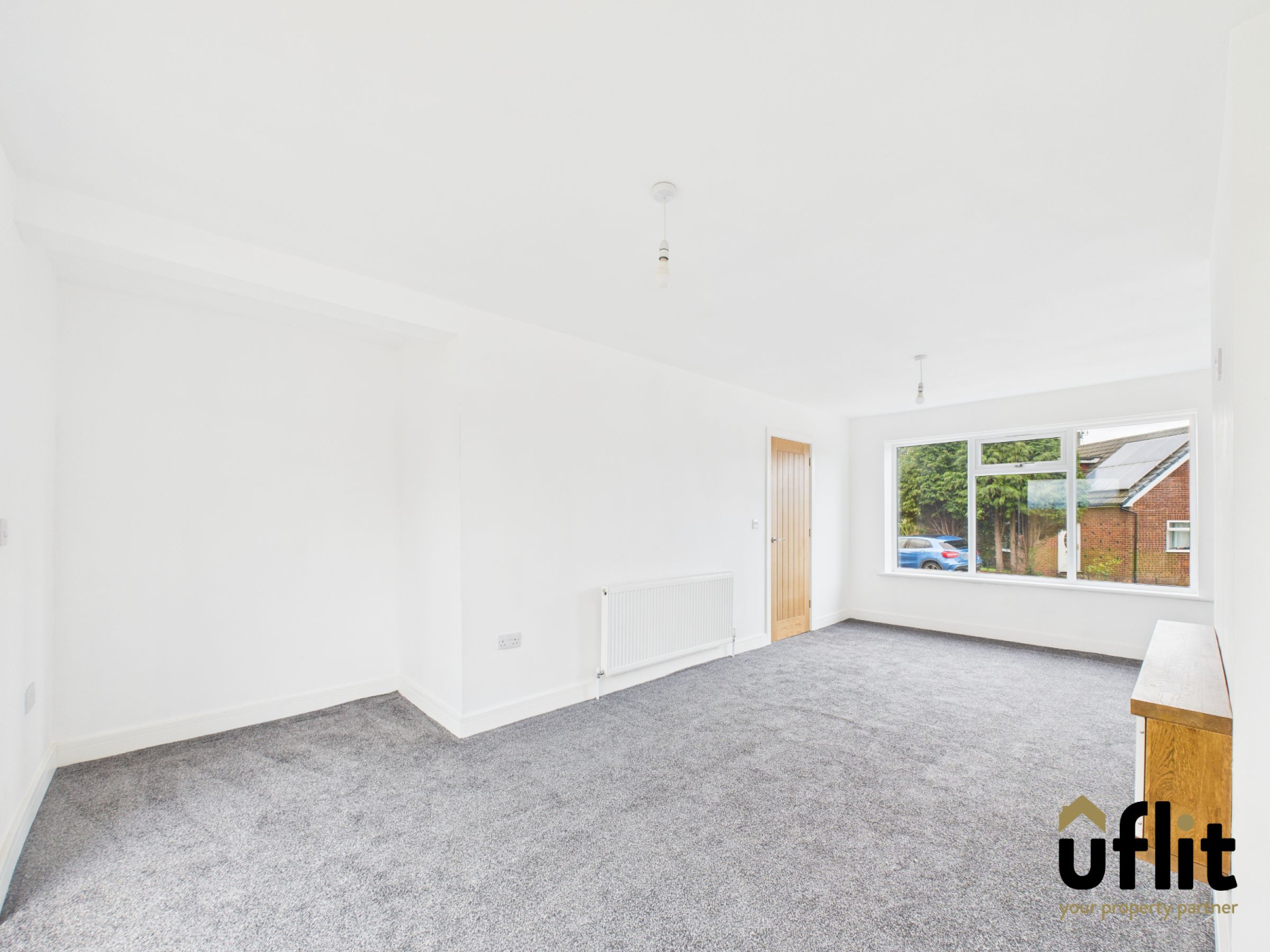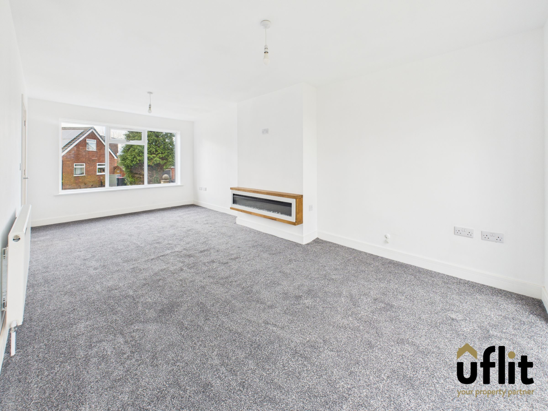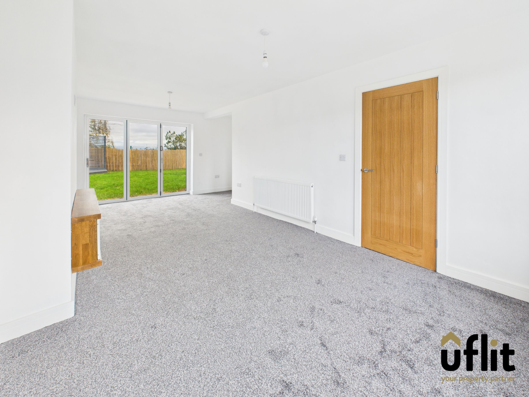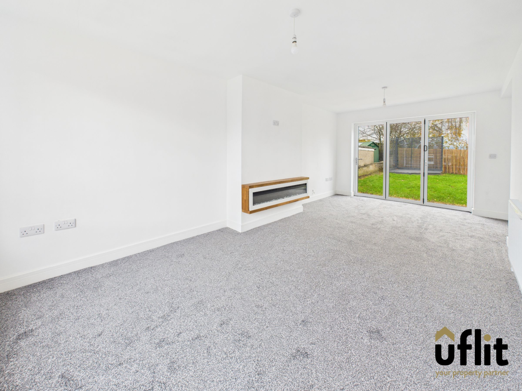Spacious and bright lounge with carpeted flooring, radiator and a front-facing window. Electric fire set on the chimney breast provides a focal point, and bifold doors open seamlessly onto the rear garden, creating an inviting space for entertaining or relaxing.