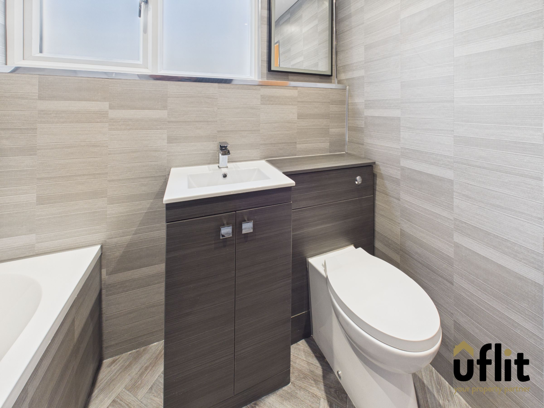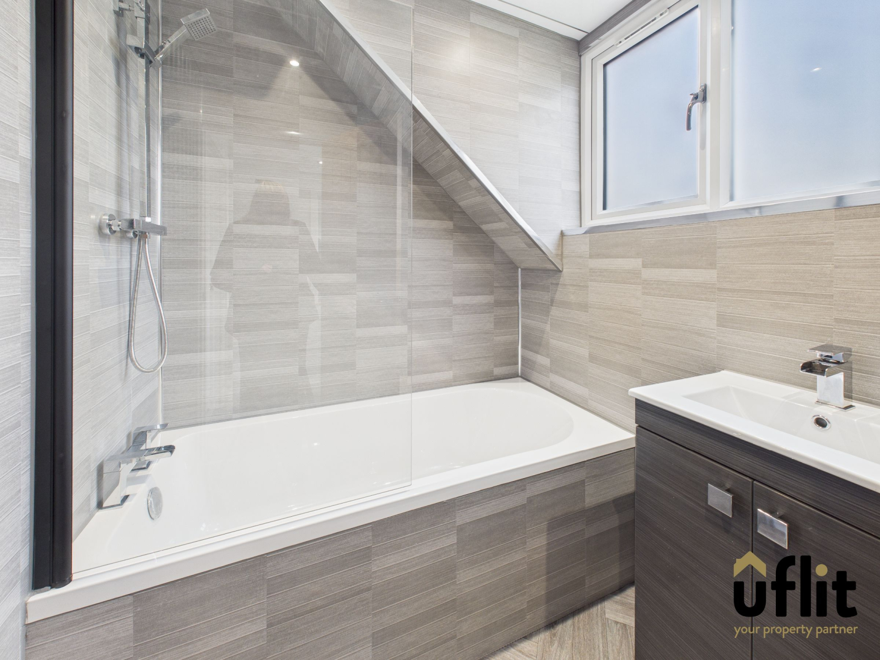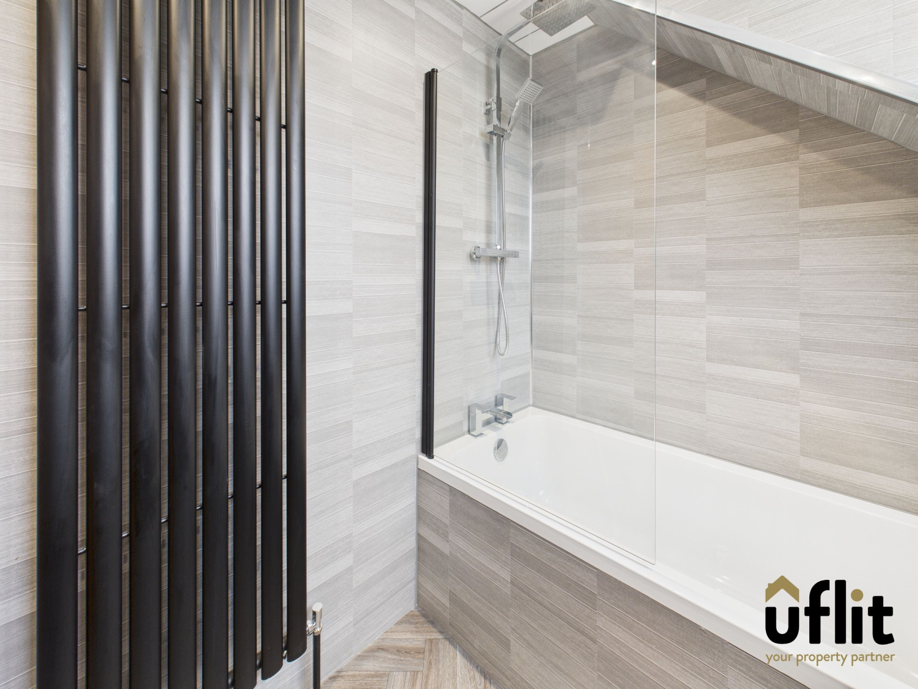 Modern bathroom with bath and shower above, glass screen, sink and WC inset into a vanity unit. Fully PVC-paneled walls and ceiling, vinyl flooring, modern tall radiator, rear-facing window, and a heated, illuminated mirror. Spotlights to the ceiling complete the contemporary look.