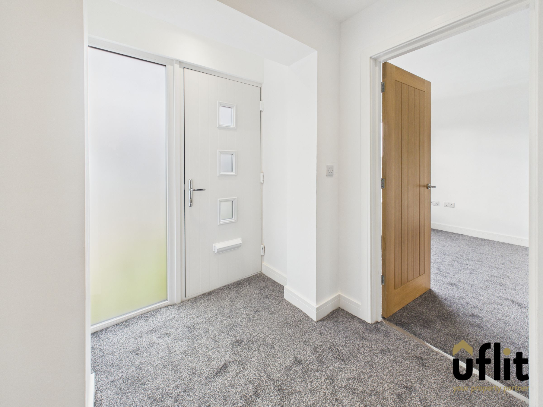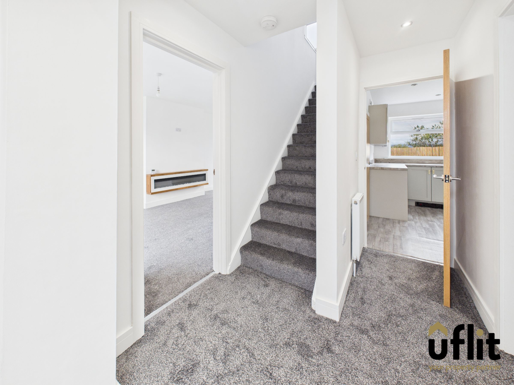 Composite entrance door, carpeted flooring and radiator. Doors lead to the lounge, kitchen and ground-floor bedroom. Carpeted stairs rise to the first-floor landing.
