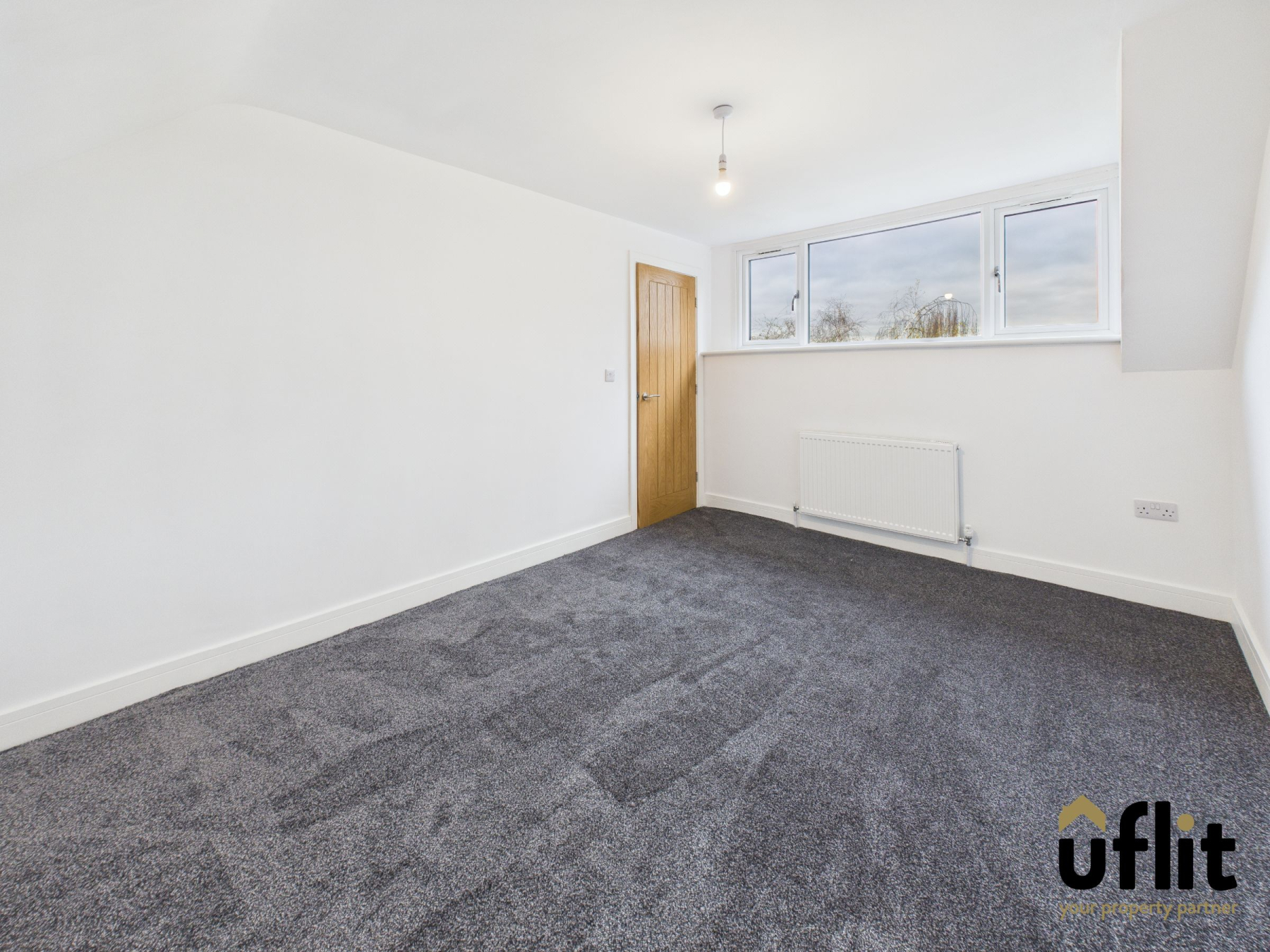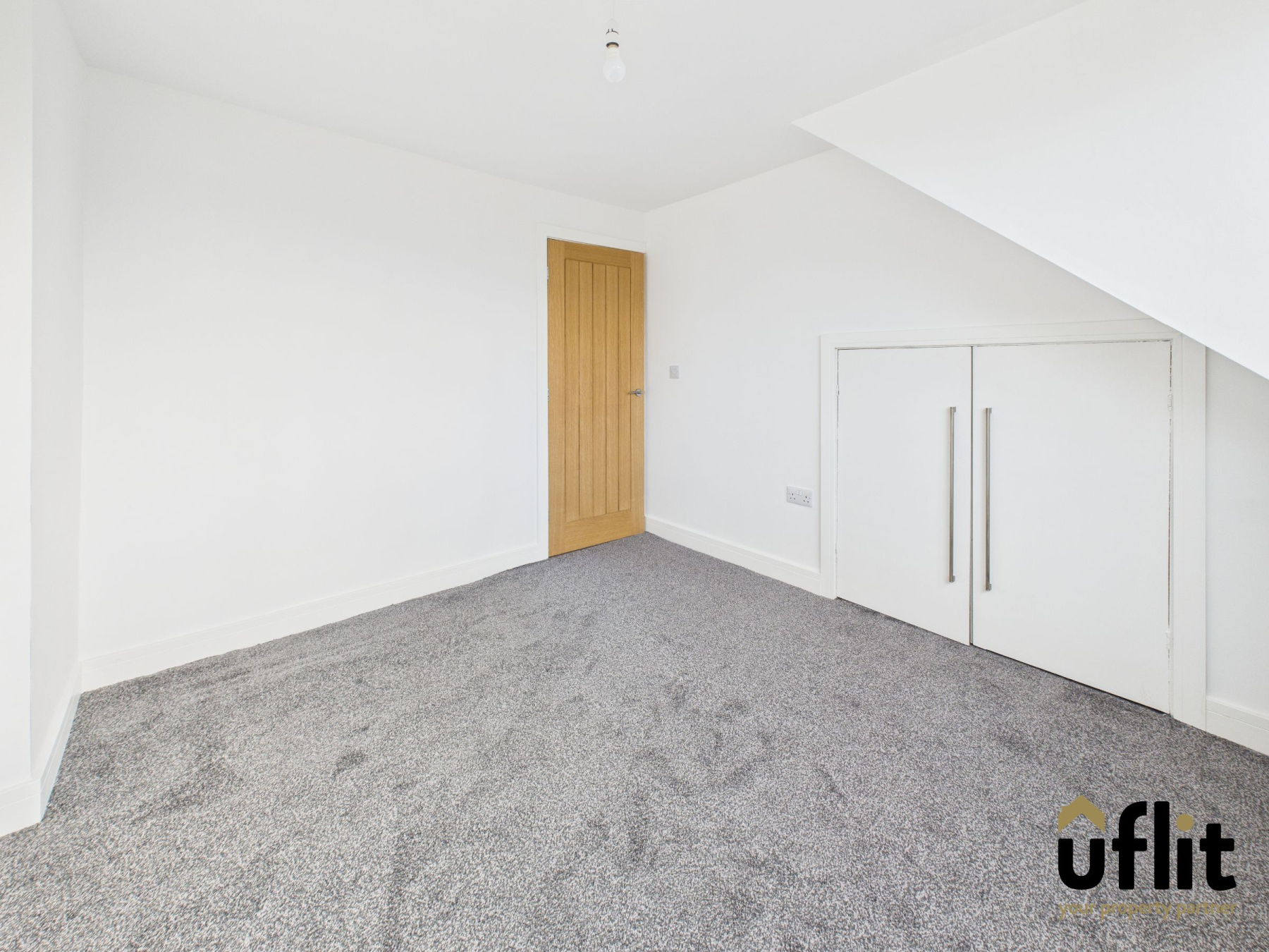 Double bedroom with carpet, radiator, front-facing window and storage cupboard.