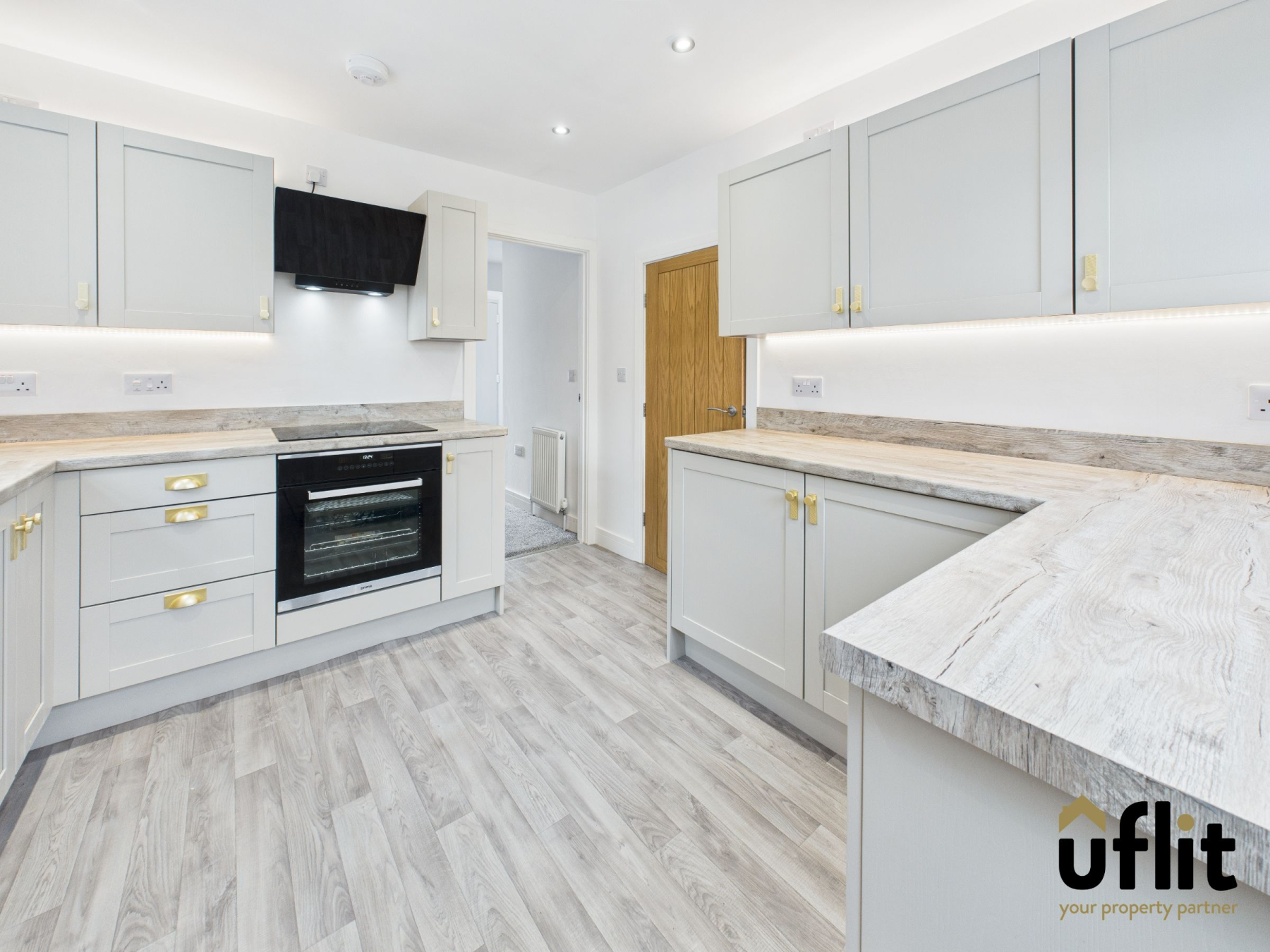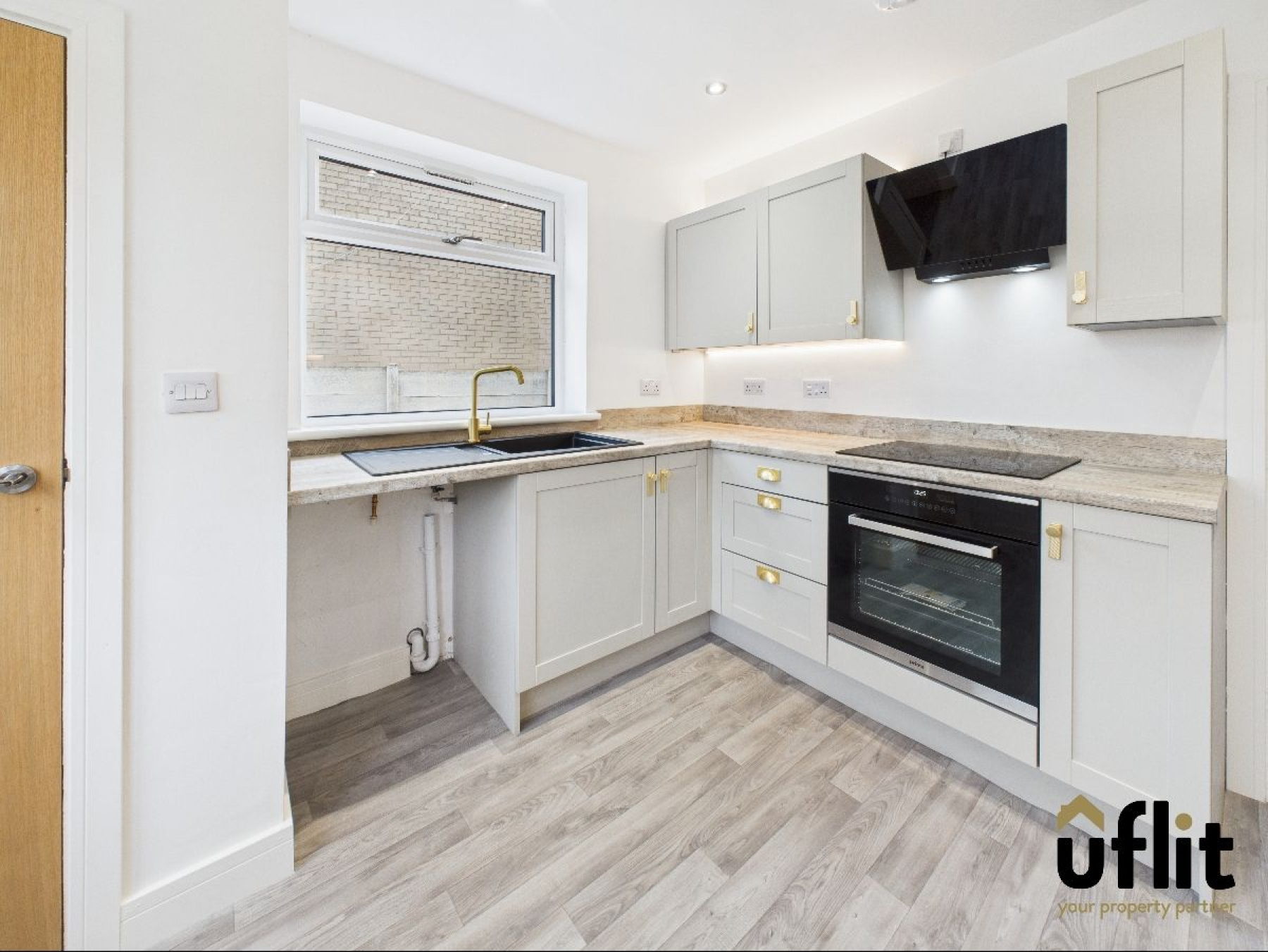 Modern kitchen fitted with wall and base units, matching worktops and upstands. Integrated appliances include fridge/freezer, induction hob with extractor above, and electric fan oven below. Vinyl flooring, plinth heater, spotlights to ceiling, side and rear-facing windows, and a door leading to the rear garden. Practical under-stairs storage and a storage cupboard housing the combi boiler.
