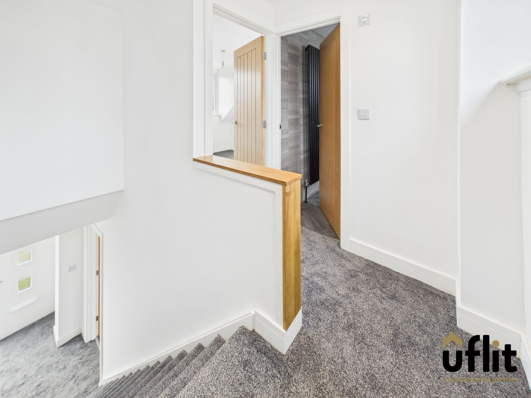 Carpeted landing with rear-facing window and spotlights to the ceiling. Doors lead to two double bedrooms and the bathroom.