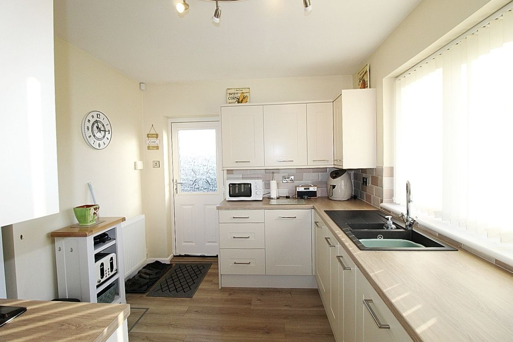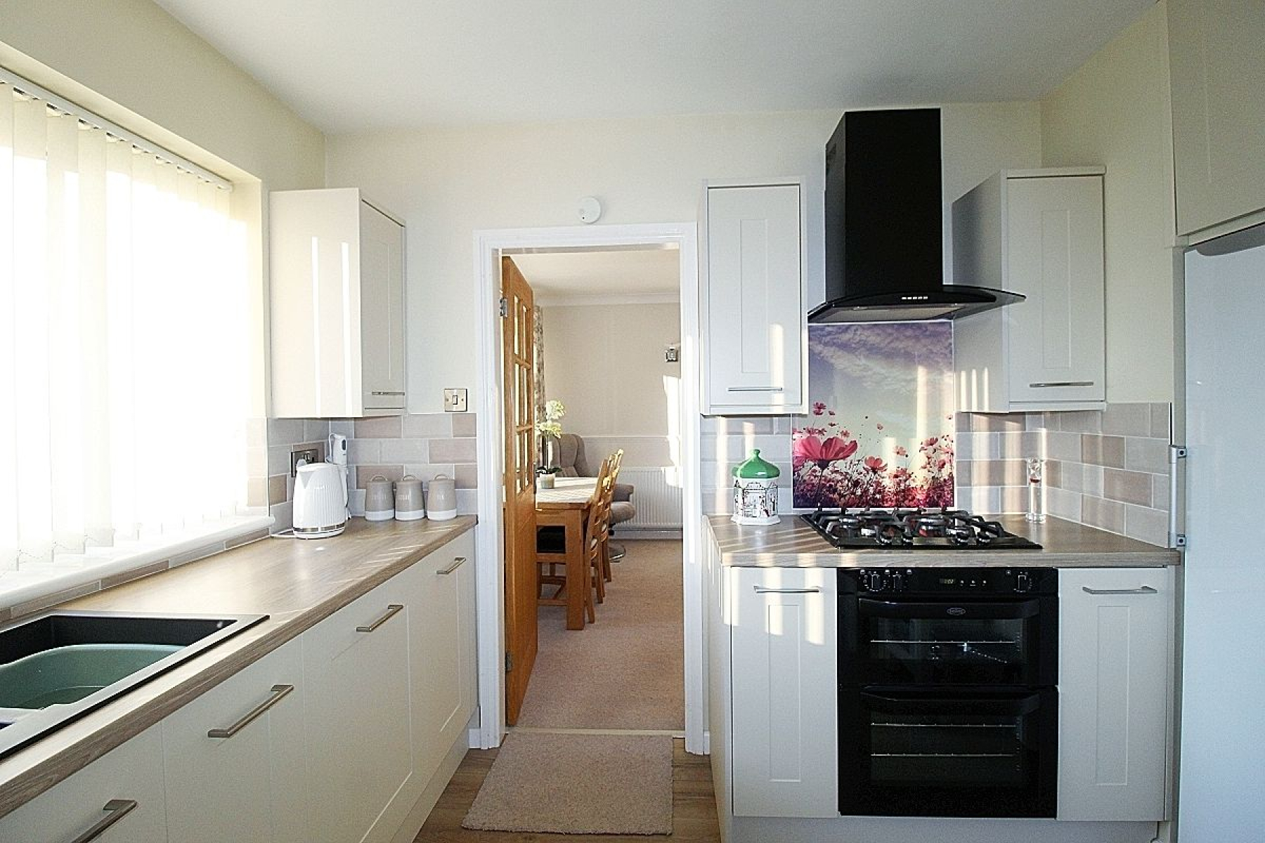 A beautiful canopy with mood lighting protects a glazed composite door inviting you in to this stylish kitchen with a large range of modern wall and base units, complimentary work service areas, bespoke tiled back panels and a counter top composite sink. Integrated appliances to include a built in double oven, gas hob with glass back panel, extractor fan, integrated washing machine, dishwasher and a recess for the fridge freezer. Beautiful laminate flooring, radiator, front facing upvc window and a glazed panelled solid wood door opening to the lounge/ diner.