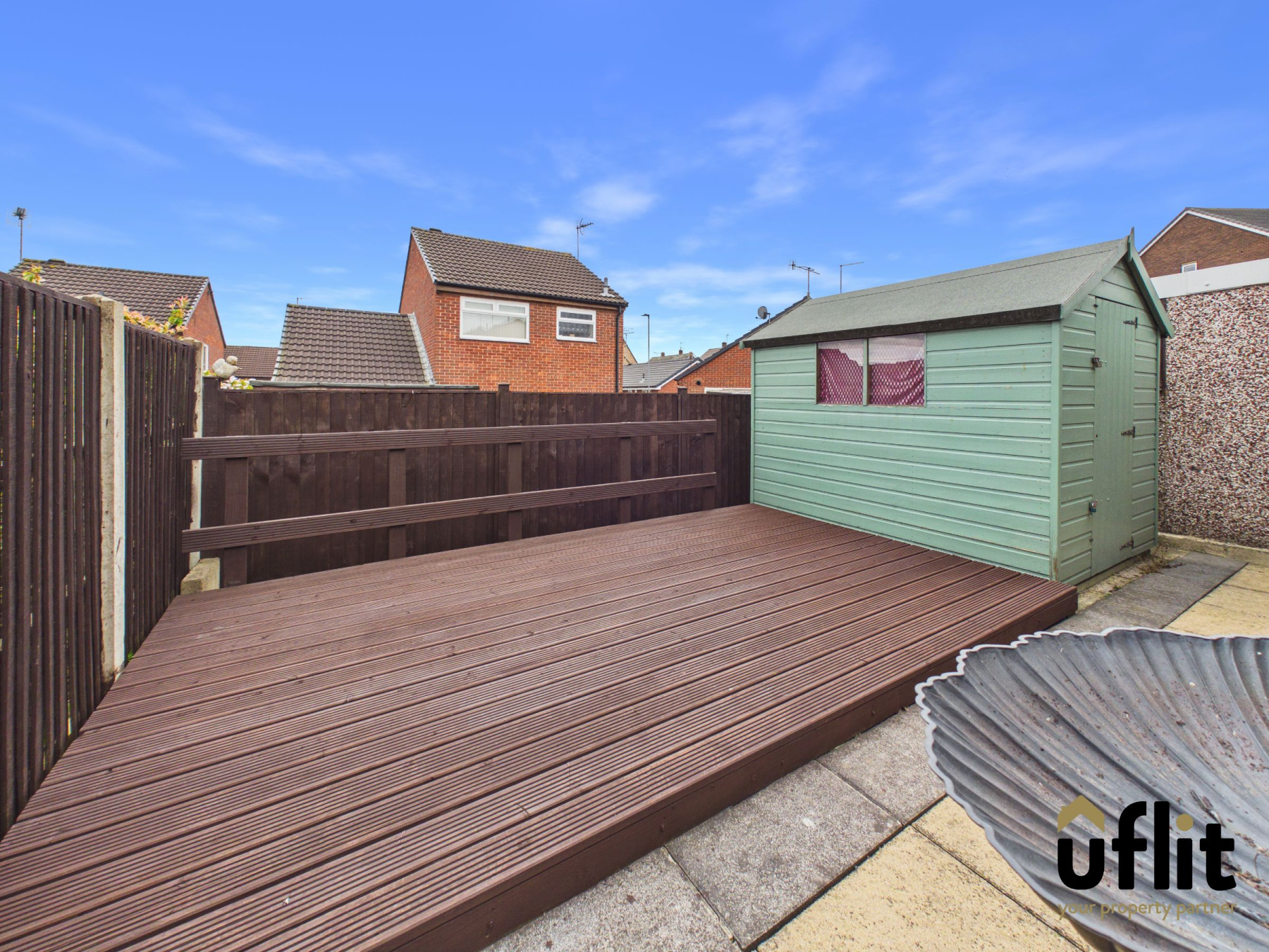 Externally, the property boasts a private and enclosed rear garden, designed for ease of maintenance and enjoyment. A patio area leads onto decking, perfect for outdoor seating, alongside a shed for additional storage. There is also gated side access and a convenient door leading into the detached garage.