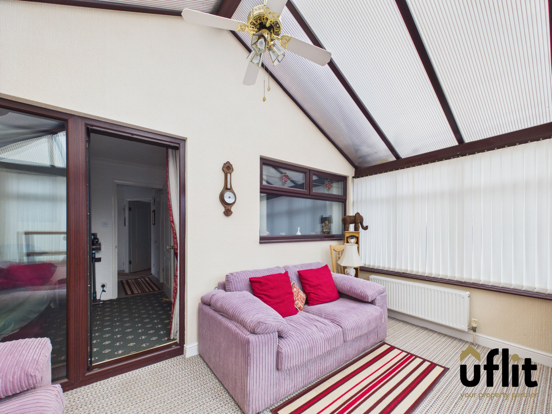 To the rear of the bungalow are the two bedrooms. The master bedroom benefits from a pleasant outlook over the conservatory and includes fitted sliding wardrobes, offering ample storage. The second bedroom is a versatile space and features sliding doors opening directly into the conservatory.