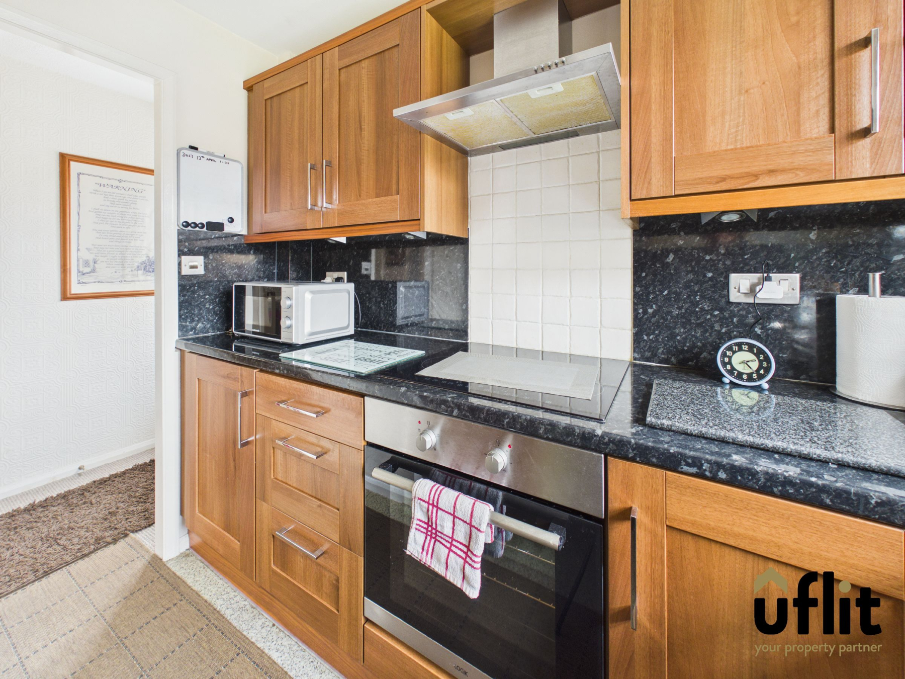 Positioned to the front of the property, the kitchen is both practical and well-equipped, featuring vinyl flooring and a radiator. A front-facing window allows natural light to fill the space, enhancing the range of fitted units and integrated appliances including an electric oven, electric hob and fridge freezer. There is also space and plumbing for a washing machine, making this a functional and convenient area for everyday use.
