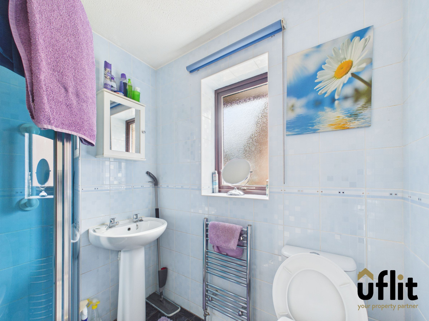 The bathroom is fitted with tiled flooring and tiled walls, creating a clean and modern finish. It comprises a shower cubicle, WC and wash basin, along with a towel radiator for added comfort. A side-facing window provides natural light and ventilation.