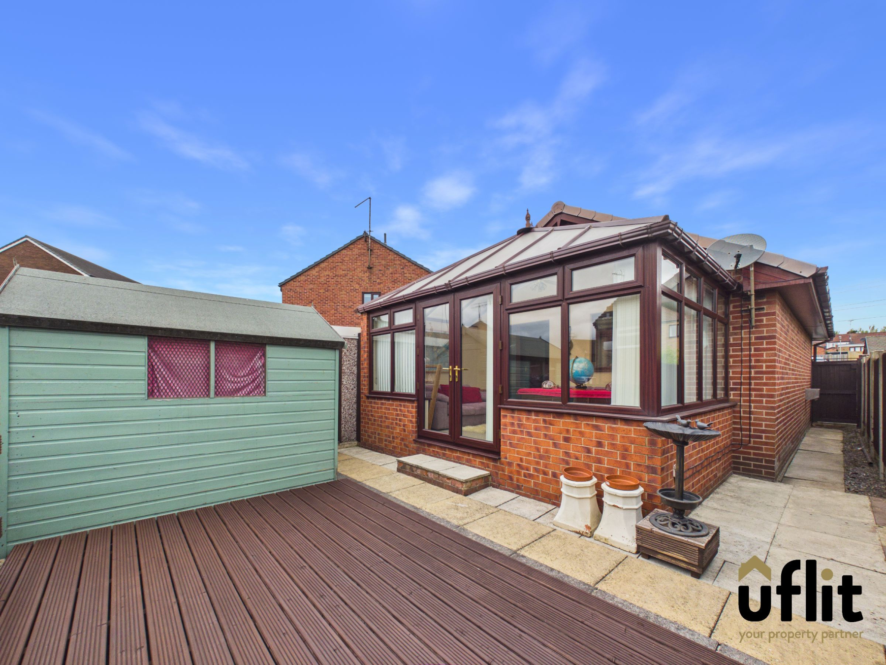 Externally, the property boasts a well-maintained and enclosed rear garden designed for ease of upkeep. A patio area leads onto a raised decking area, perfect for outdoor seating and entertaining. There is also a shed providing additional storage, along with gated side access and a door leading directly into the detached garage. To the front, a lawned garden and driveway complete this attractive home.