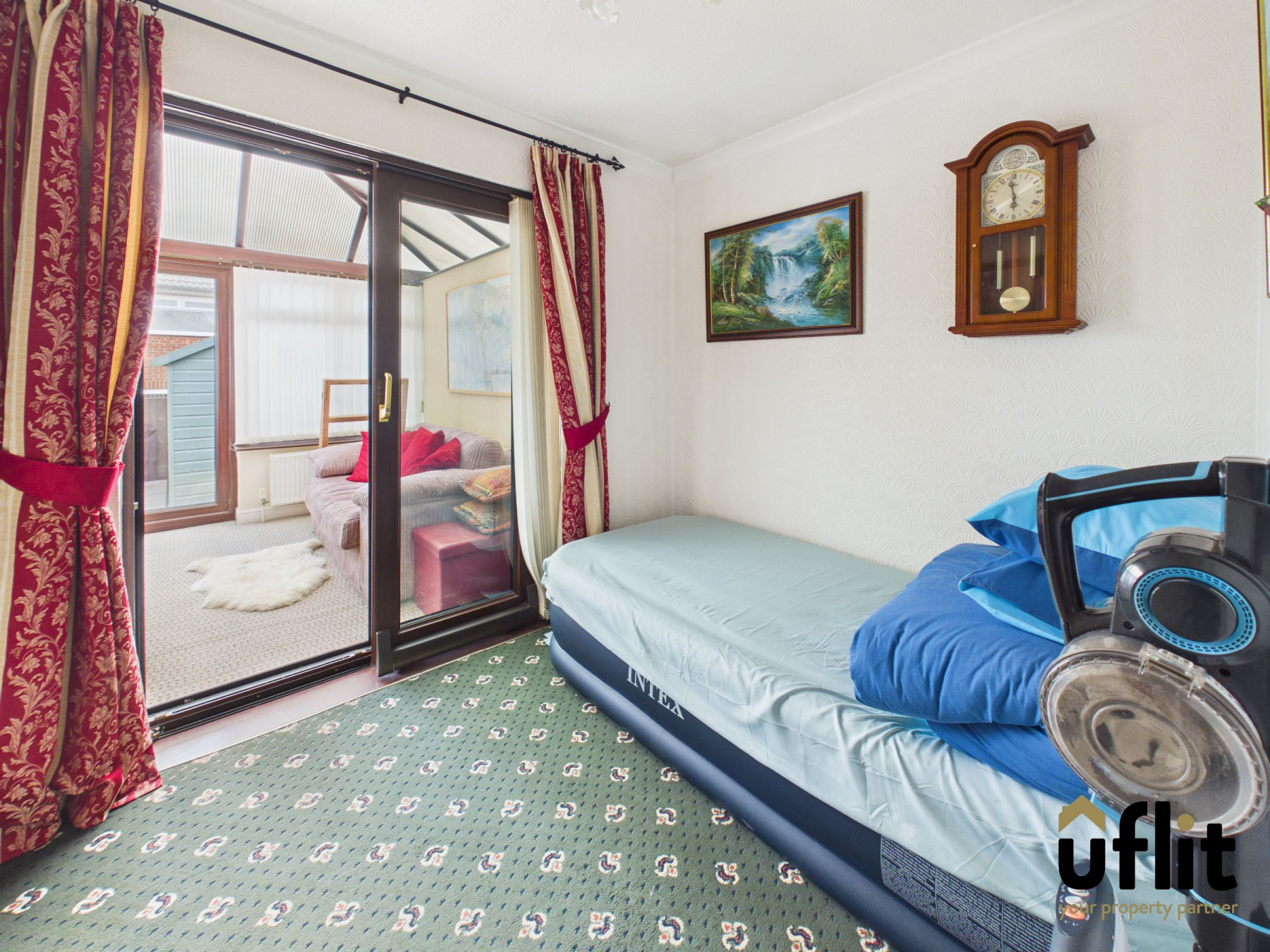 The second bedroom is a versatile room, ideal as a guest bedroom, home office or additional living space. It is fitted with carpet flooring and a radiator and features sliding doors which open directly into the conservatory, enhancing the sense of space and light.
