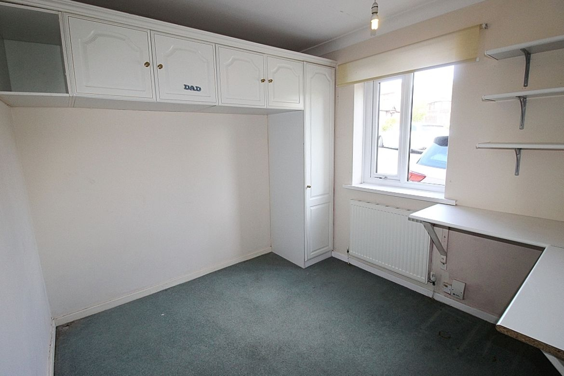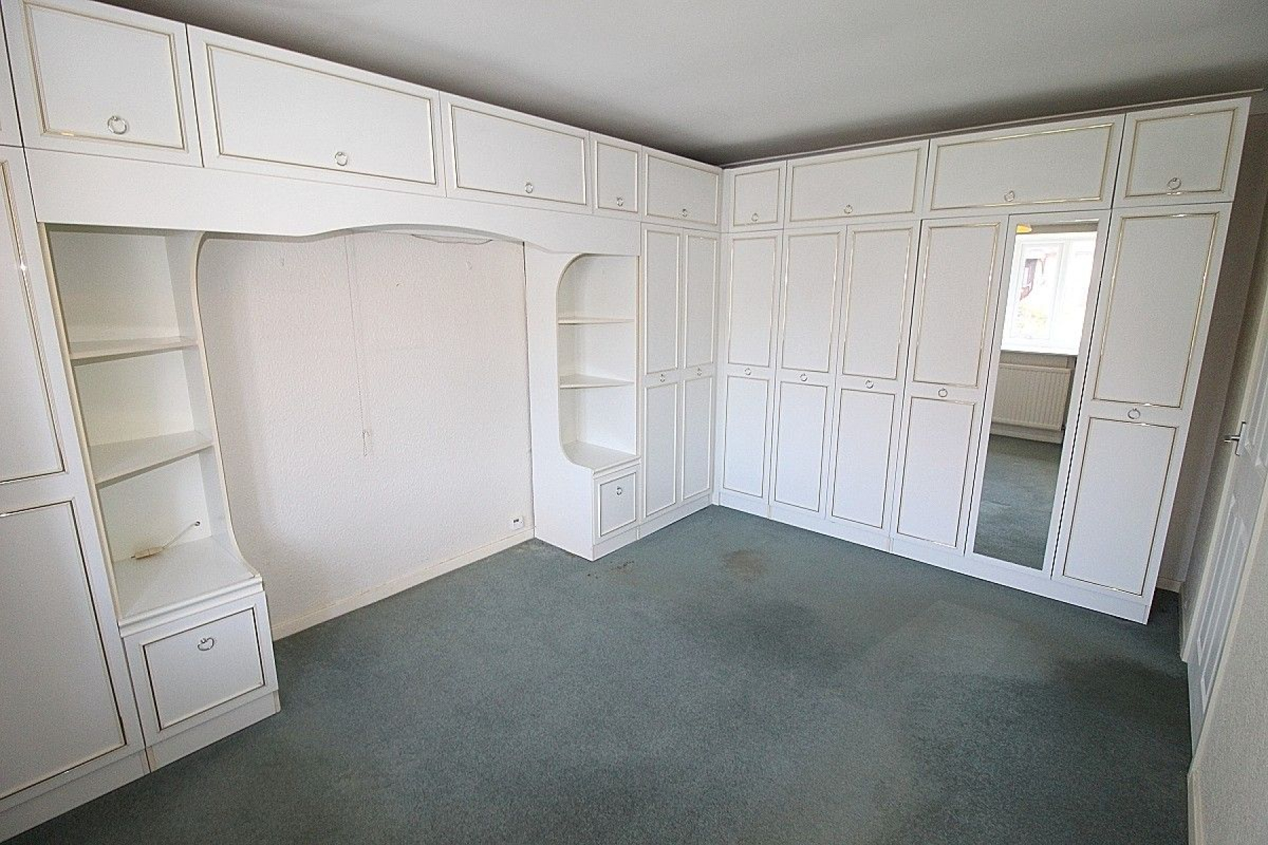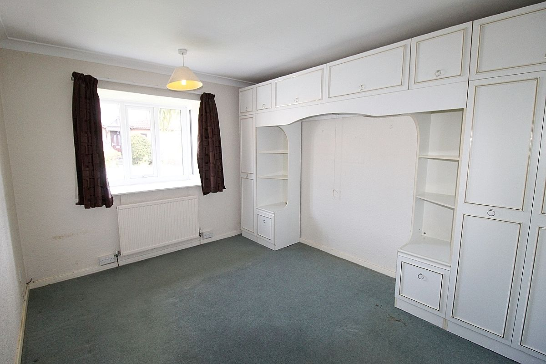 Another good-sized bedroom with rear-facing window, carpeted flooring, radiator and fitted wardrobes and furniture.