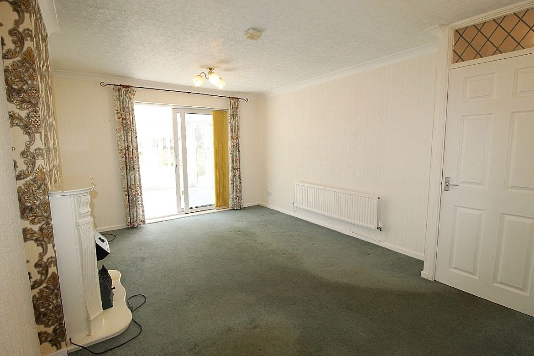 A bright and airy lounge featuring large patio doors leading to the conservatory, carpeted flooring, radiator and a feature fire place catches the eye.