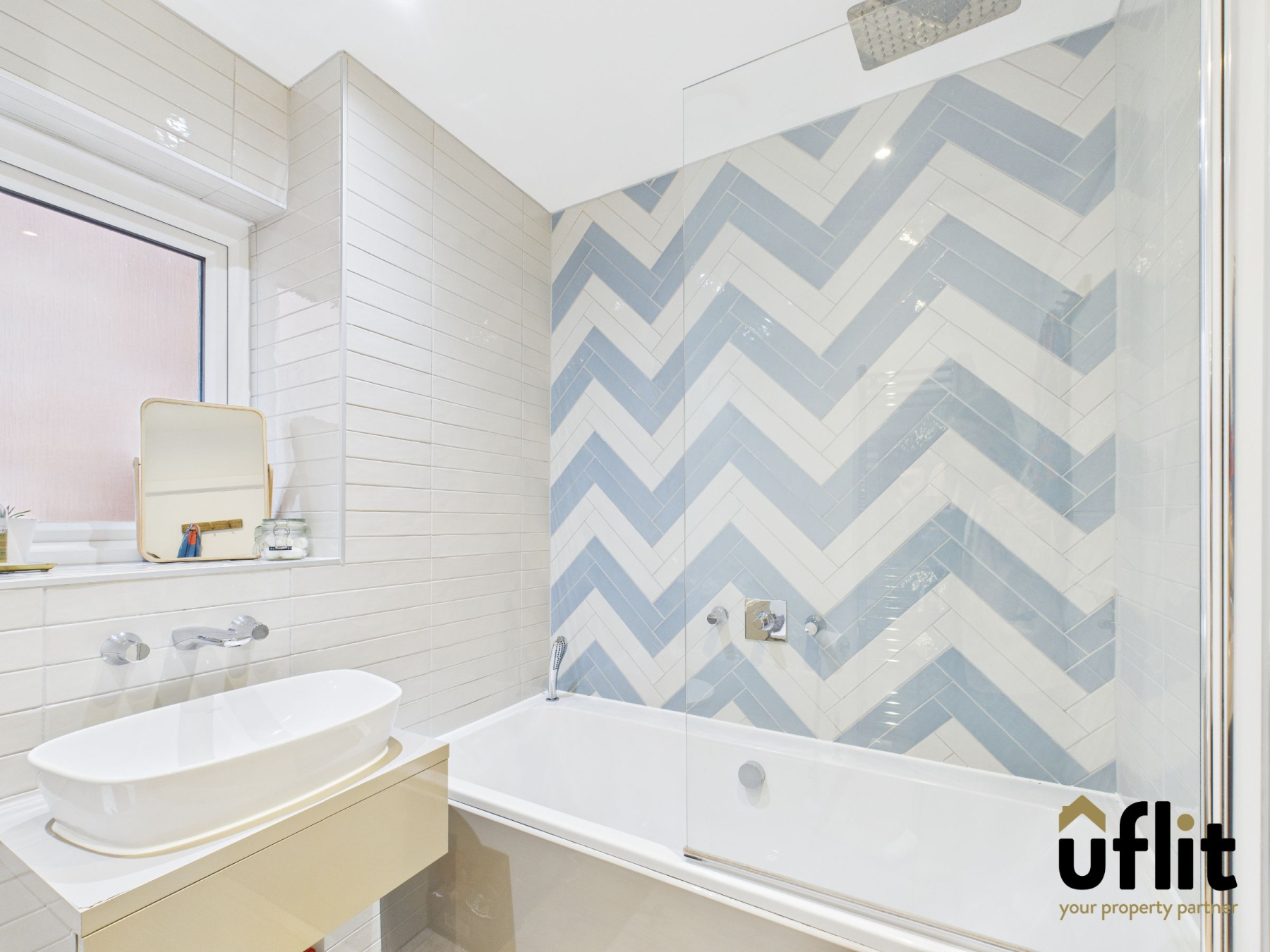The family bathroom is equally well-appointed, with Amtico flooring, a rainforest shower over the bath, floating vanity basin and towel rail all finished with elegant tiling and a side-facing window.
