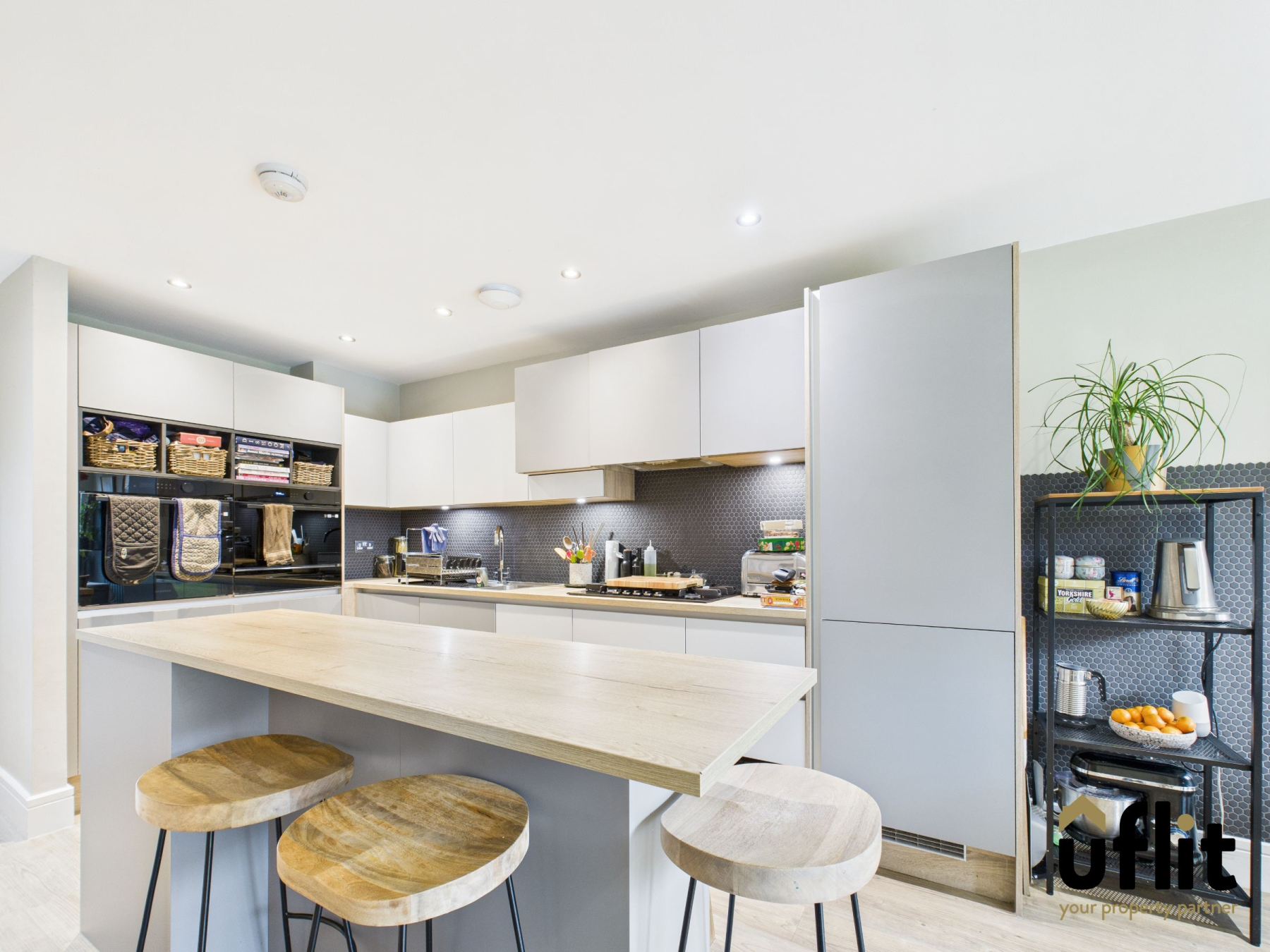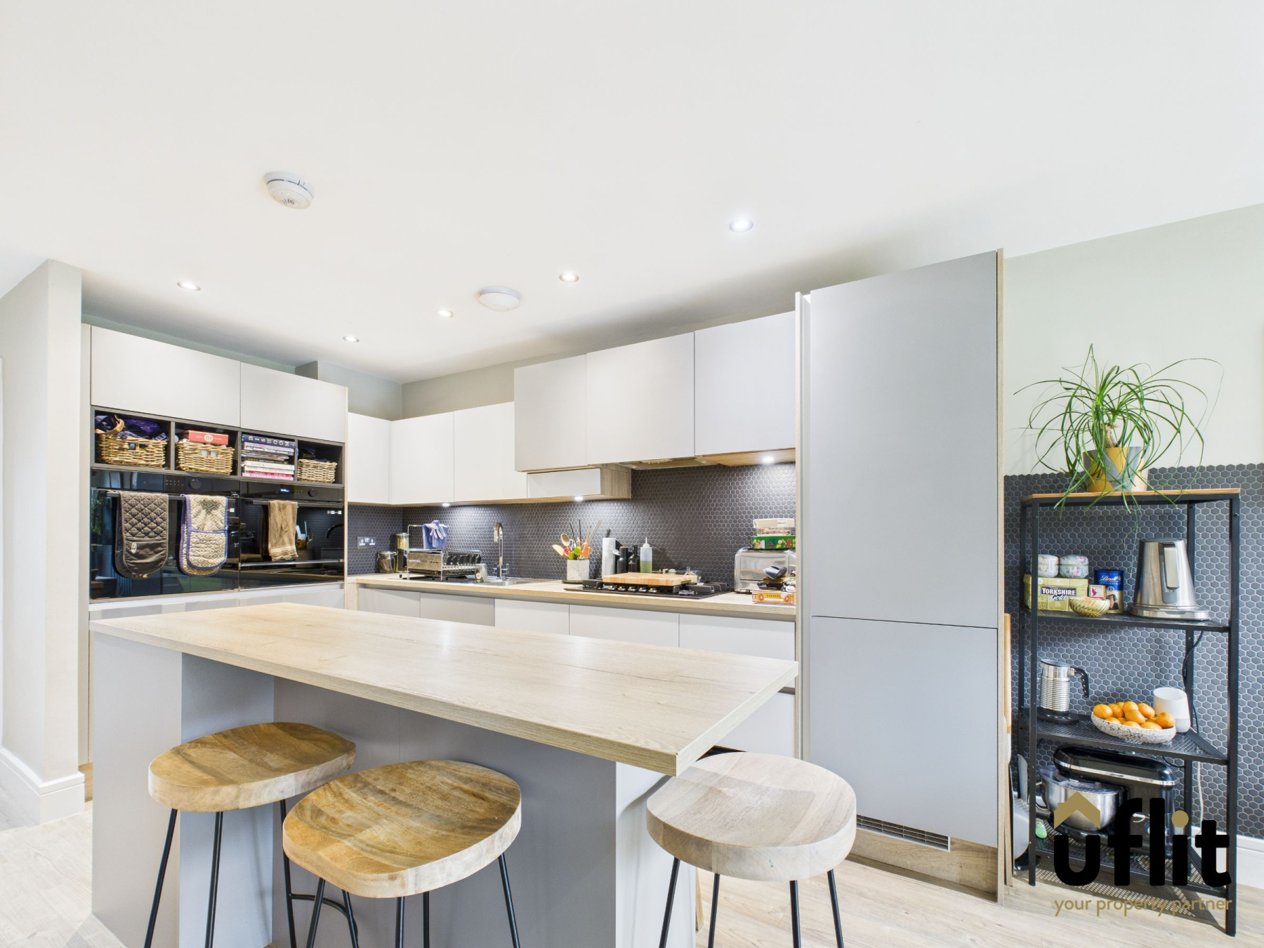 The heart of the home-this stunning open-plan kitchen/diner is a true showstopper. Boasting a central island with breakfast bar, integrated ovens with warming drawer, combi microwave, gas hob with hidden extractor and a 50/50 integrated fridge freezer. Sleek wall and base units are complemented by wood-effect laminate worktops and a contemporary tiled splashback. Bifold doors span the rear opening onto the garden and creating a seamless transition between indoor and outdoor living.