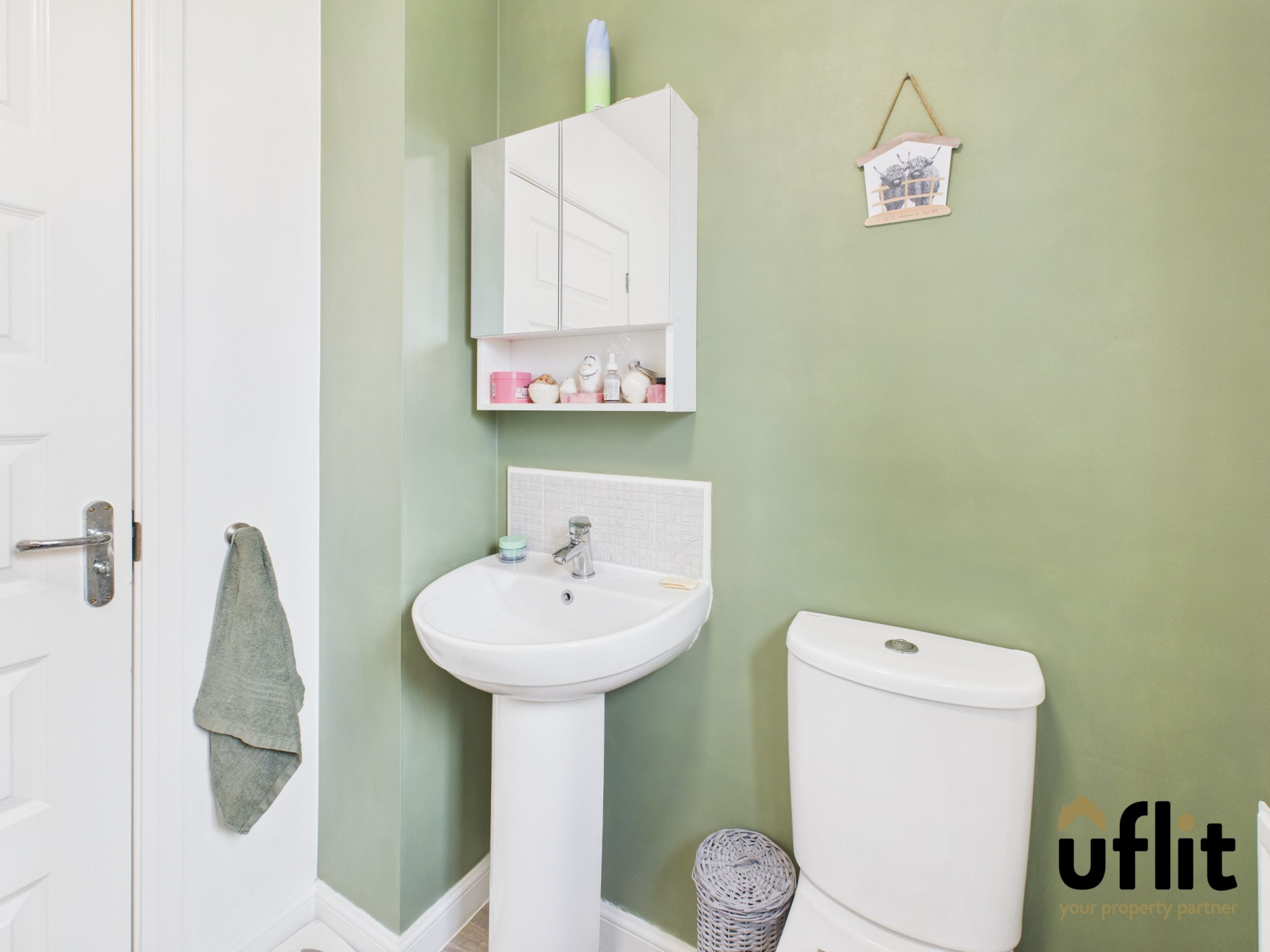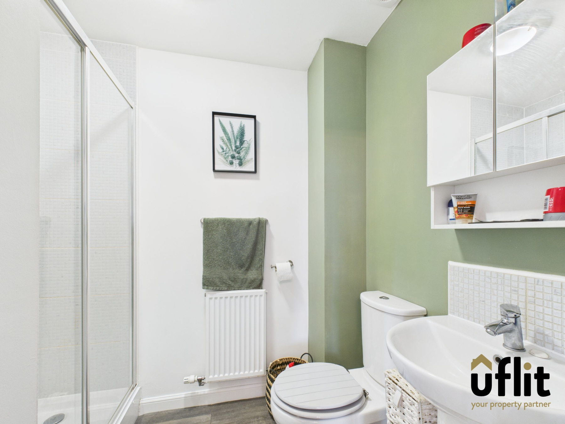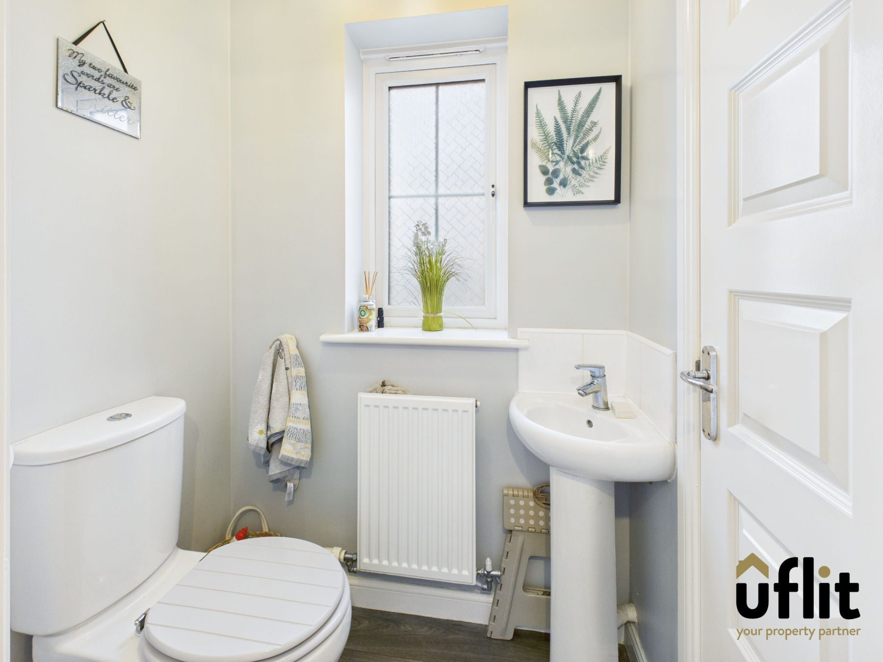 Comprising a side-facing window, radiator, corner wash hand basin with tiled splashback, low-level WC and handy storage cupboard.