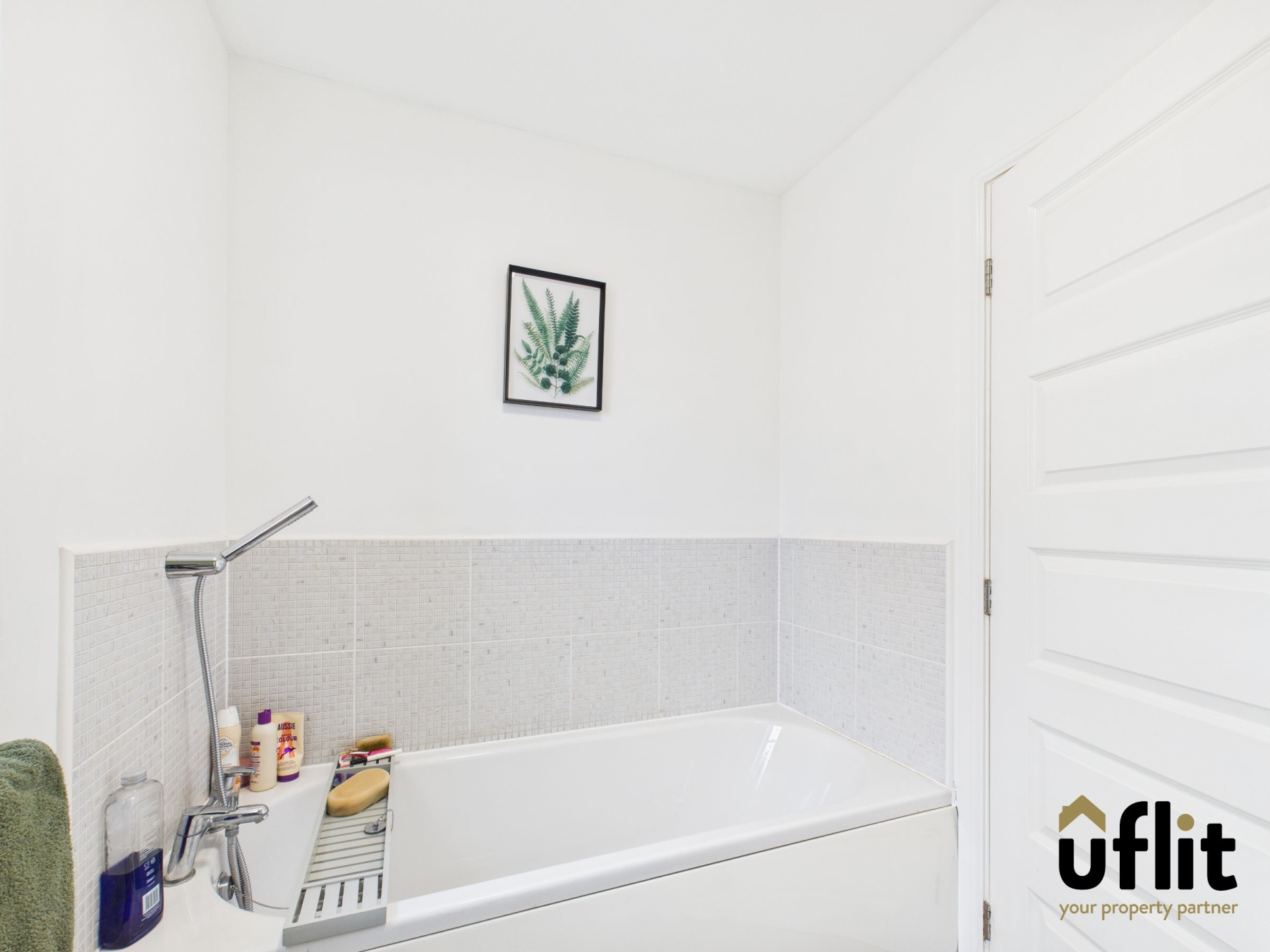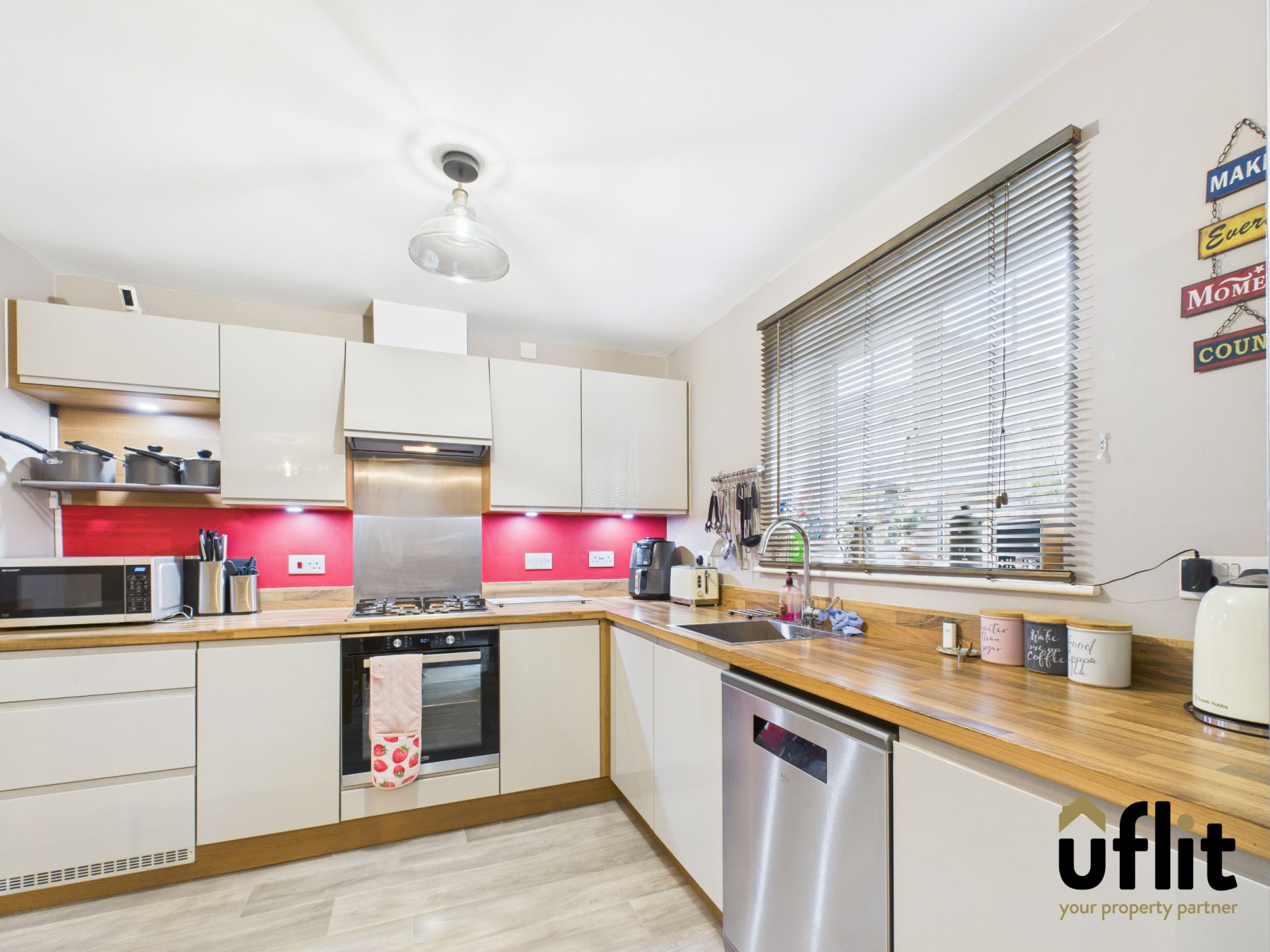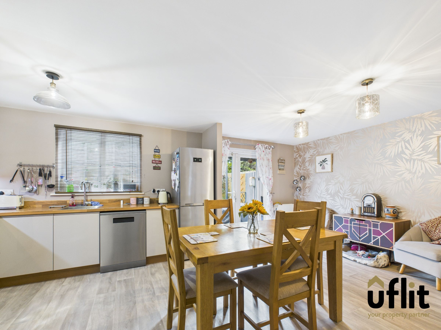 A stunning open-plan kitchen/dining space ideal for family life and entertaining. Fitted with a range of modern wall and base units with wood-style worktops and upstands, integrated electric oven, gas hob with metal splashback and extractor fan. There is space for a dishwasher and fridge-freezer. A rear-facing window and uPVC French doors flood the space with light and provide access to the garden. Finished with vinyl flooring, radiator and a feature wall.