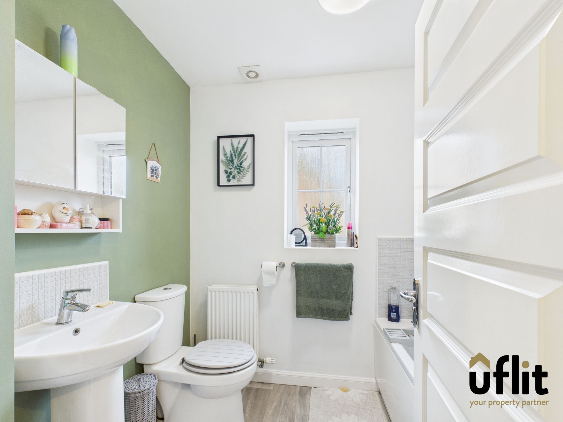 Modern family bathroom comprising a panelled bath with shower attachment, washbasin, low-level WC, radiator, partially tiled walls, vinyl flooring, extractor fan and side-facing window.
