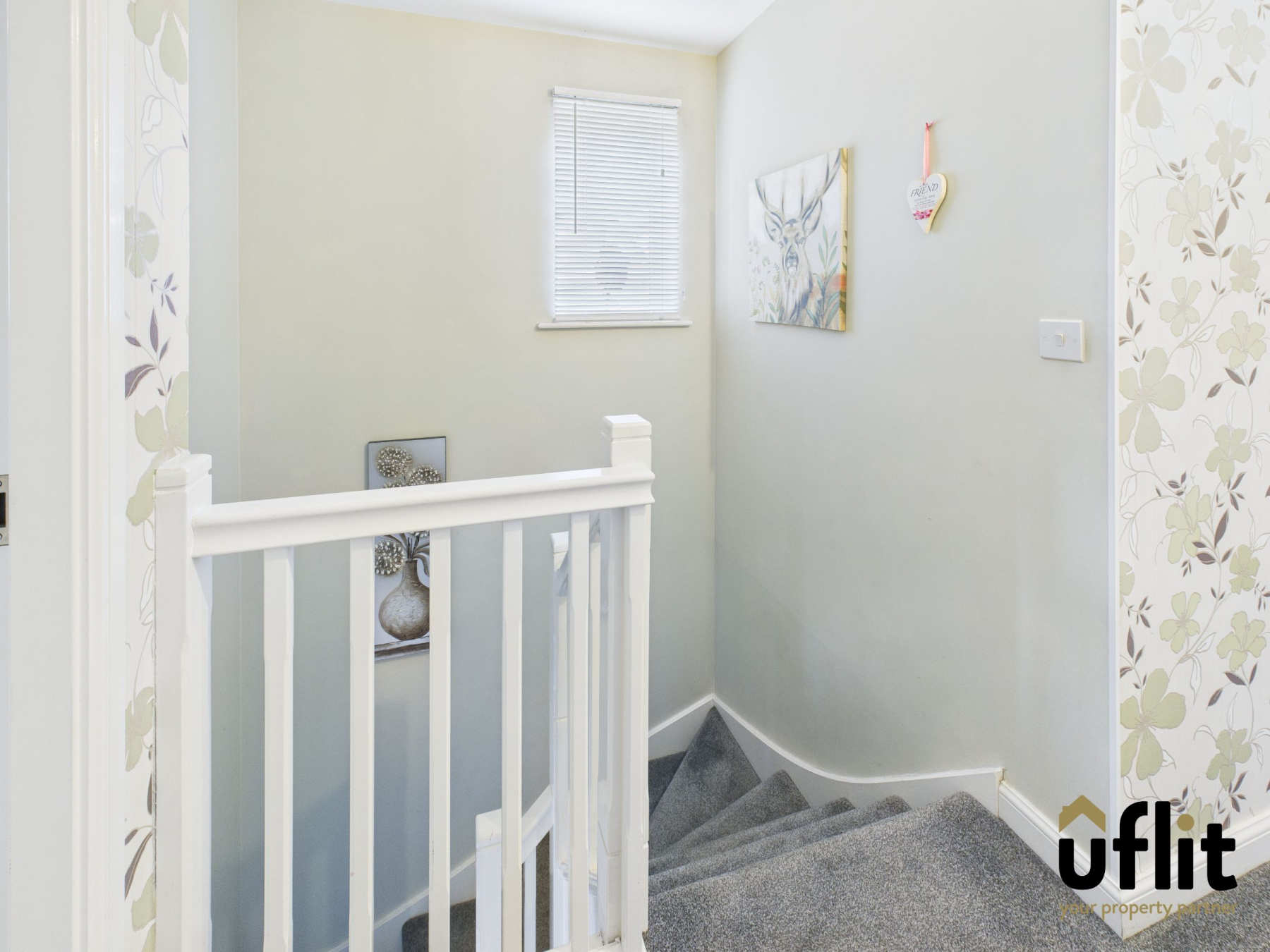 Carpeted stairs rise to a spacious landing area with a side-facing window allowing natural light to flow through.