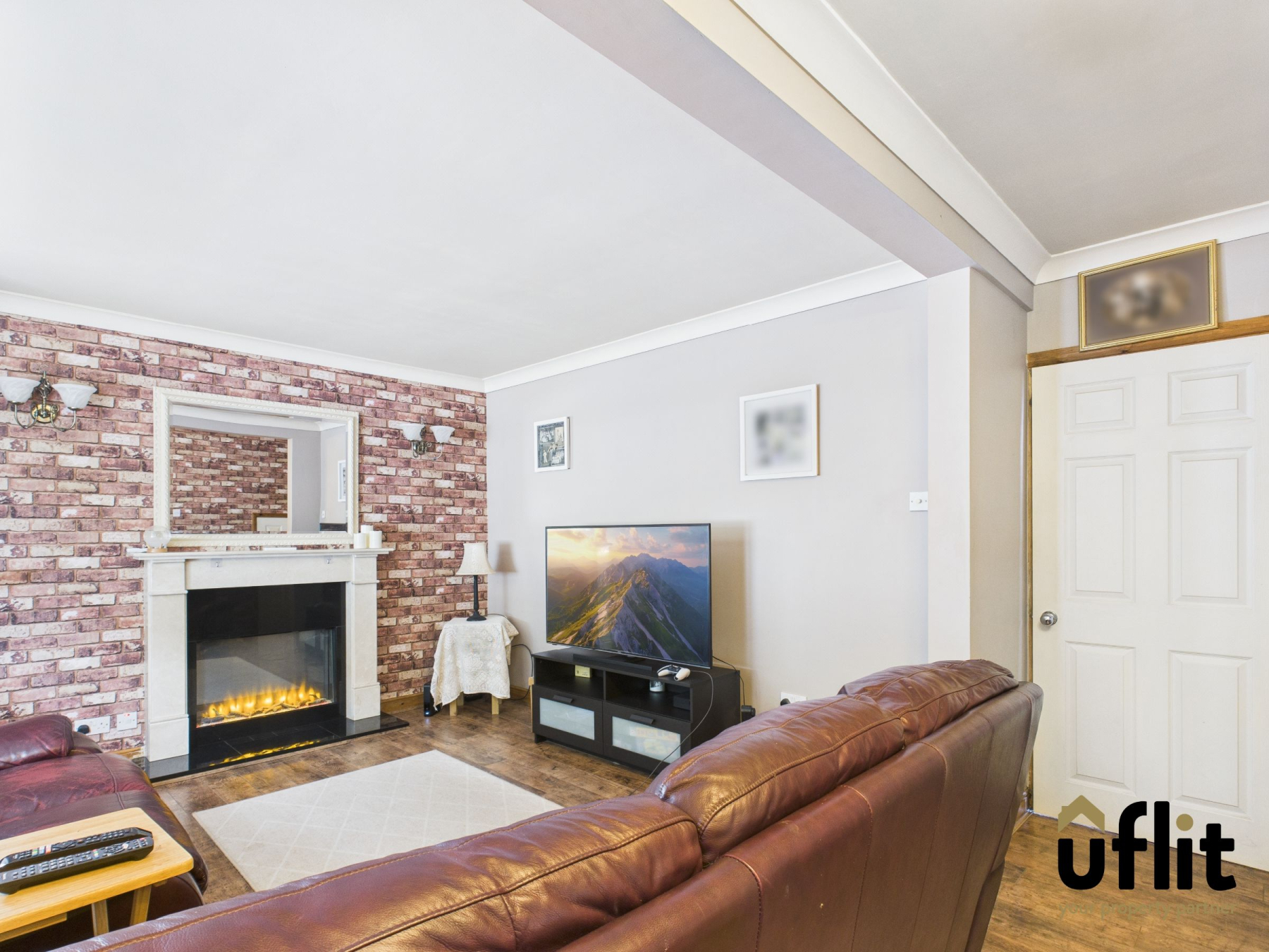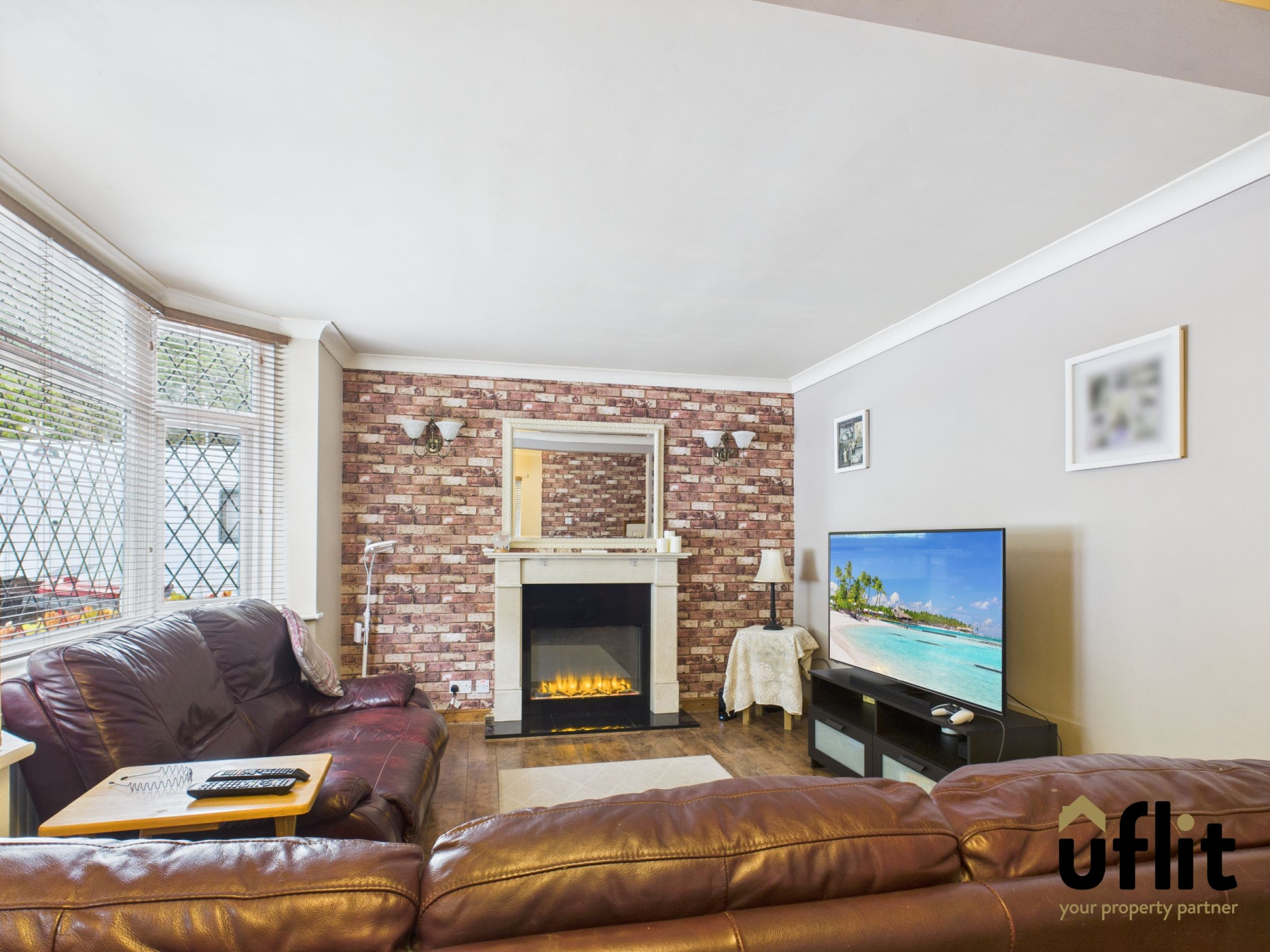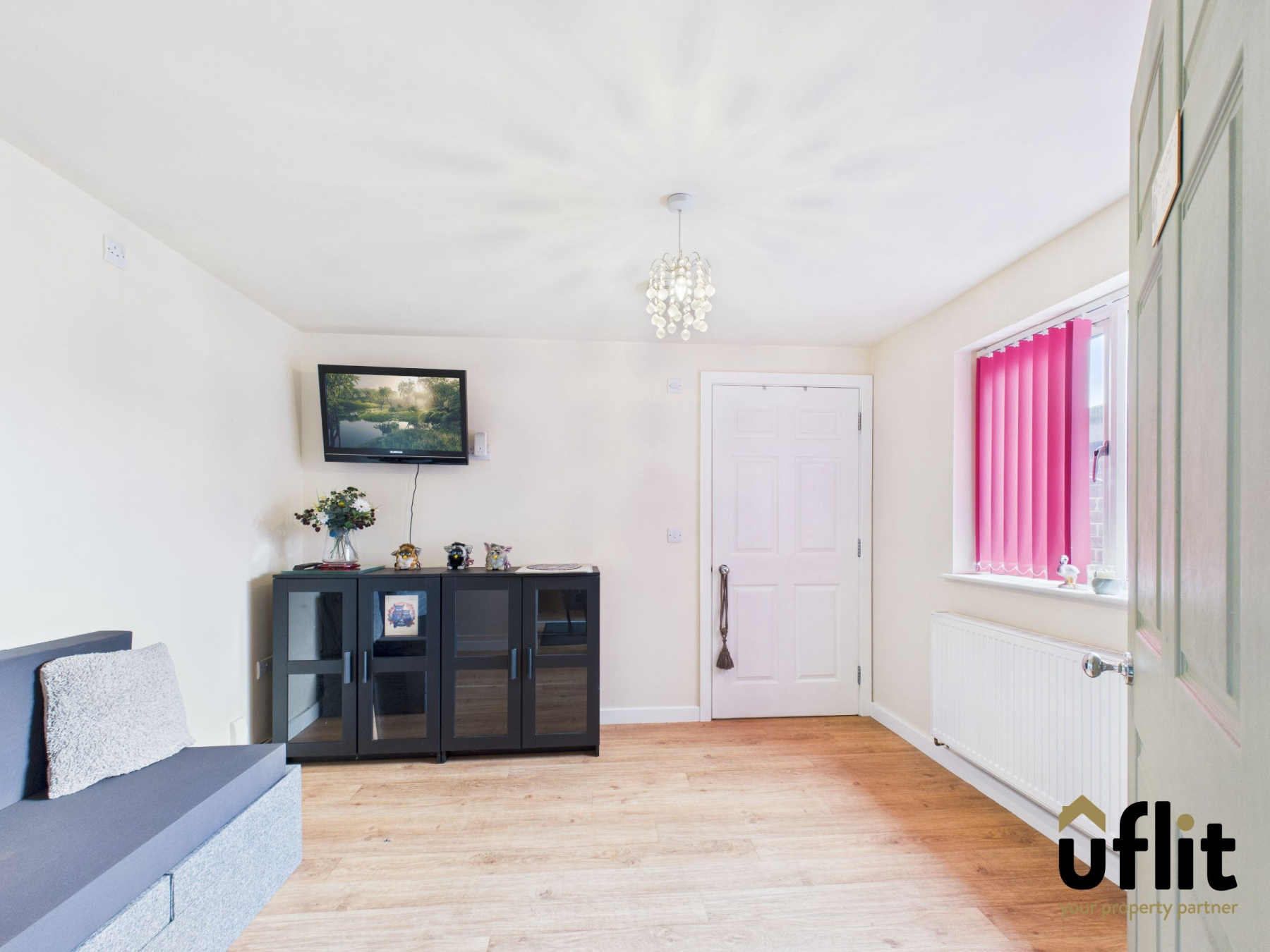 The spacious lounge is both stylish and inviting, featuring a large bay window and additional side window that fill the room with light. Laminate flooring complements the décor and a feature electric fire creates a cosy focal point. Carpeted stairs lead to the first floor seamlessly blending practicality with charm.
