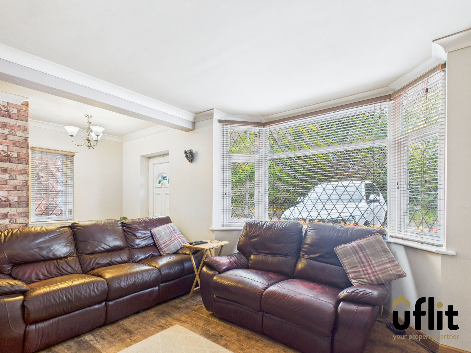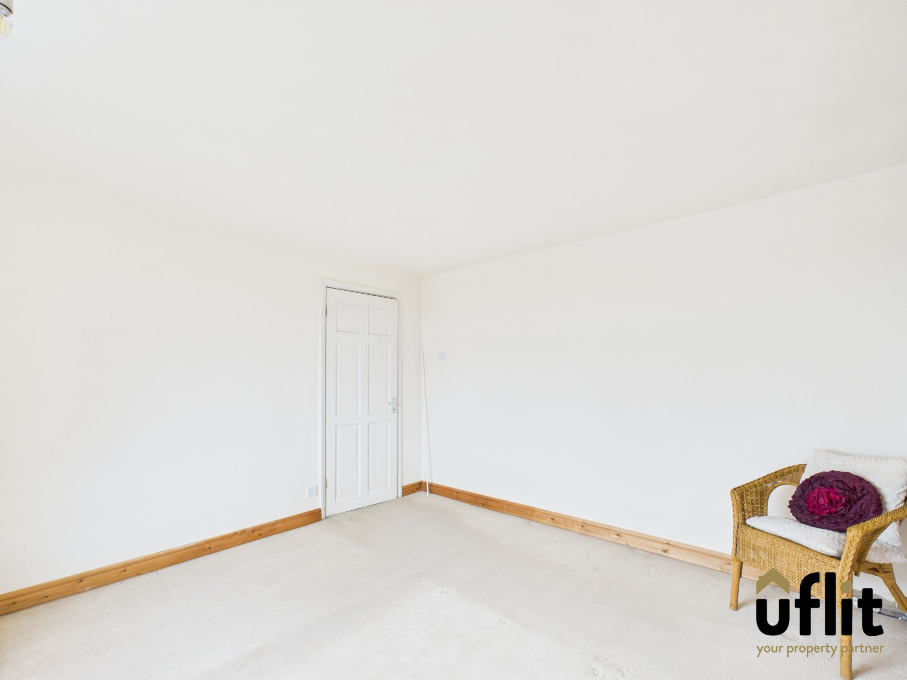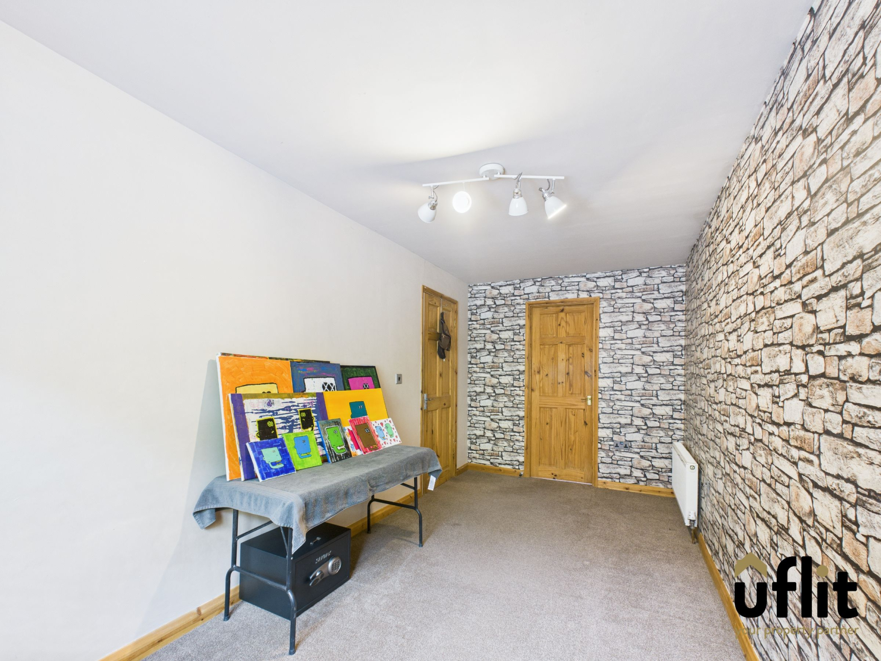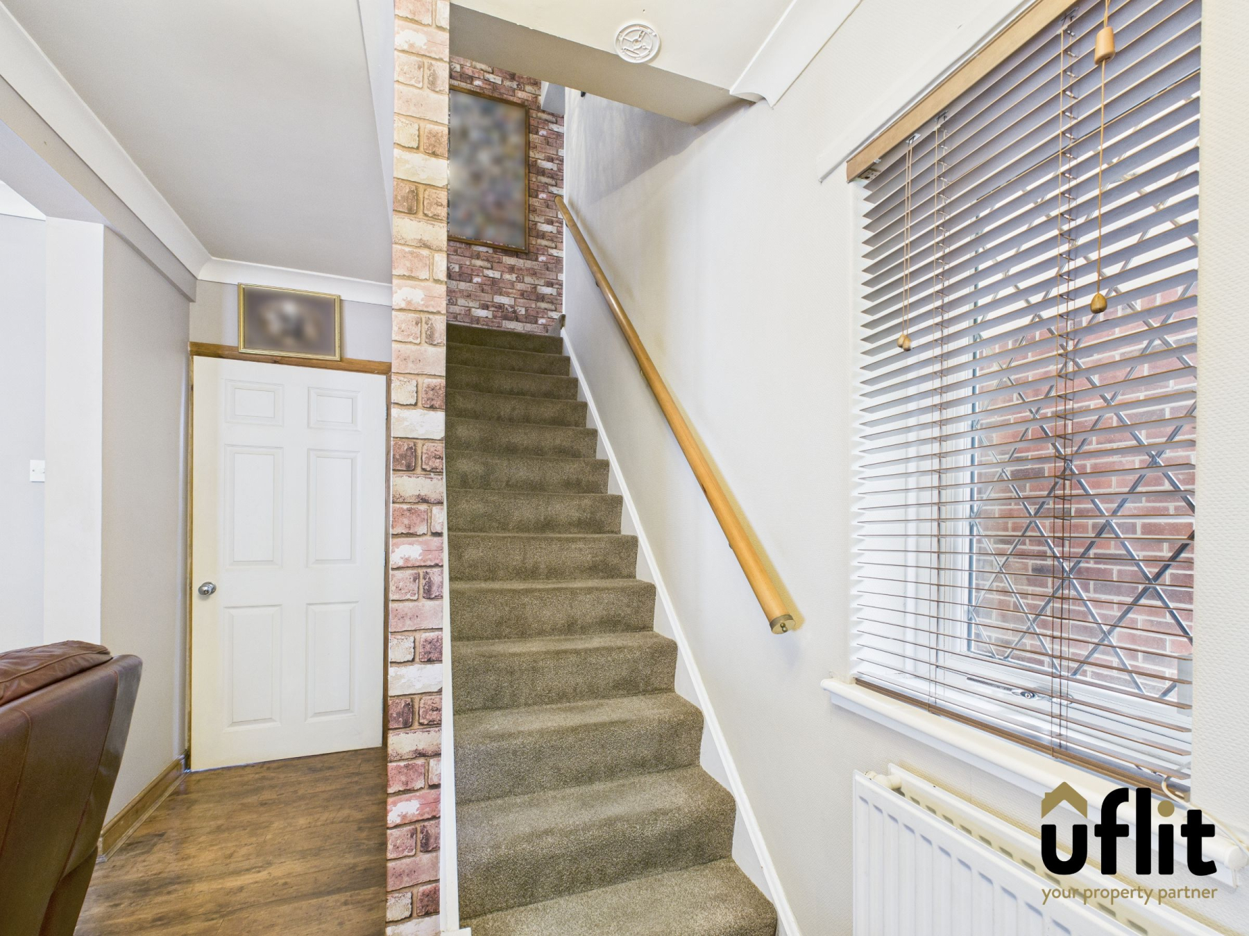 The spacious lounge is both stylish and inviting, featuring a large bay window and additional side window that fill the room with light. Laminate flooring complements the décor and a feature electric fire creates a cosy focal point. Carpeted stairs lead to the first floor seamlessly blending practicality with charm.