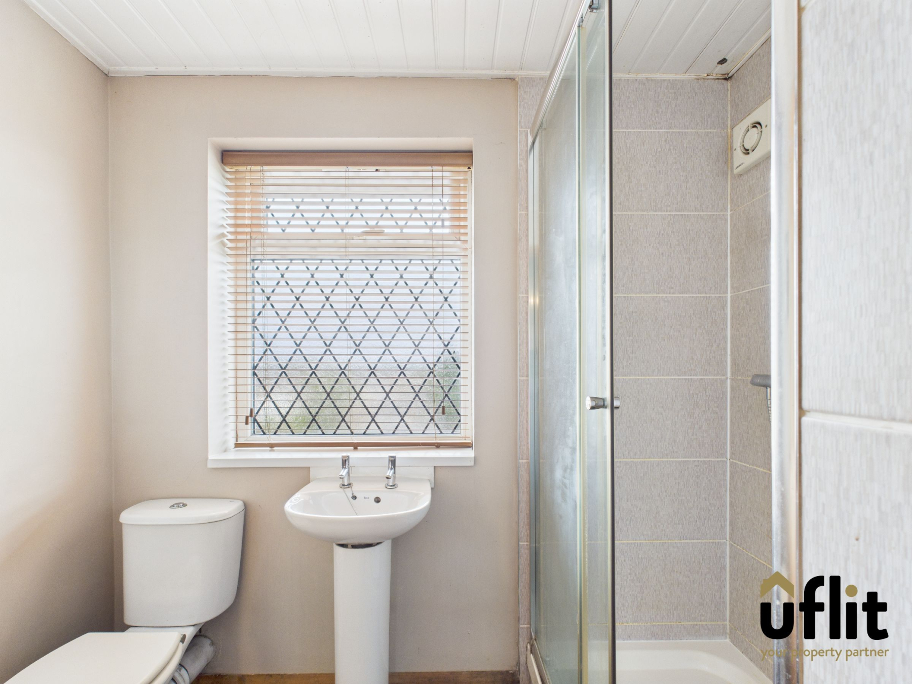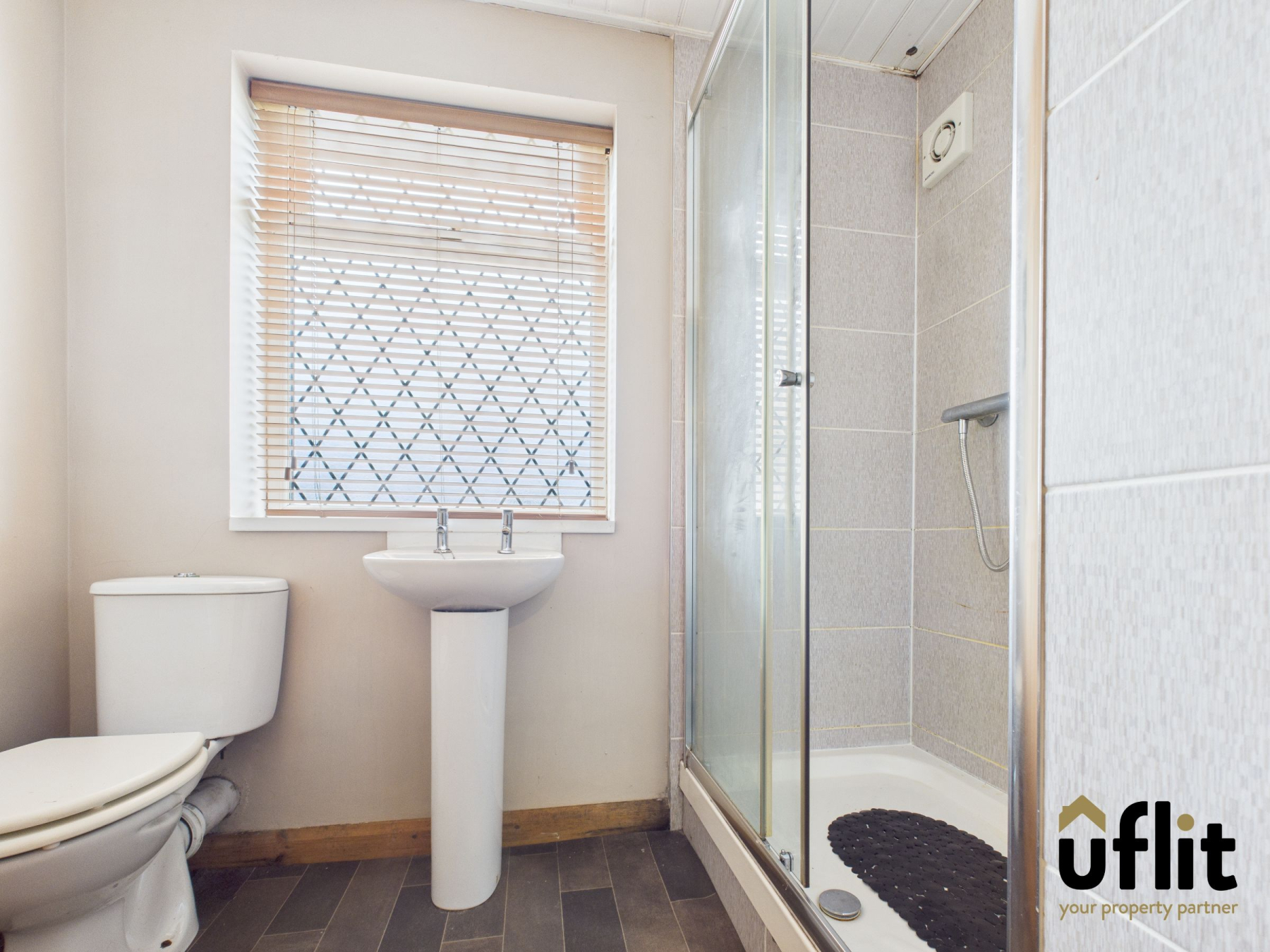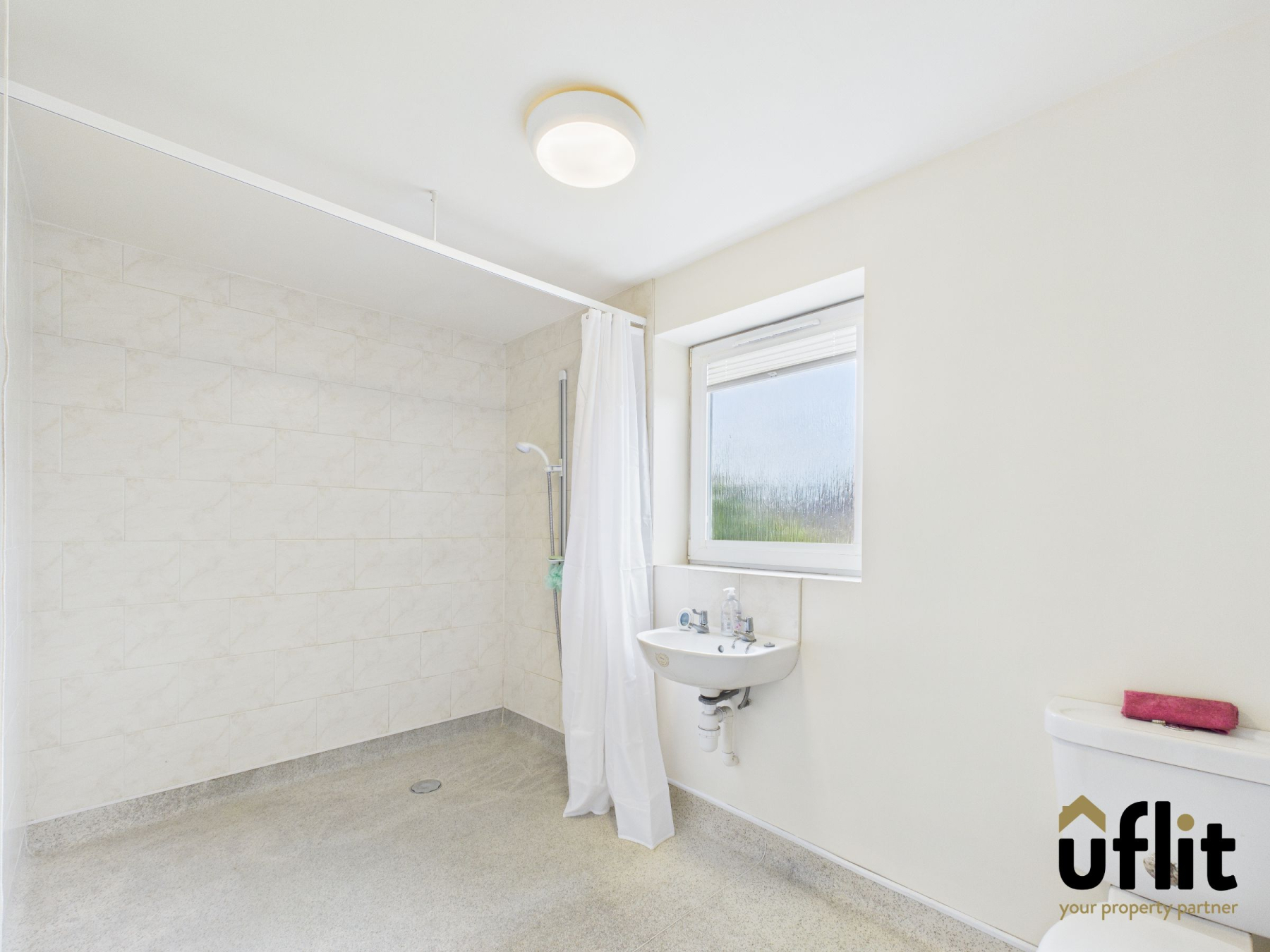 A spacious ground floor shower room featuring a large shower area with tiled surround, low-level WC, floating wash basin. A rear-facing window provides light and ventilation completing this stylish and functional space.