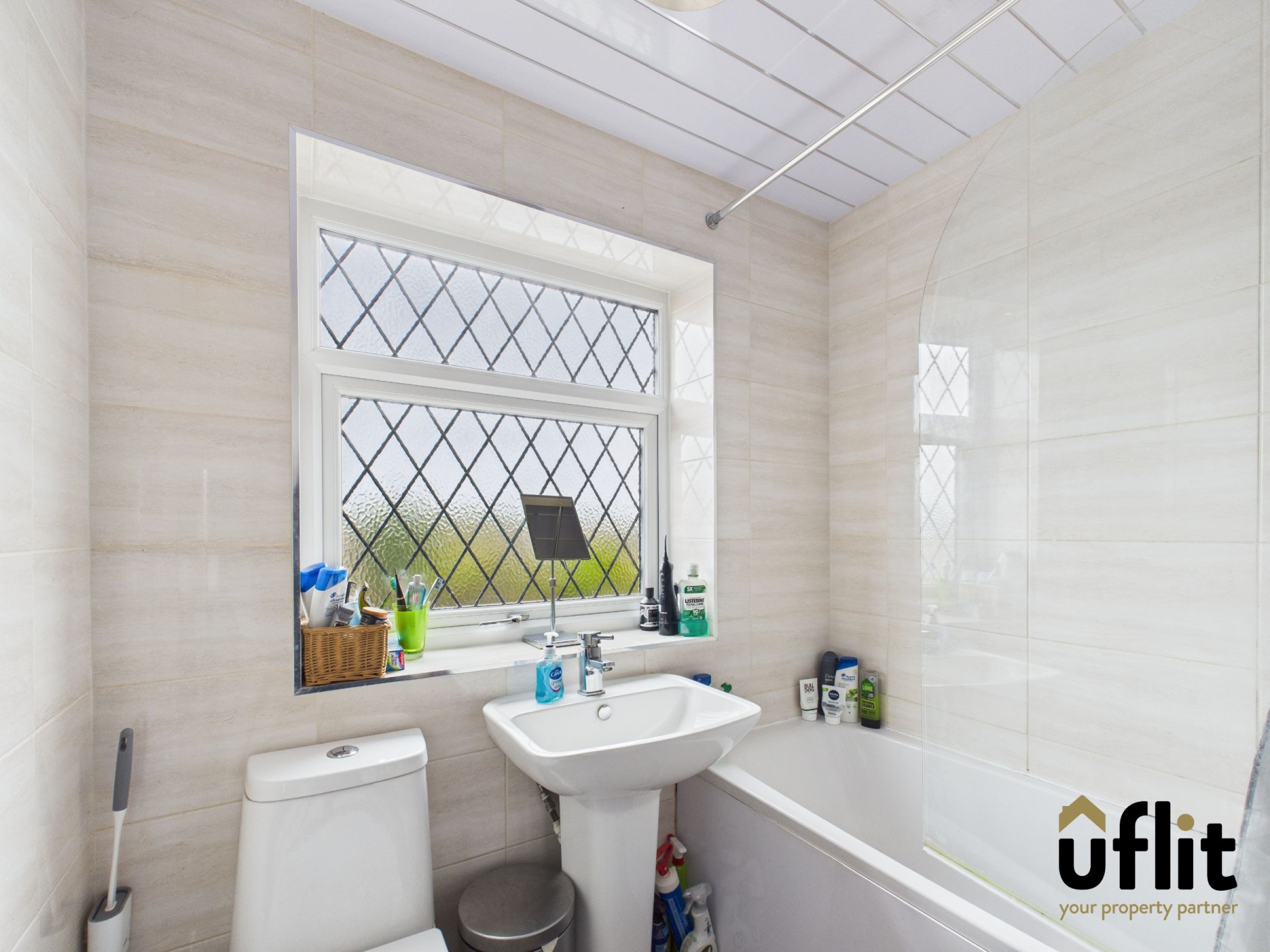 The well presented family bathroom features a full-sized bath with overhead shower and glass screen, floor-standing sink, low-level WC, heated towel rail, and vinyl flooring. A rear-facing window adds natural light to this bright and fresh space.