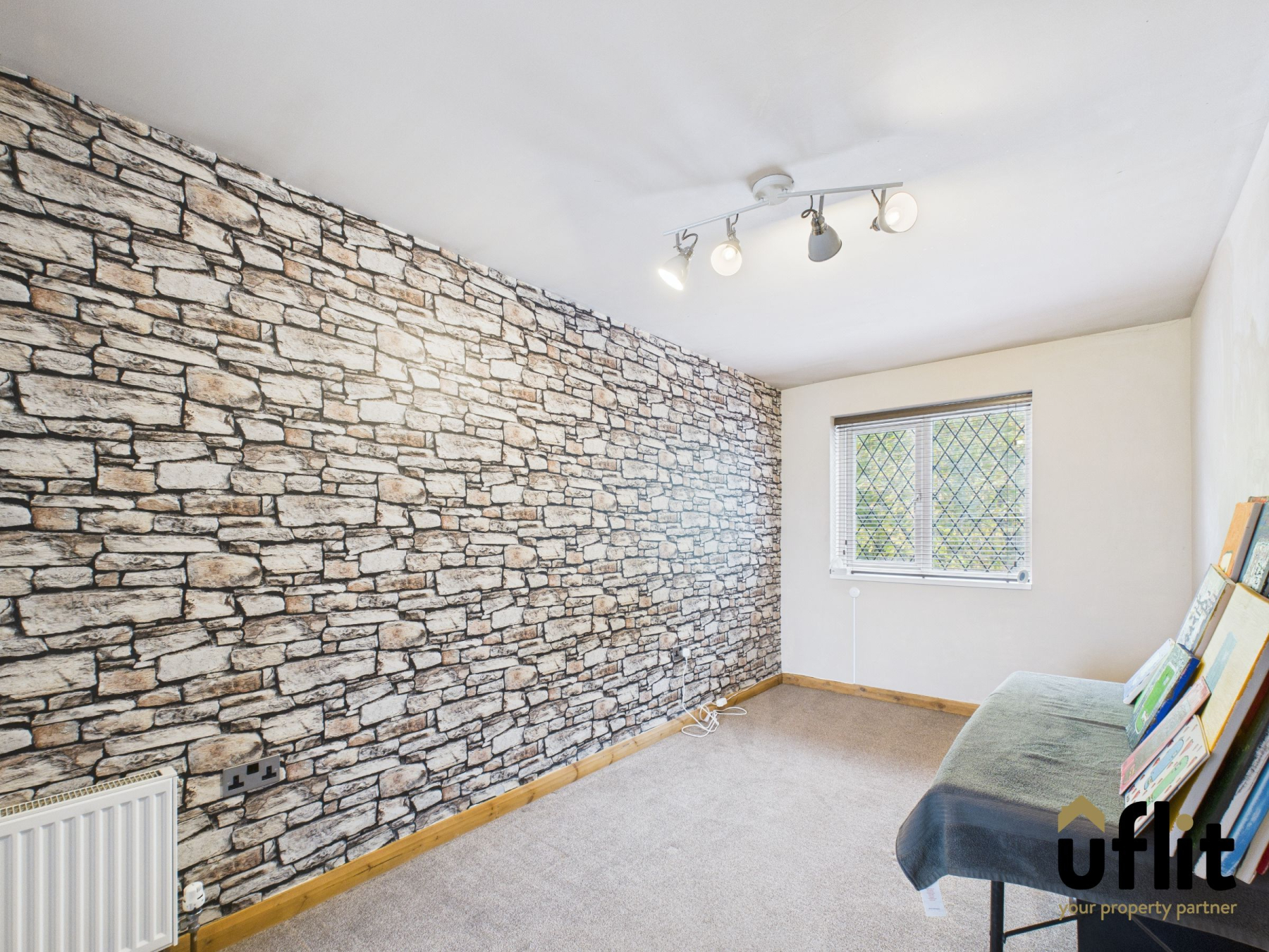 A comfortable single bedroom located to the front of the property with a front-facing window, laminate flooring, and radiator ideal as a nursery, child's room, or office space.