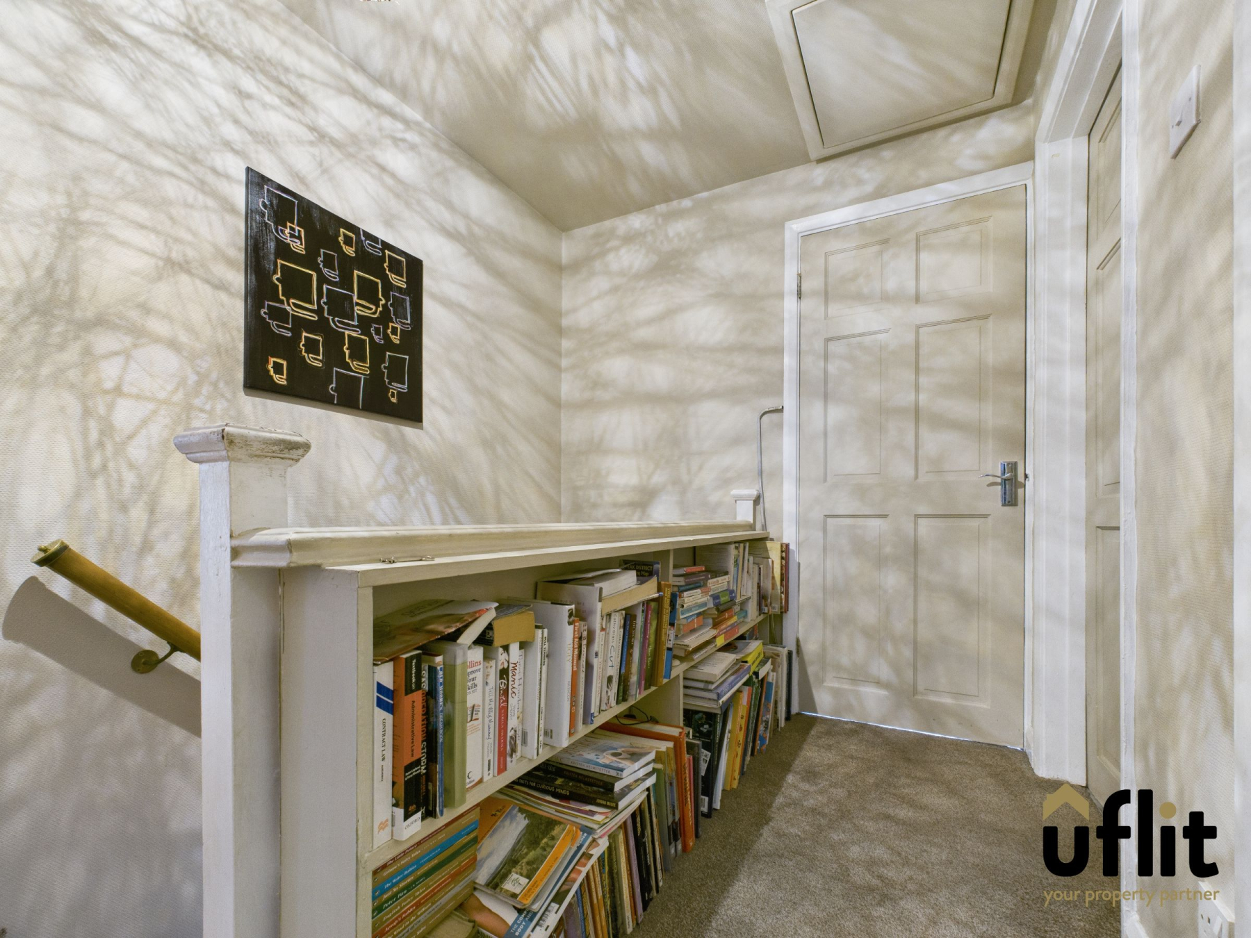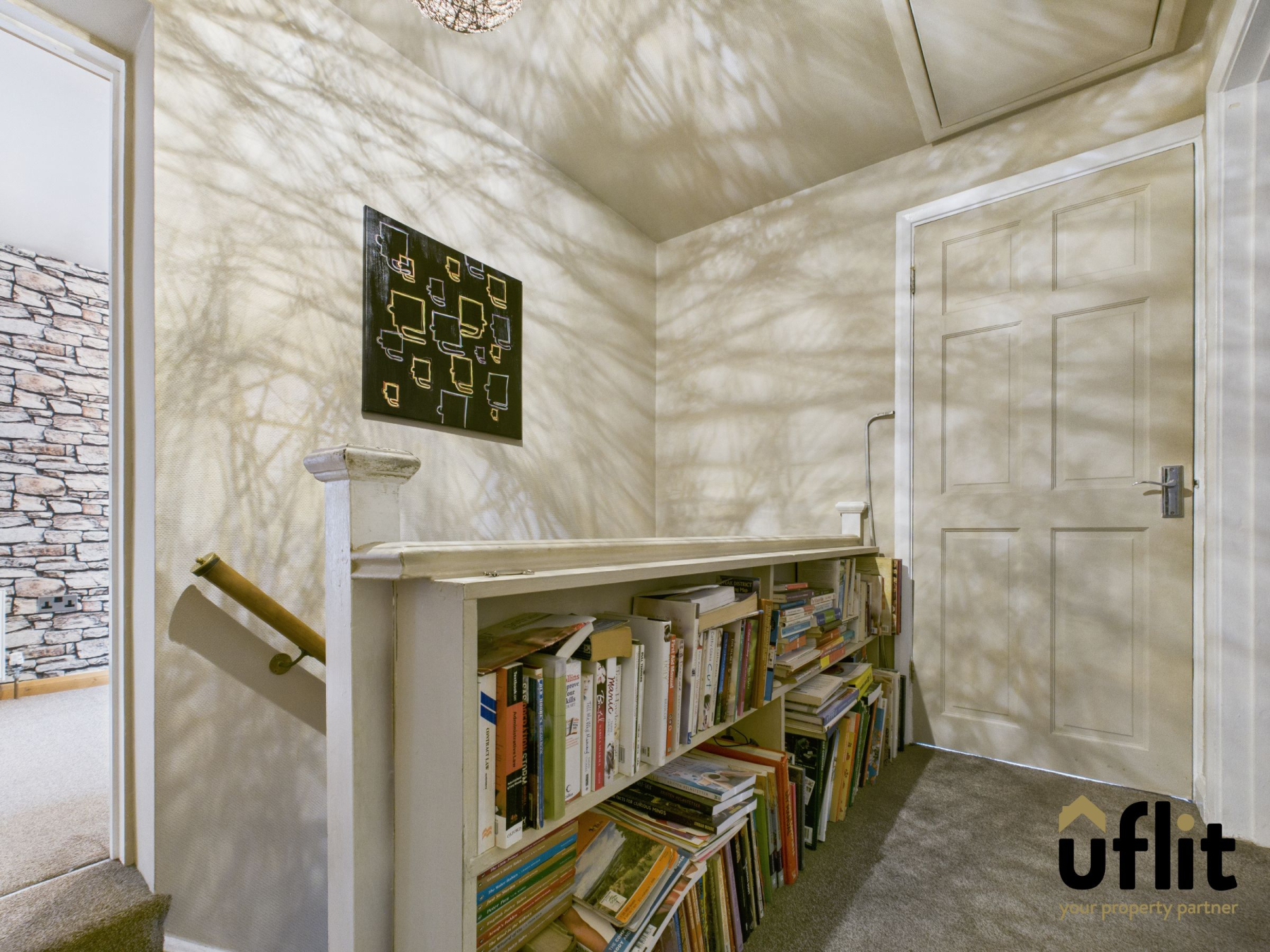 The carpeted landing provides access to the family bathroom and four further bedrooms with a bespoke fitted bookshelf adding both character and practicality.