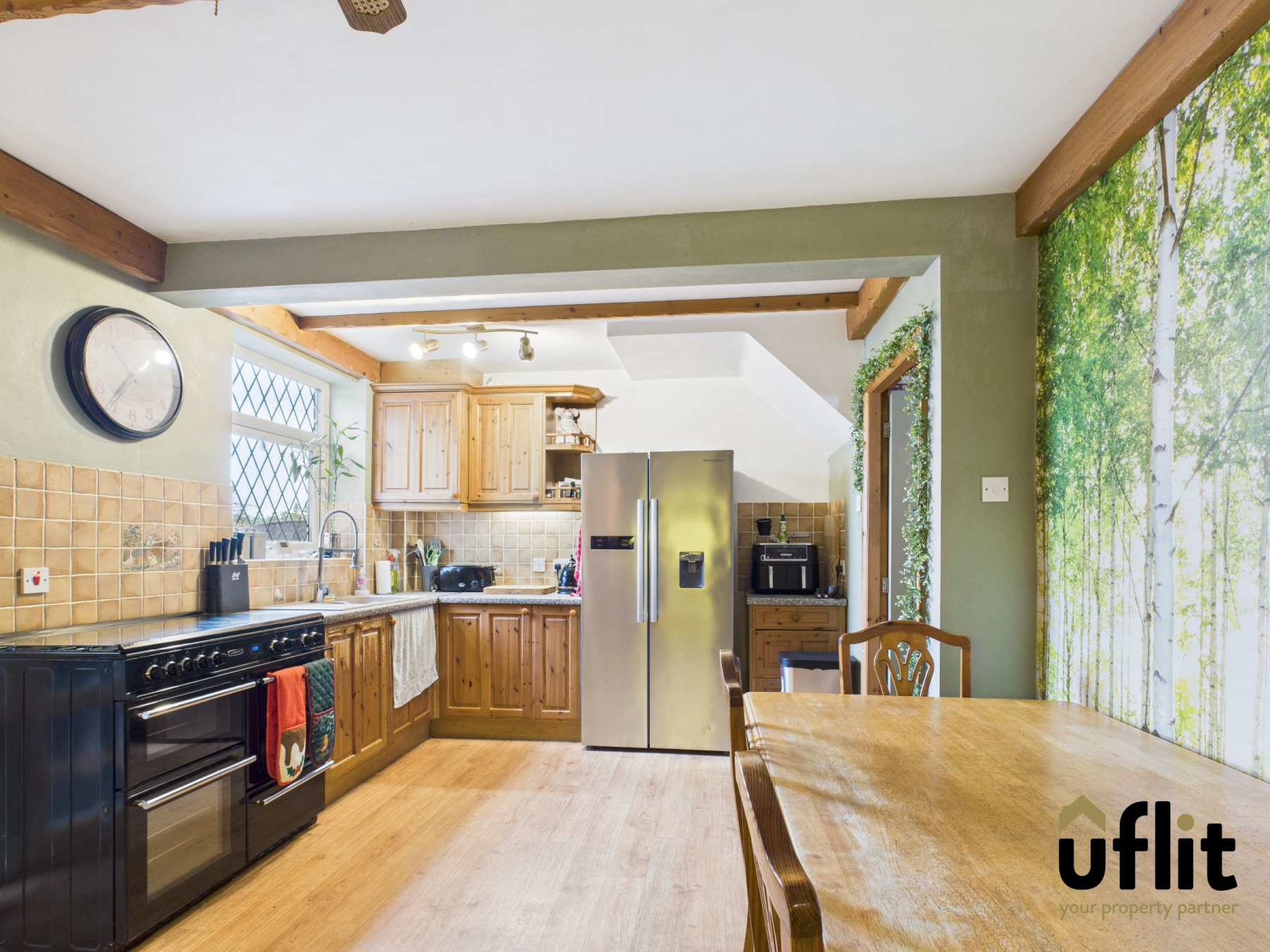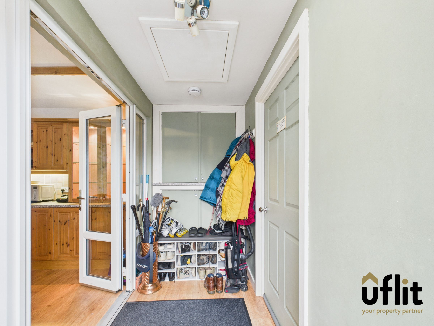 Accessed via a composite door with glazed side panel to a welcoming entrance hall with laminate flooring, a radiator, ample storage cupboard and a Velux ceiling window floods the space with natural light. French doors open into the kitchen/diner while an additional door leads to bedroom five offering a flexible layout ideal for family life.